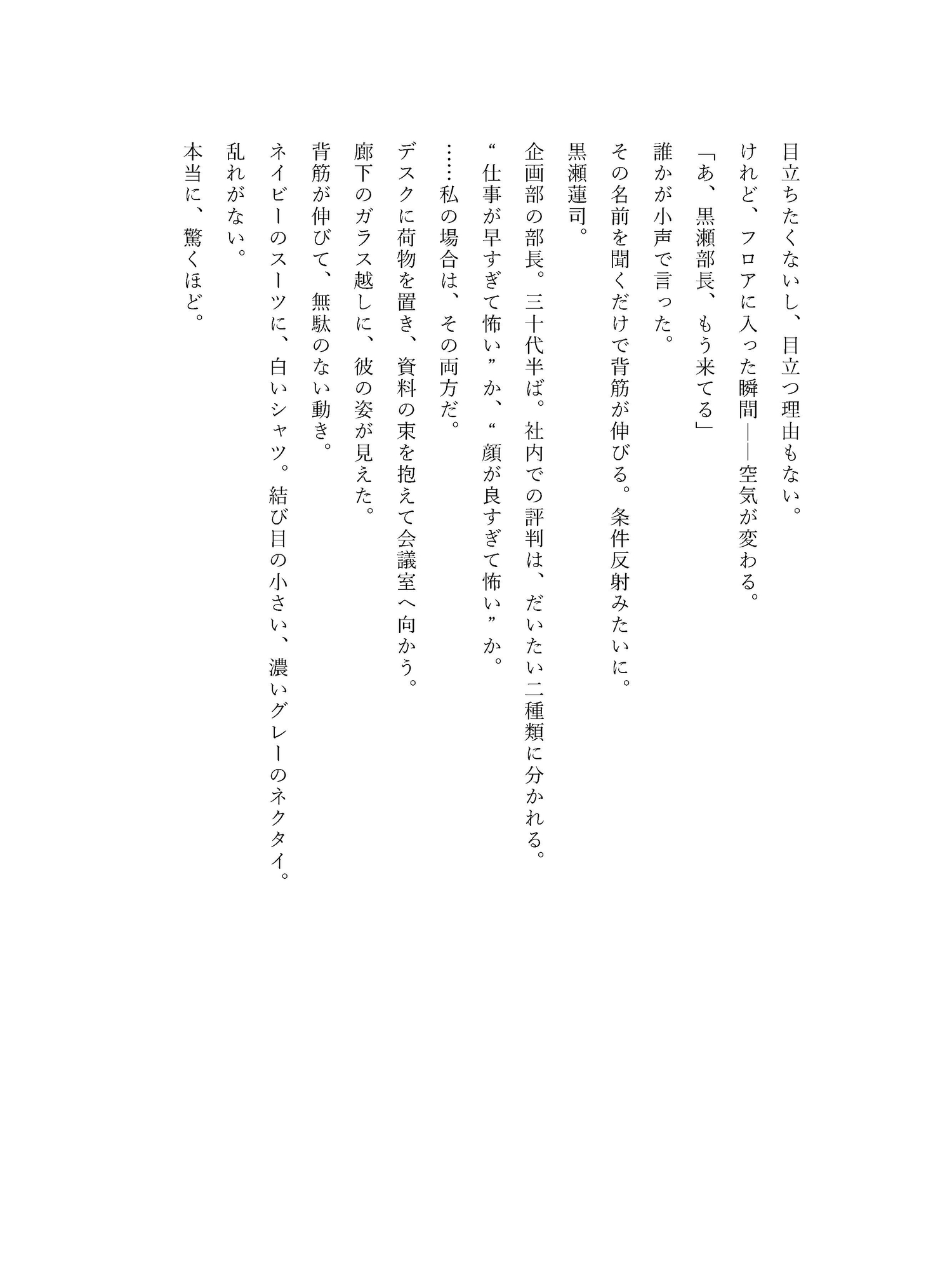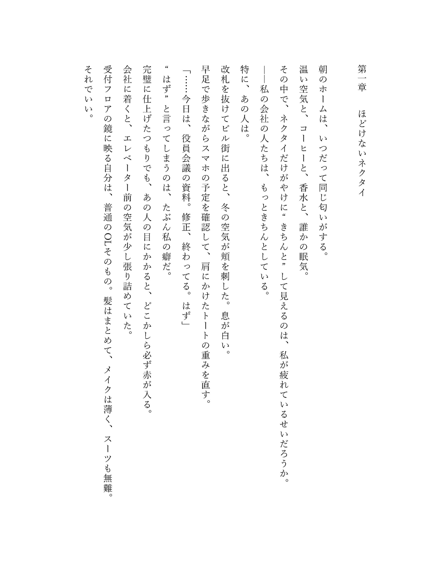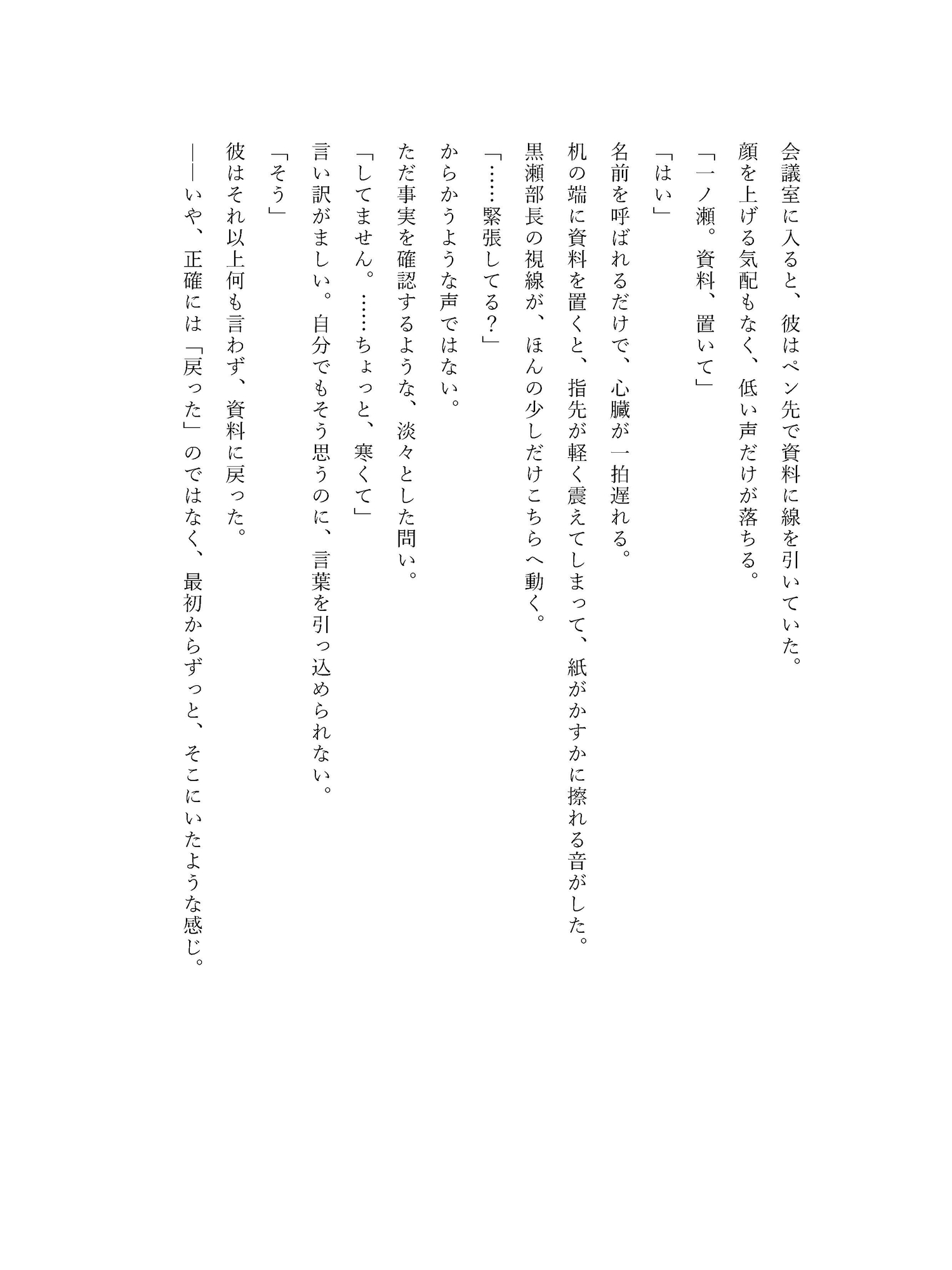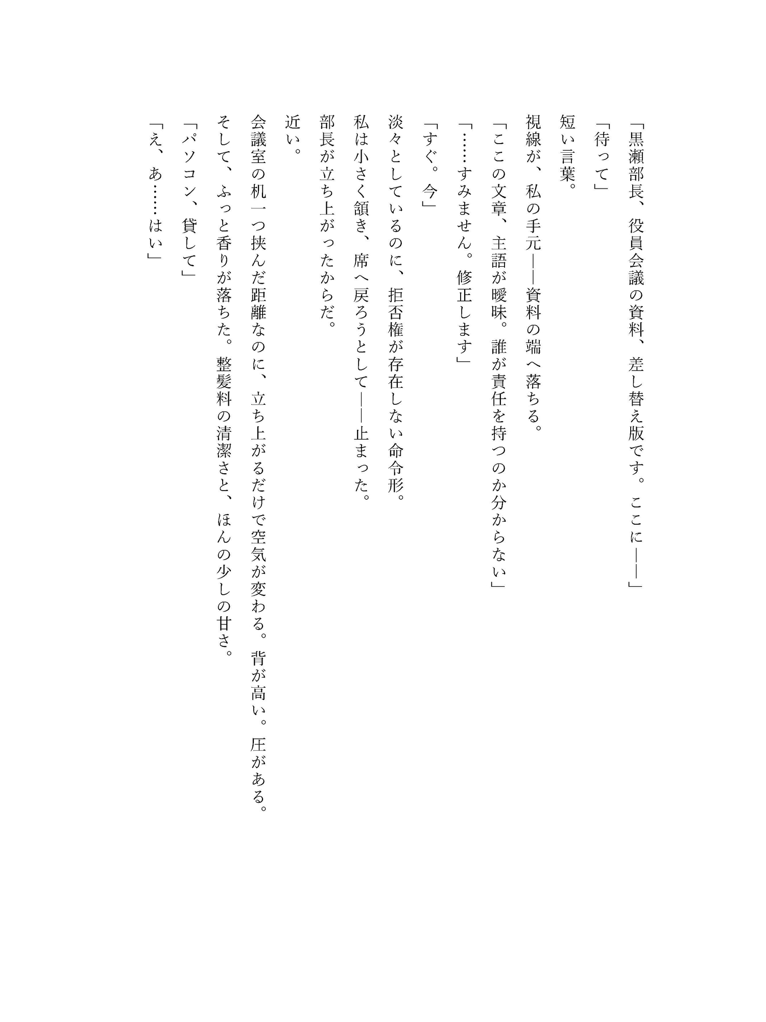 完璧な上司は、私の前でだけネクタイを外す。 仕事中は冷静で、感情を一切表に出さない彼が、 二人きりになると指先で私を捕まえる。 「これは、仕事じゃない」 ネクタイを解く仕草も、 低くなる声も、 私を見下ろす視線も—— 全部、私だけのもの。