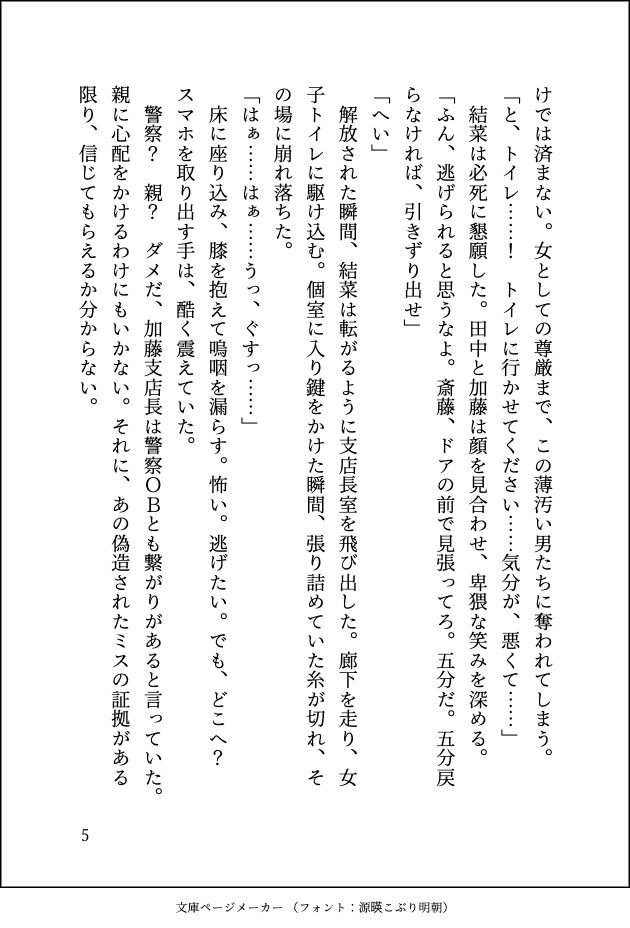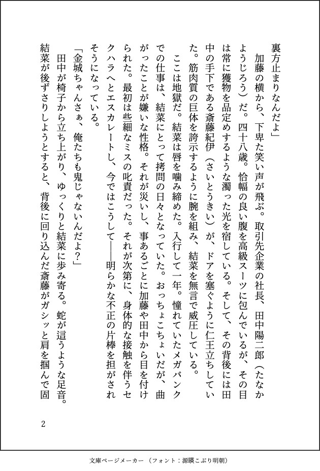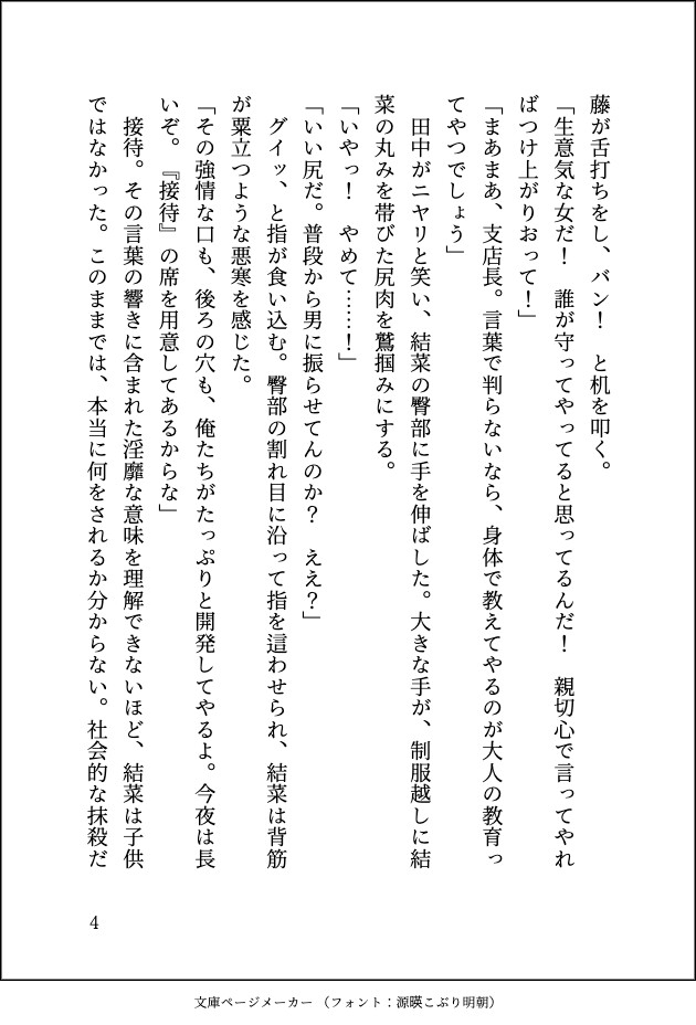 ■ 金城 結菜(きんじょう ゆいな) 支店の庶務係。おっちょこちょいだが真面目な性格が災いし、上司のパワハラ・セクハラの標的にされていた。 神一に救出された後、彼の「教育」によって眠っていたマゾヒズムが開花。 羞恥心と快楽の狭間で揺れ動きながらも、彼に管理されることに至上の喜びを感じるようになり、次第に雌の顔へと堕ちていく。