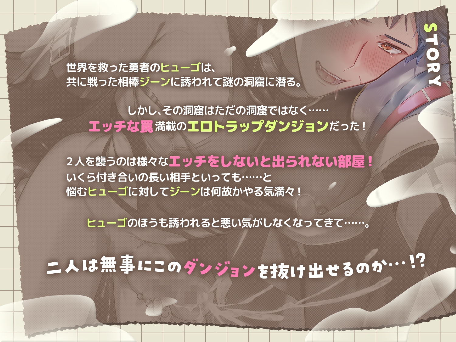 世界を救った勇者のヒューゴは、共に戦った相棒ジーンに誘われて謎の洞窟に潜る。 しかし、その洞窟はただの洞窟ではなく……エッチな罠満載のエロトラップダンジョンだった! 2人を襲うのは様々なエッチをしないと出られない部屋! いくら付き合いの長い相手といっても……と悩むヒューゴに対してジーンは何故かやる気満々! ヒューゴのほうも誘われると悪い気がしなくなってきて……。 二人は無事にこのダンジョンを抜け出せるのか……!?