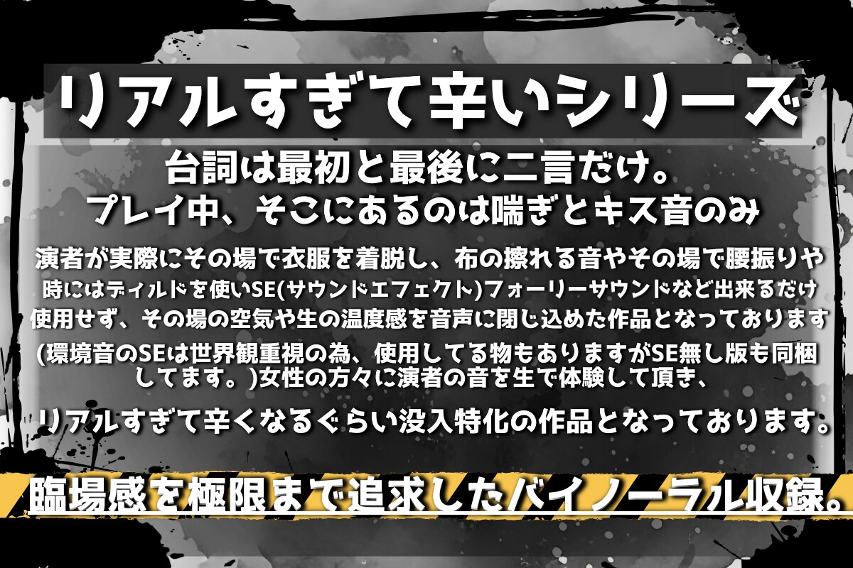 【⚠︎高身長入れ墨いっぱいの極道さんに犯されます】【リアツラCV:早緑凪】|||リアル過ぎて辛い第四章#8|||リアルすぎて辛いとは?——台詞は最初と最後に二言だけ——、プレイ中、そこにあるのは喘ぎとキス音のみ、臨場感を極限まで追求したバイノーラル収録。喘ぎや水音を聴きたい人にオススメです。【軽いあらすじ】仕事に来たあなたを待っていたのは見るからに入れ墨がいっぱい入った怖いお兄さんに笑顔で出迎えられます…が…