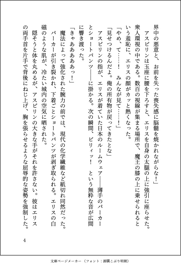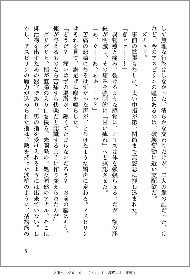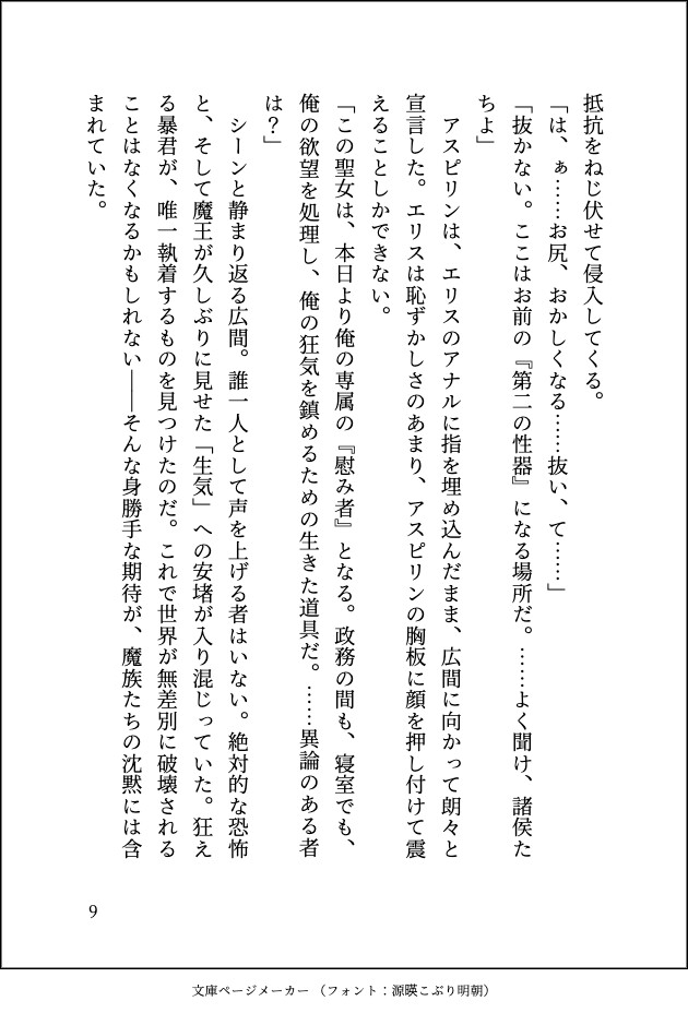 ★【徹底的な排泄管理とアナル開発】 「洗浄だ。俺の種を受け入れる前に、中を空っぽにしておかないとな」 冷徹なメイドによる連日の浣腸、大量の薬液注入、そして限界つなぎ止め。 排泄器官としての尊厳を破壊され、「出す」行為すらも魔王の許可制に。 聖なる穴が、魔王様専用の淫らな愛の巣へと変貌していく過程を丹念に描写。