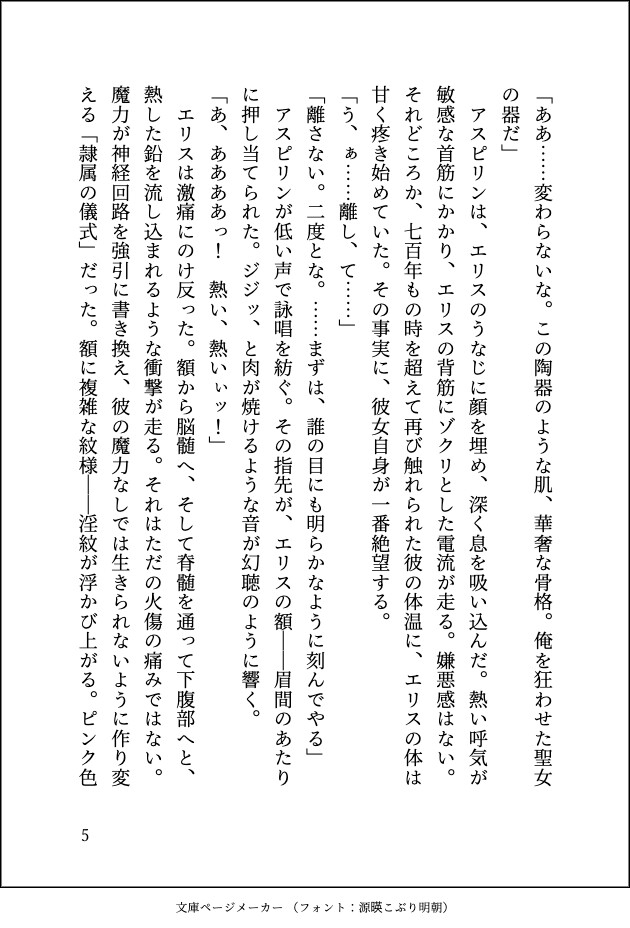 再召喚後、アスピリンによって「淫紋」を刻まれ、彼の魔力なしでは生きられない身体に作り変えられる。