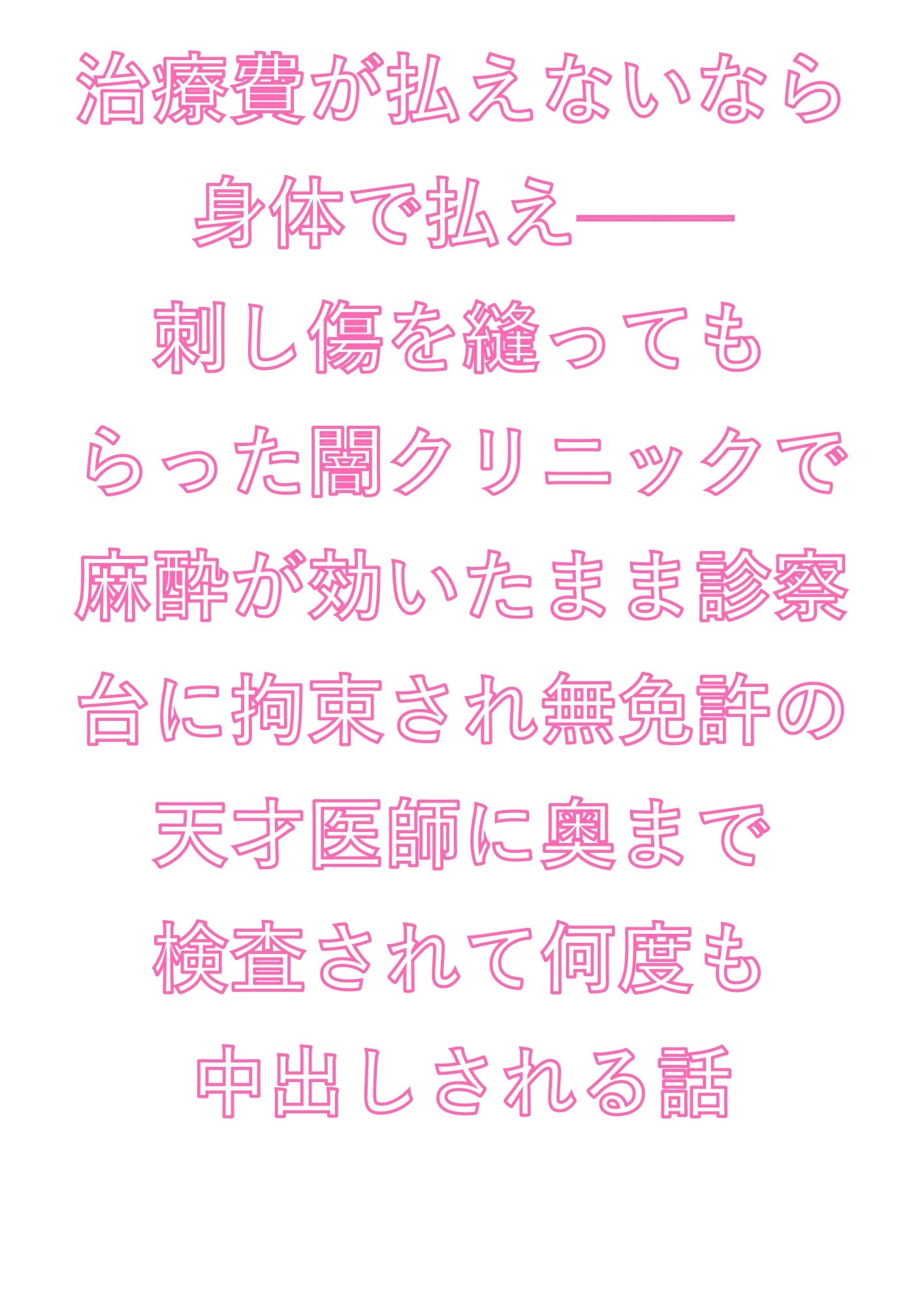 「治療費が払えないなら身体で払え——刺し傷を縫ってもらった闇クリニックで麻酔が効いたまま診察台に拘束され無免許の天才医師に奥まで検査されて何度も中出しされる話」のFANZA価格データはありません