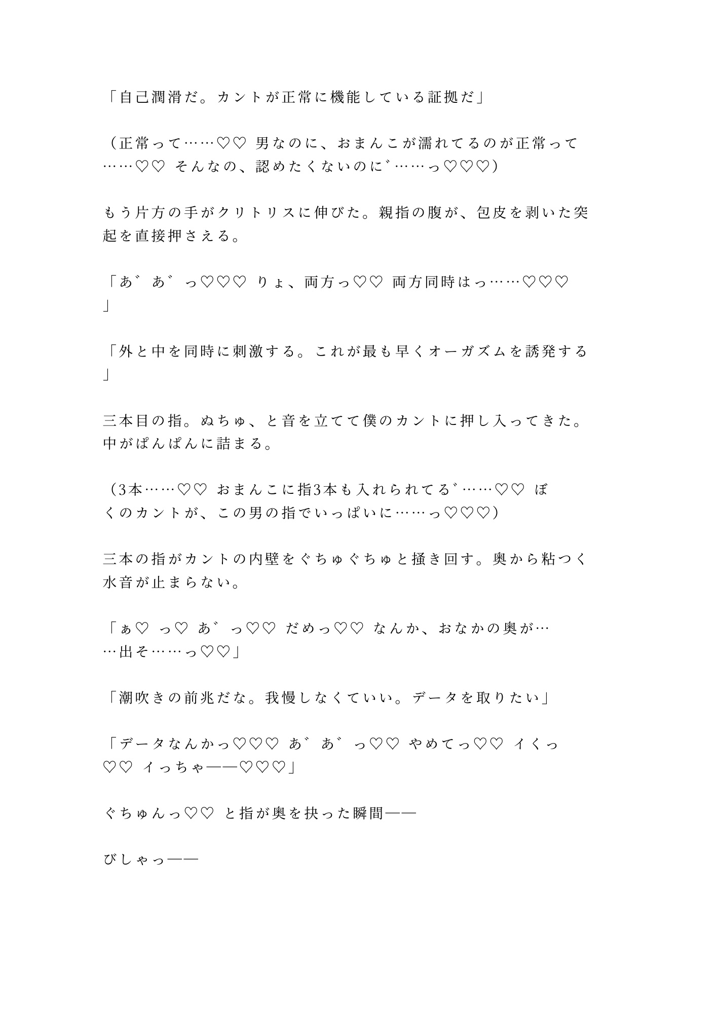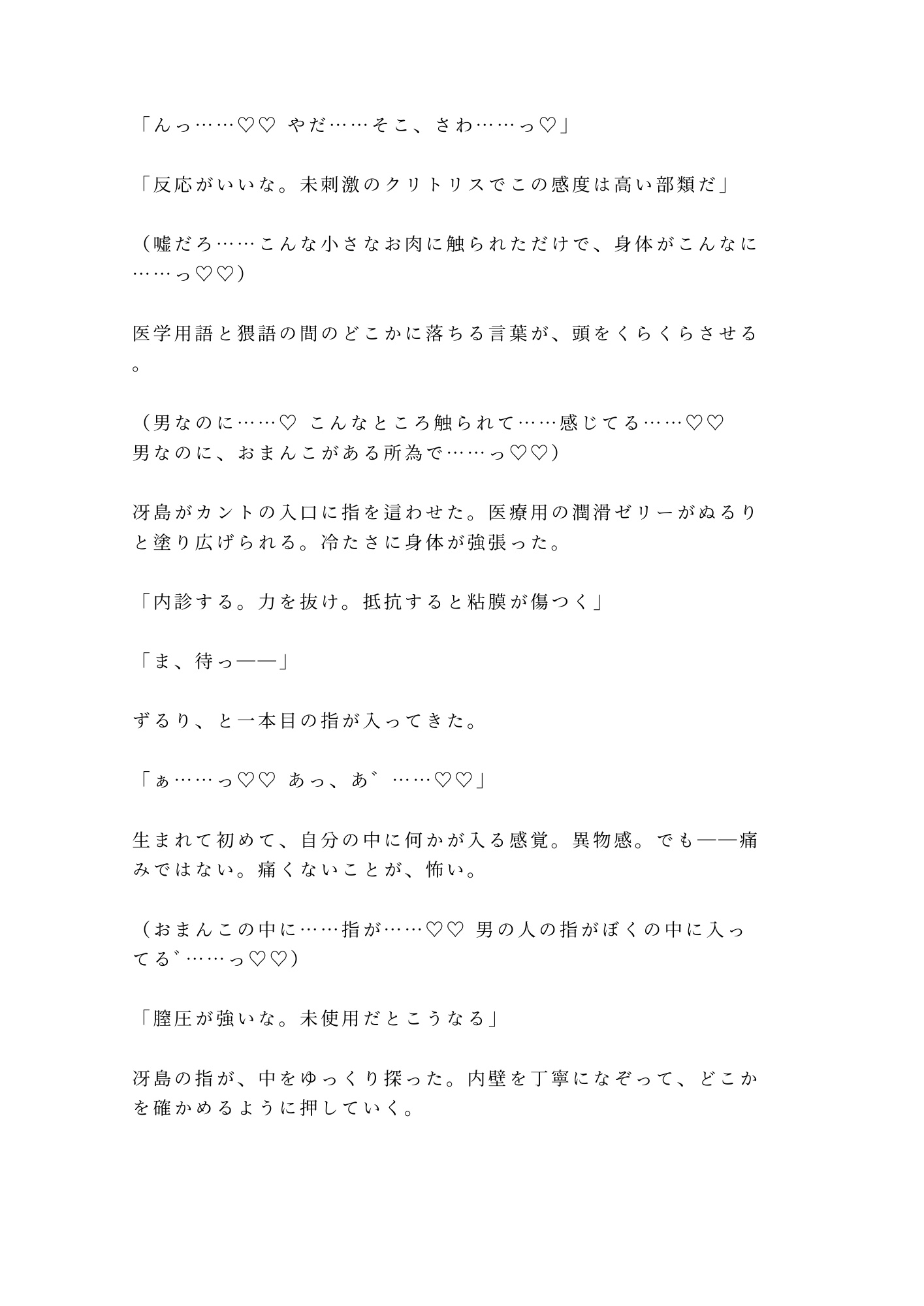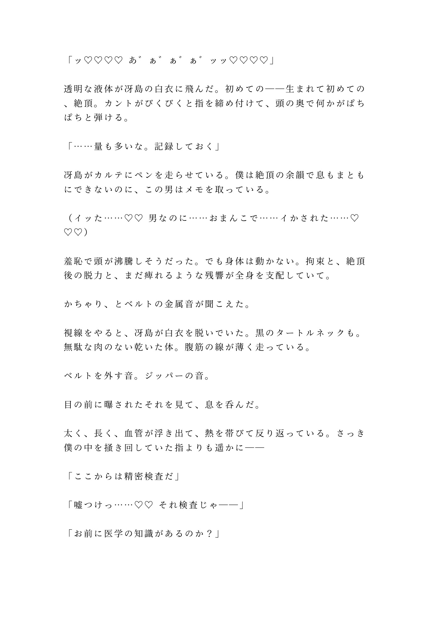 冴島の指は医学的に正確で、だからこそ残酷なほど的確に快楽を引き出す。診察の所作で身体の奥を探り、カルテに記録を取りながら、淡々と絶頂へ追い詰めていく。犯されているのに「検査」と呼ばれる倒錯。抵抗できない身体が裏切るように感じてしまう屈辱。「合理的な判断をしろ」——感情のない声がそう囁く。