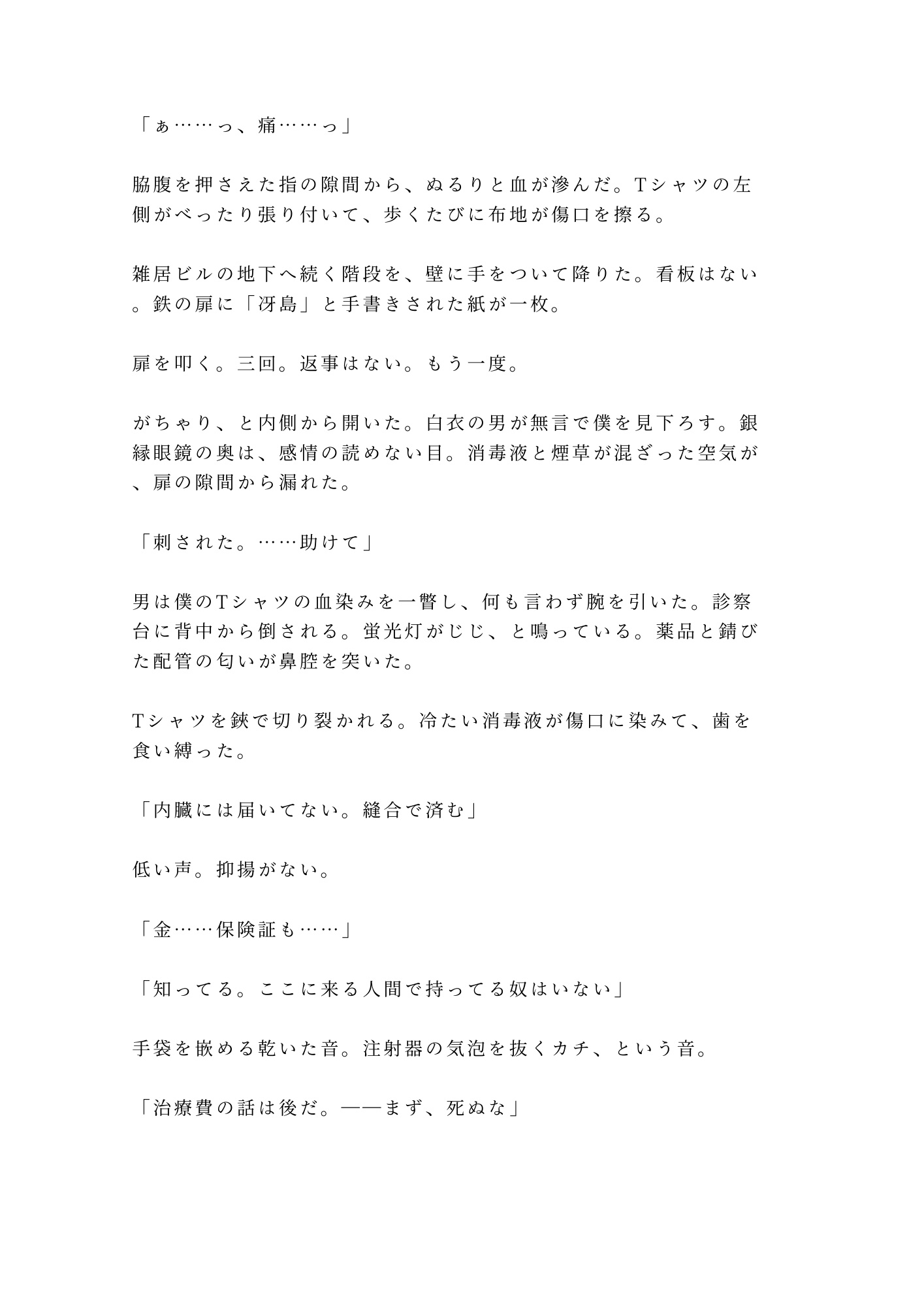 無免許の元外科医・冴島——感情を持たない天才の手は、刺し傷を縫う時も、患者の身体を暴く時も、一切の迷いがない。