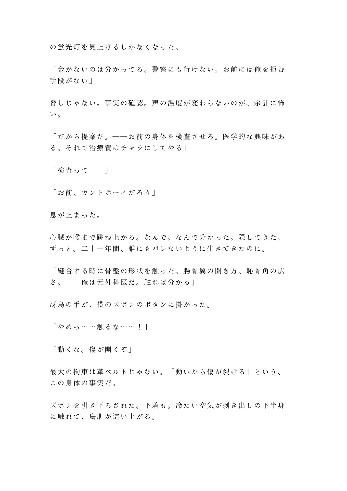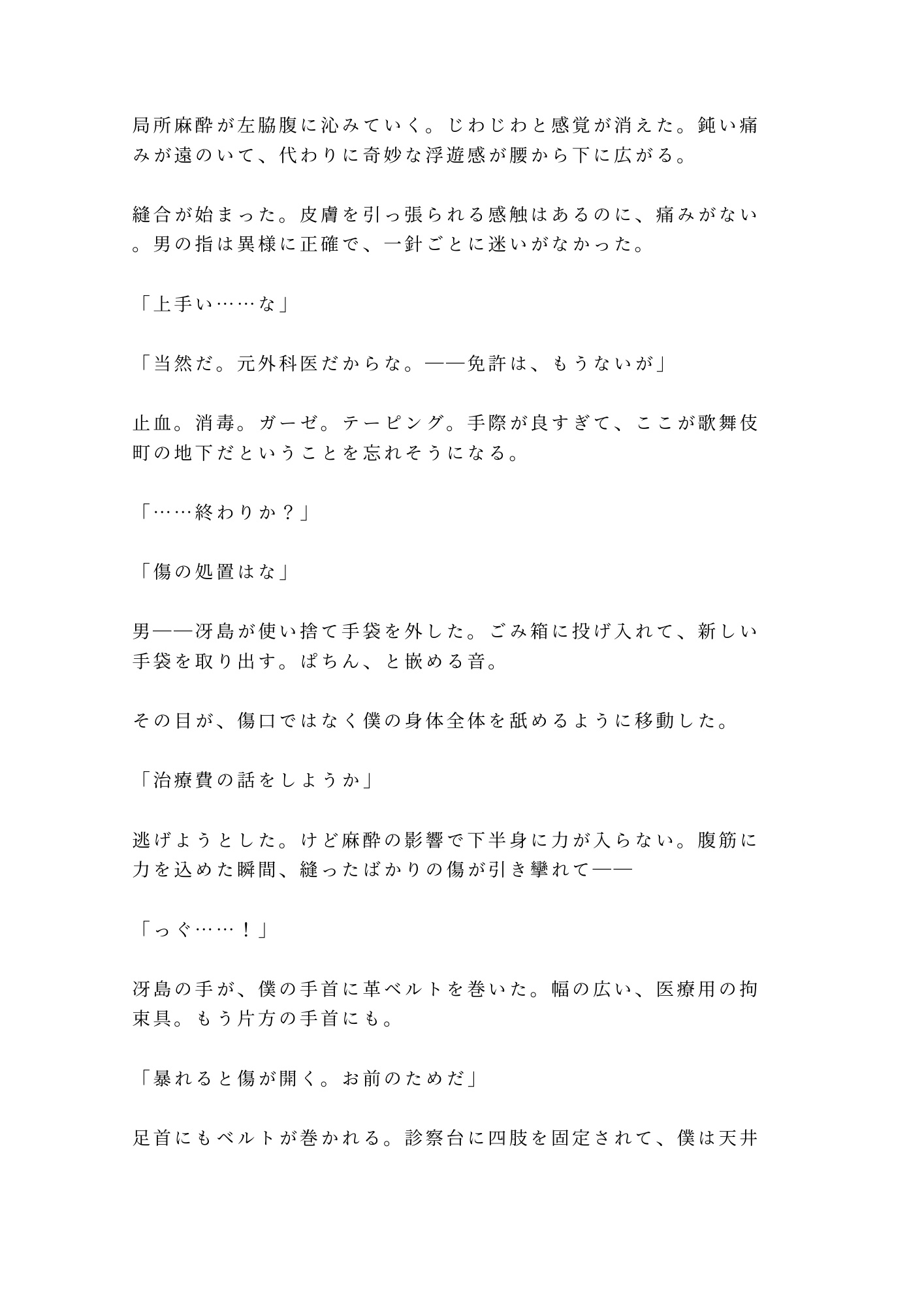 局所麻酔で下半身の自由を奪われたまま、革ベルトで四肢を拘束される。痛みだけが消えて、快感の神経はすべて生きている。逃げようとすれば縫合した傷が裂ける——「動けない」のではなく「動いてはいけない」。その絶対的な支配構造の中で、二十一年間隠し通してきた秘密が、ペンライトの光の下に暴かれていく。