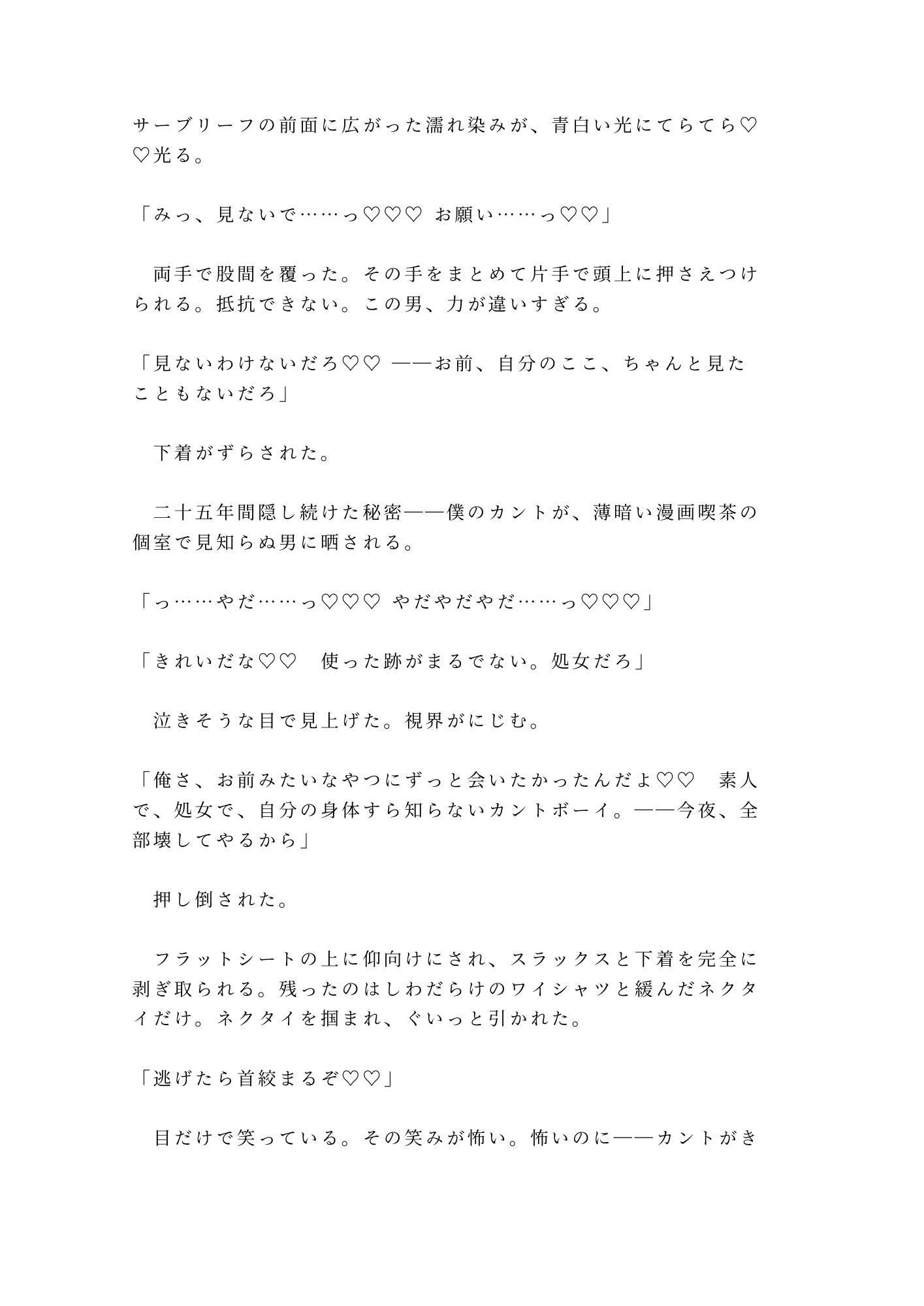 深夜の漫画喫茶で、壁越しに聞こえた男の自慰音に思わずカントを濡らしてしまった僕。「聞いてただろ?」——据わった目の男に秘密を暴かれ、二十五年守り抜いた処女カントが蹂躙される。逃げられない個室、ネクタイで繋がれた首、五回の中出し。朝、精液を溢しながら乗った電車で届いた通知。「また来い」——僕の位置情報は、もうあの男に握られている。