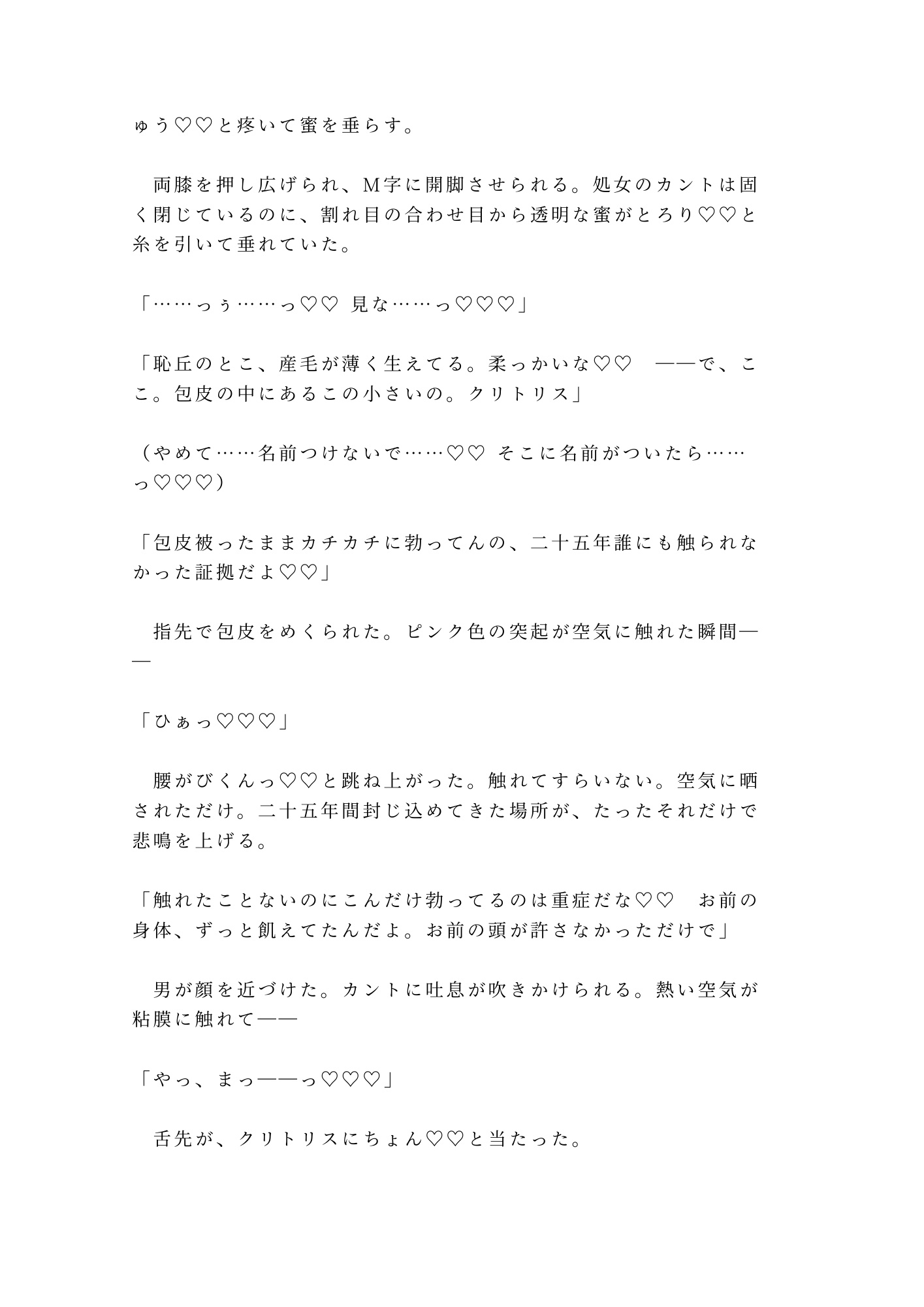 三白眼の据わった男は、処女のカントボーイを前にして歓喜した。触れたことすらなかった場所を舌で暴かれ、指で拓かれ、初めてのアクメで意識が飛ぶ。けれどそれは始まりに過ぎない。朝までに五回、奥の奥まで精を注がれ、理性の欠片もなく啼き狂わされる一夜の記録。