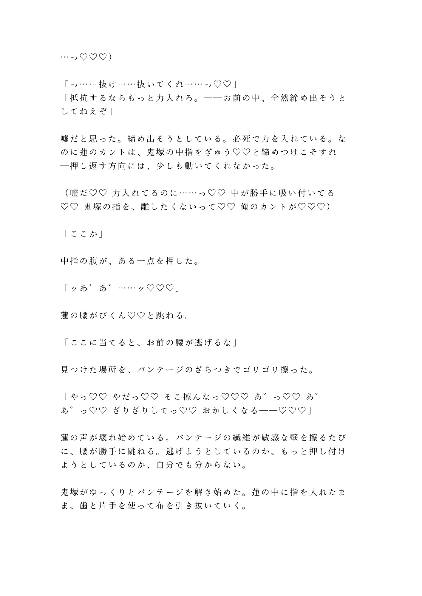 「俺は男だ」と叫ぶ喉から漏れるのは、甘い嬌声。抵抗する腕を縫い止める握力。逃げようとする腰が、勝手にグローブへ擦りつけられていく屈辱と快楽。「男だから何だ」と返す鬼塚の低い声が、蓮の最後の虚勢を砕く。