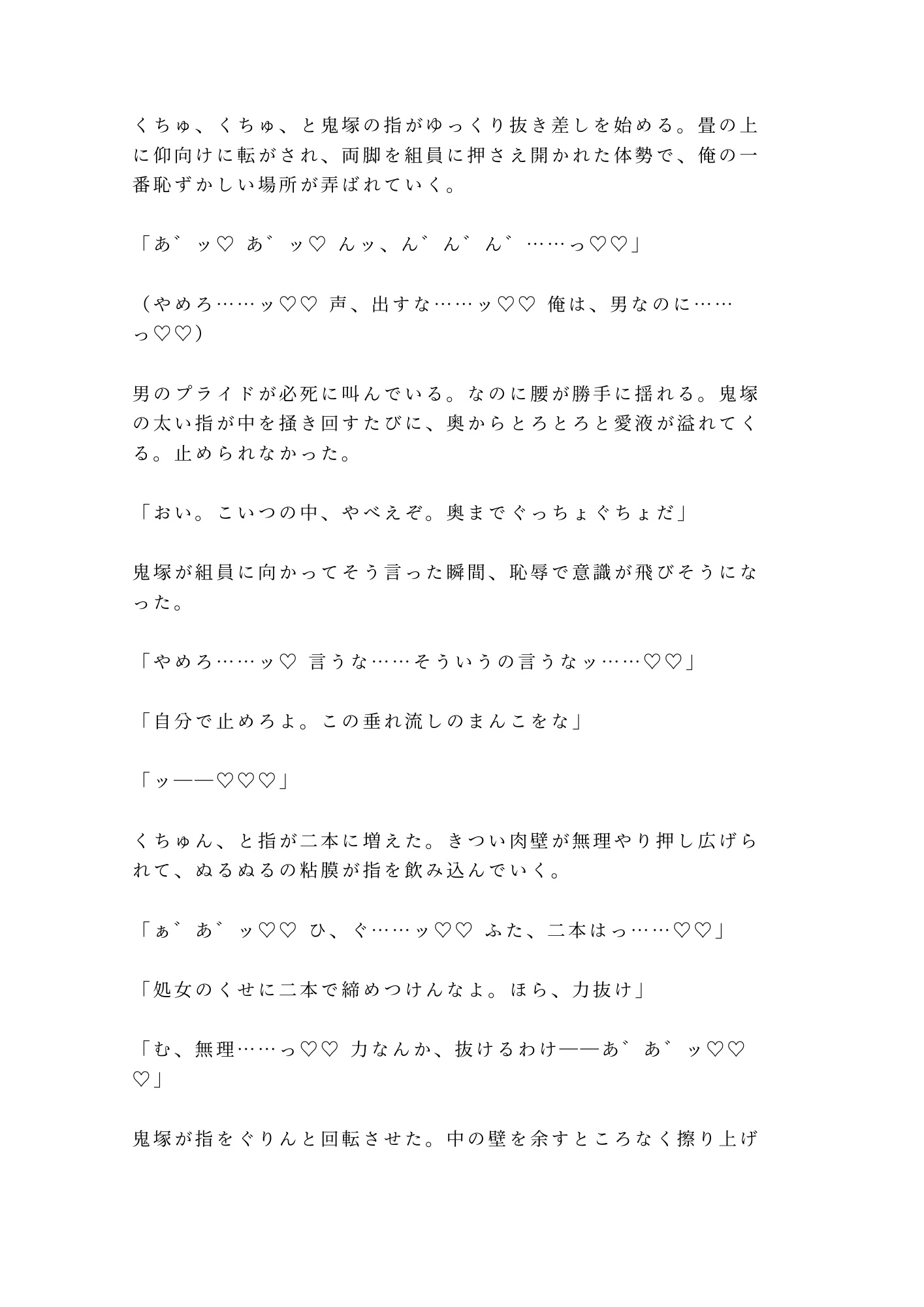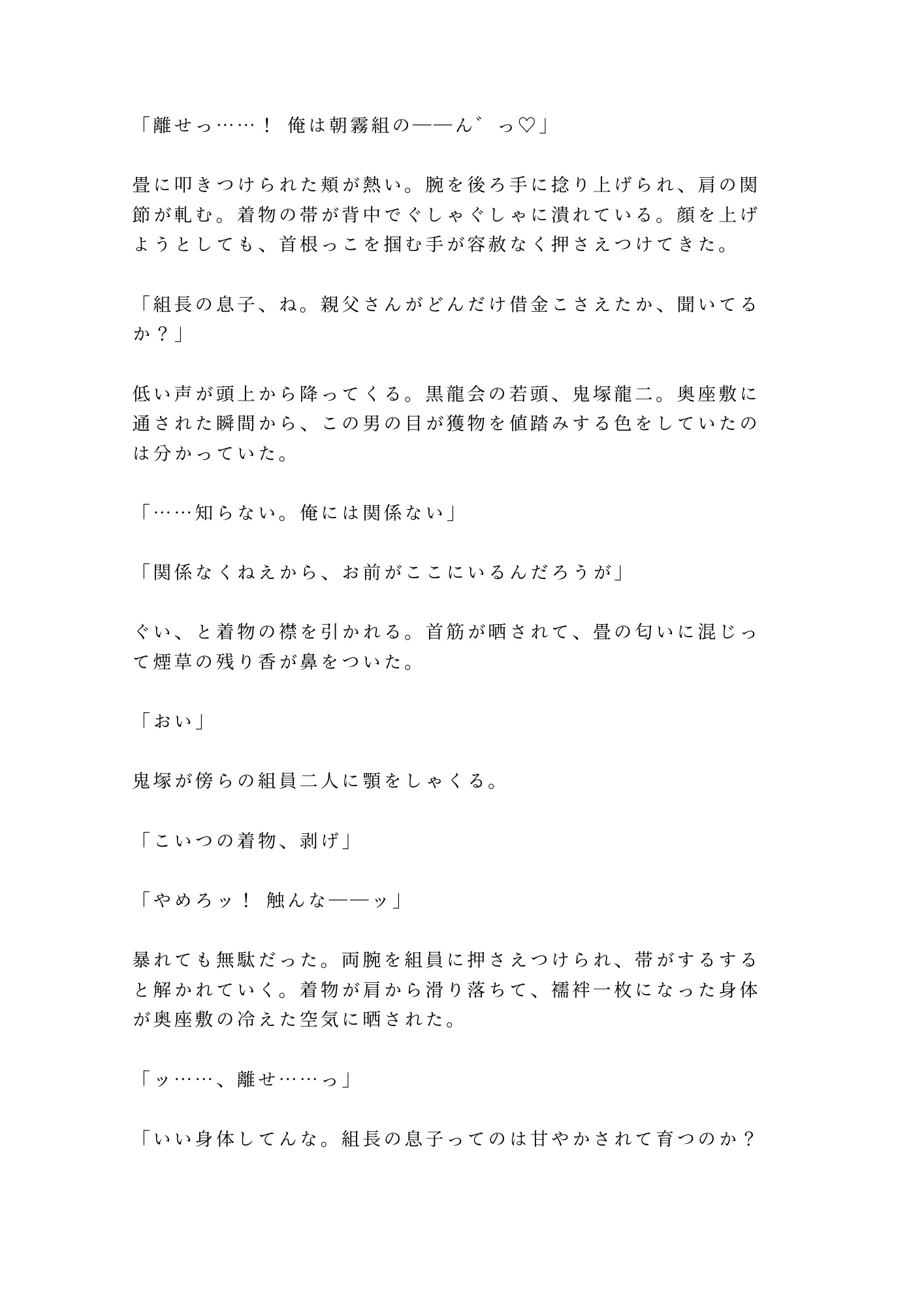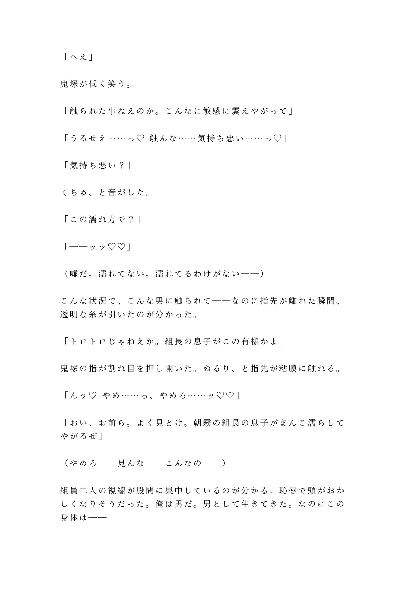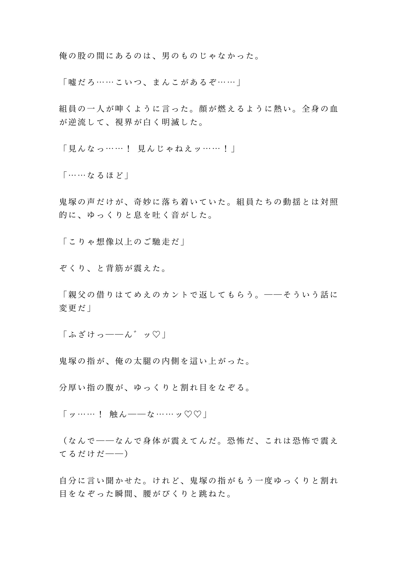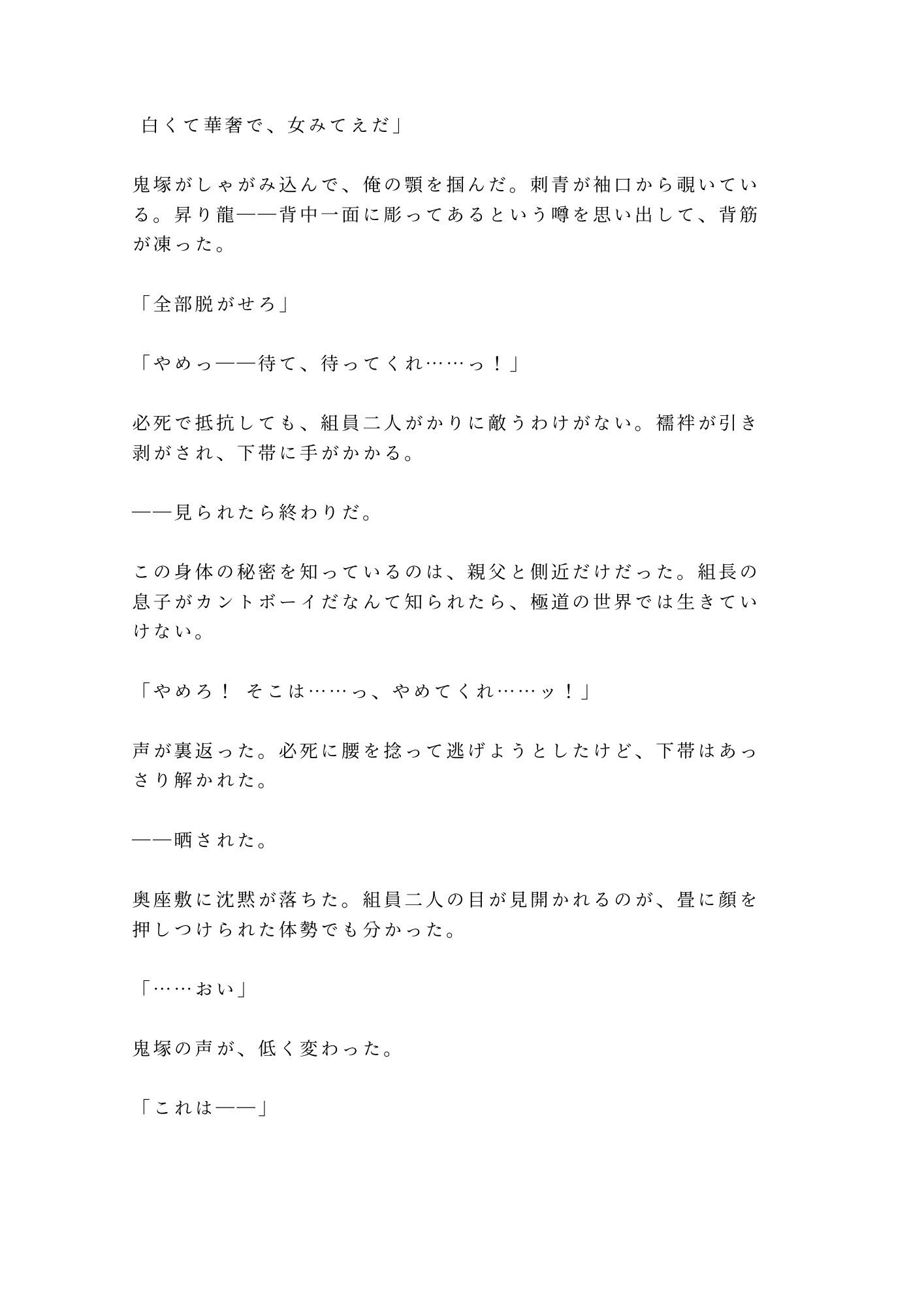 親父の借金のカタに黒龍会へ差し出された朝霧組の若。だが極道の世界で隠し通してきた秘密――股の間にあるカントを、若頭・鬼塚に暴かれてしまう。「親父の借りはてめえのカントで返してもらう」組員の目の前で処女を暴かれ、触れたこともない場所を開発され、抵抗する声はいつしか甘い嬌声に変わっていく。男のプライドと雌の本能が激突する、極道カントボーイ凌○譚。