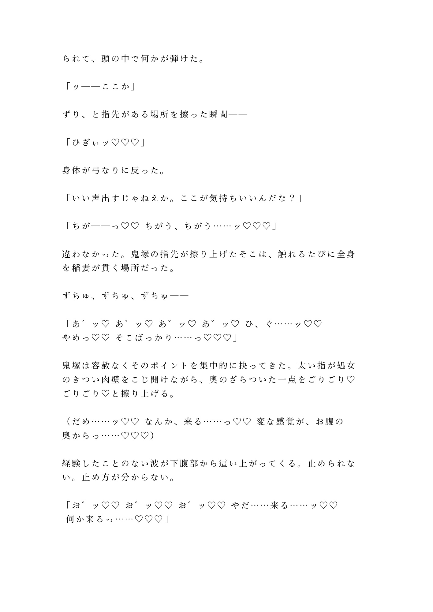 着物を剥がれ、組員たちの前でその秘密を暴かれる屈辱。触れられたことのない場所を、昇り龍の刺青を背負う若頭・鬼塚龍二の無骨な指に暴かれ、抗えない快楽に身体が裏切っていく。「見るな」と叫びながら、止まらない声。溢れる蜜。組員の目の前で迎えてしまう、生まれて初めての絶頂。