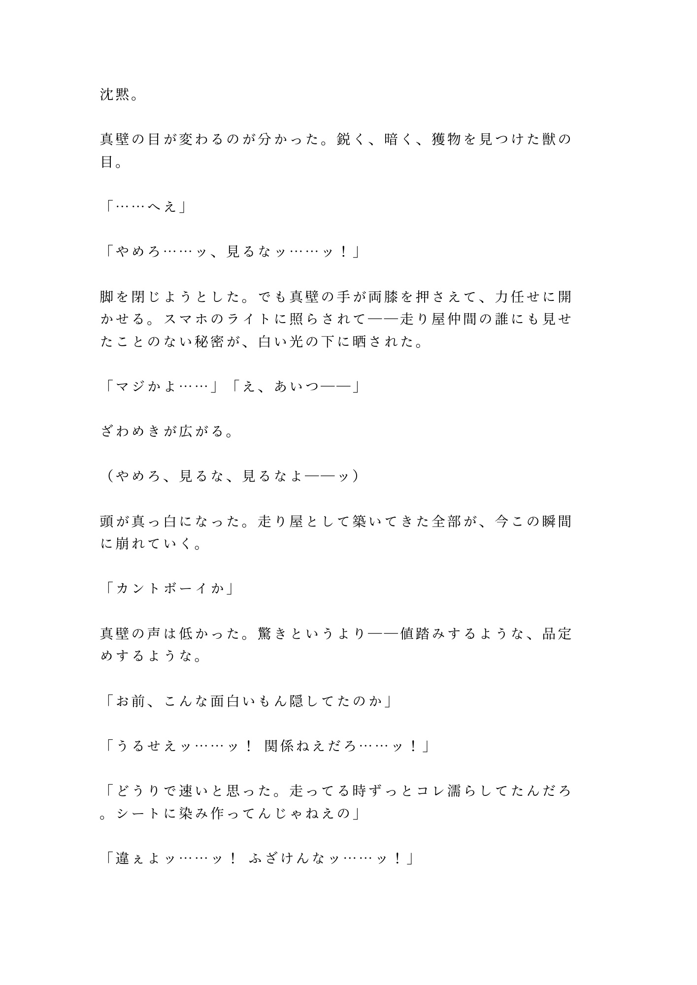 違法レースで負けた走り屋の遥斗。賭け金100万を払えず、突きつけられた選択肢は「車か、体か」。自分で組んだS15を守るため、選んだのは——熱いボンネットの上で秘密を暴かれること。走り屋仲間の視線とスマホのライトに晒されながら、レーシンググローブの革が隠してきたカントを暴く。エンジンの振動で疼いていた身体は、もう抗えない。公開調教×違法レース×カントボーイ。