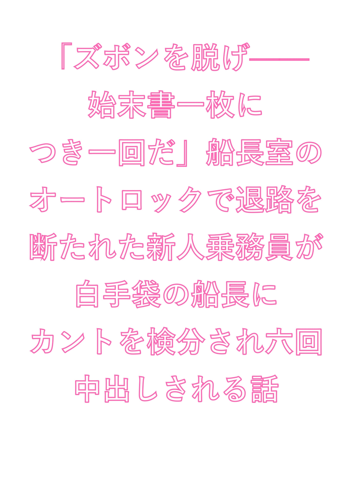 「ズボンを脱げ——始末書一枚につき一回だ」船長室のオートロックで退路を断たれた新人乗務員が白手袋の船長にカントを検分され六回中出しされる話