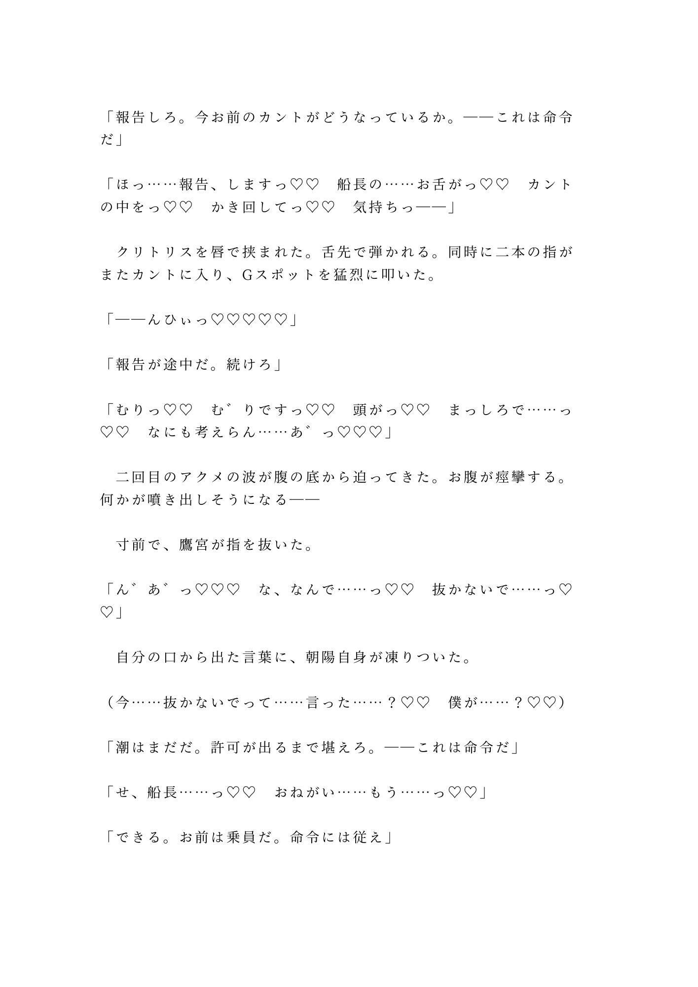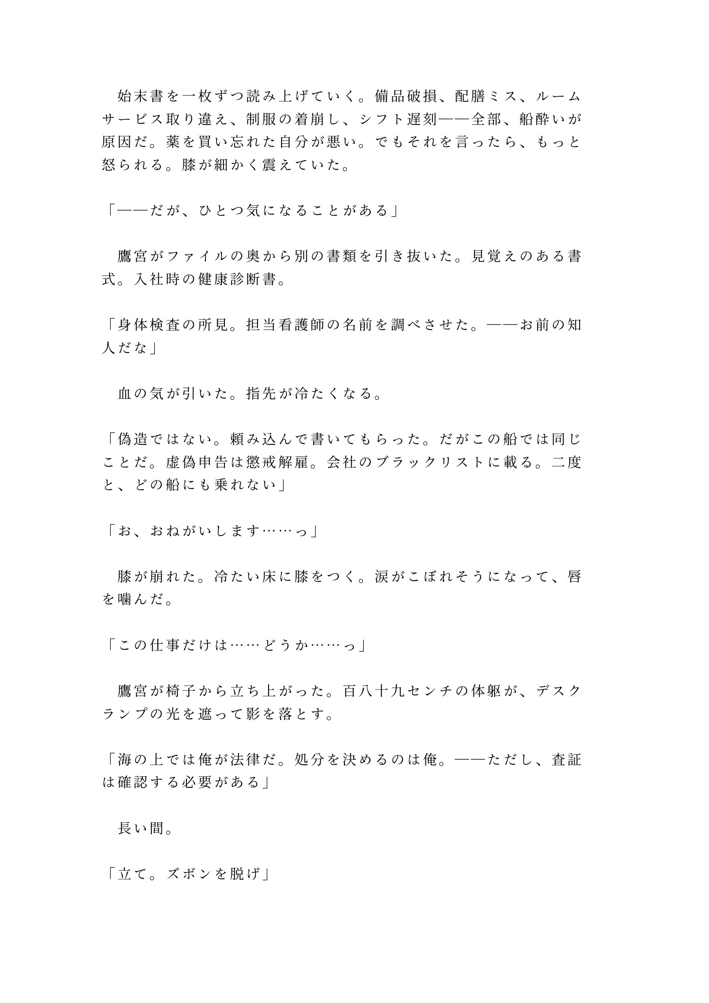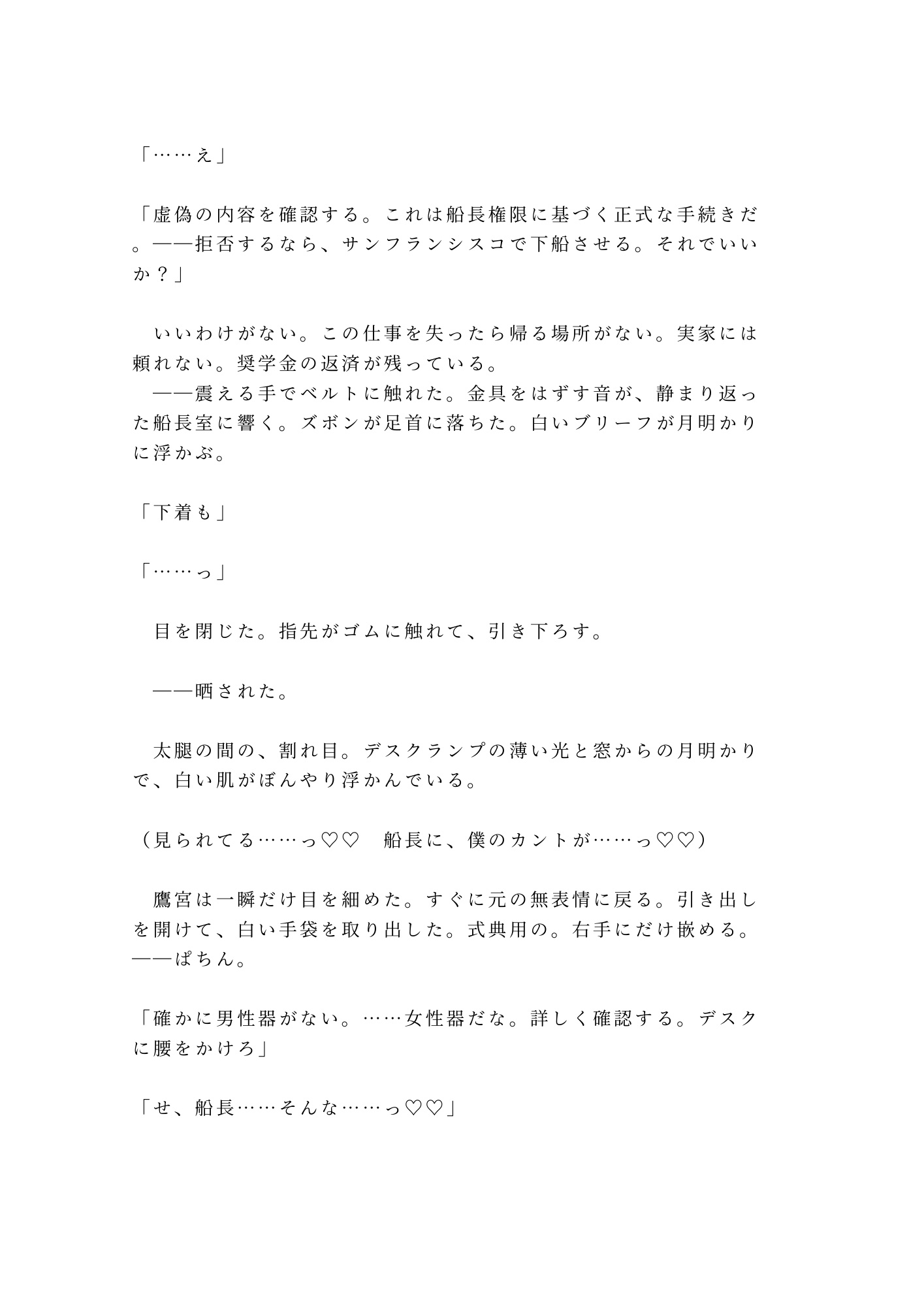豪華客船のクルーとして乗り込んだ朝陽には、誰にも言えない秘密があった。男の身体に女性器を持つ、カントボーイであること。偽造同然の健康診断書で乗船審査をすり抜けたが、七日で始末書六枚という惨憺たる勤務実績が、冷徹な鷹宮船長の目に留まってしまう。