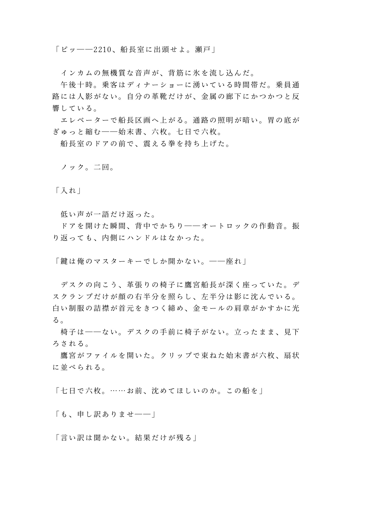 豪華客船で働く”秘密”を持つ新人乗務員・瀬戸朝陽。七日で始末書六枚——呼び出された船長室のドアは、内側から開かない。冷徹な鷹宮船長に健康診断書の虚偽を突きつけられ、「査証の確認」と称して暴かれていく身体。白手袋の指が秘所を検分するたび、抑えていた声が零れ落ちる。海の上では、船長が法律——逃げ場のない密室で、理性ごと貫かれる過激BL官能。