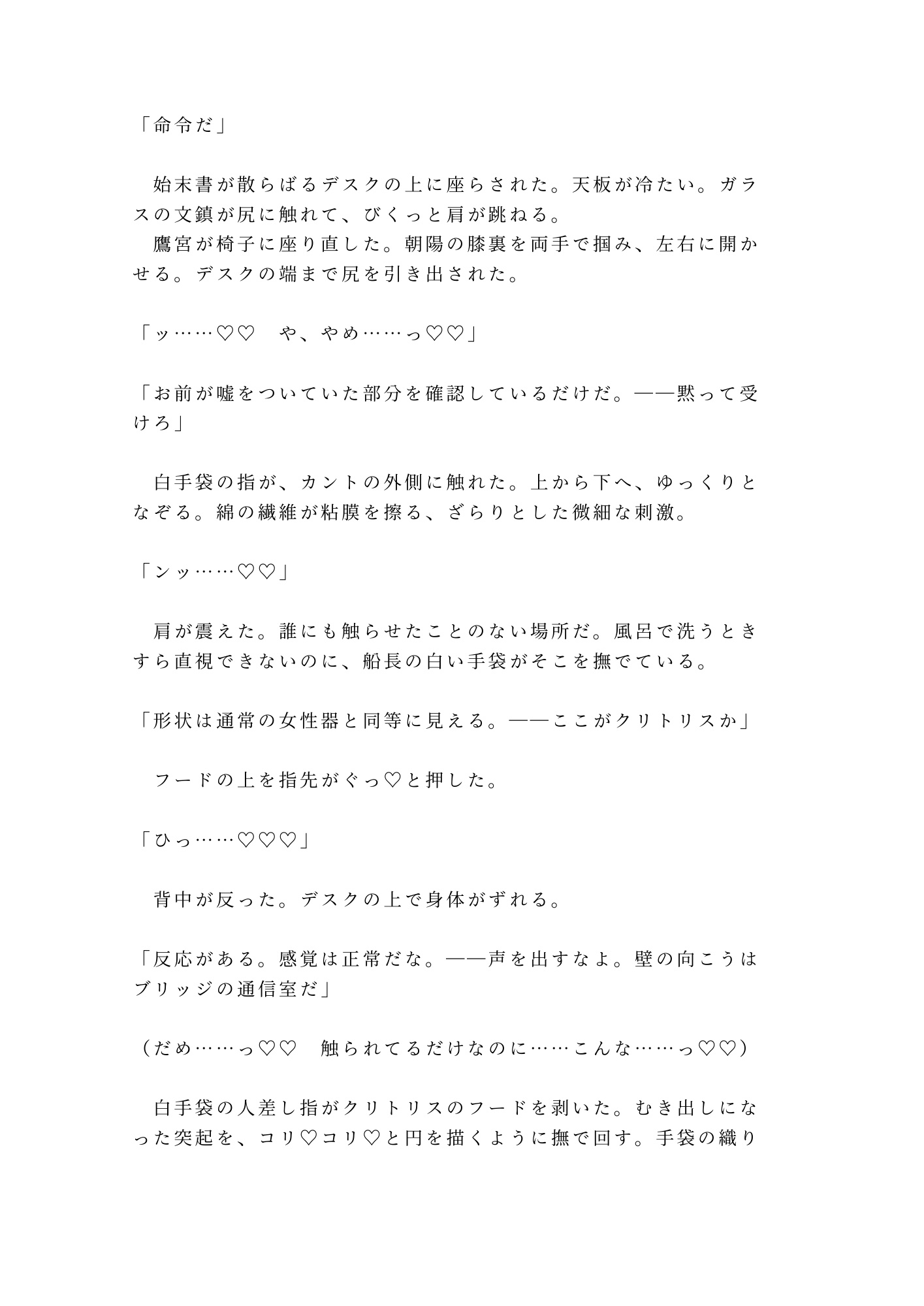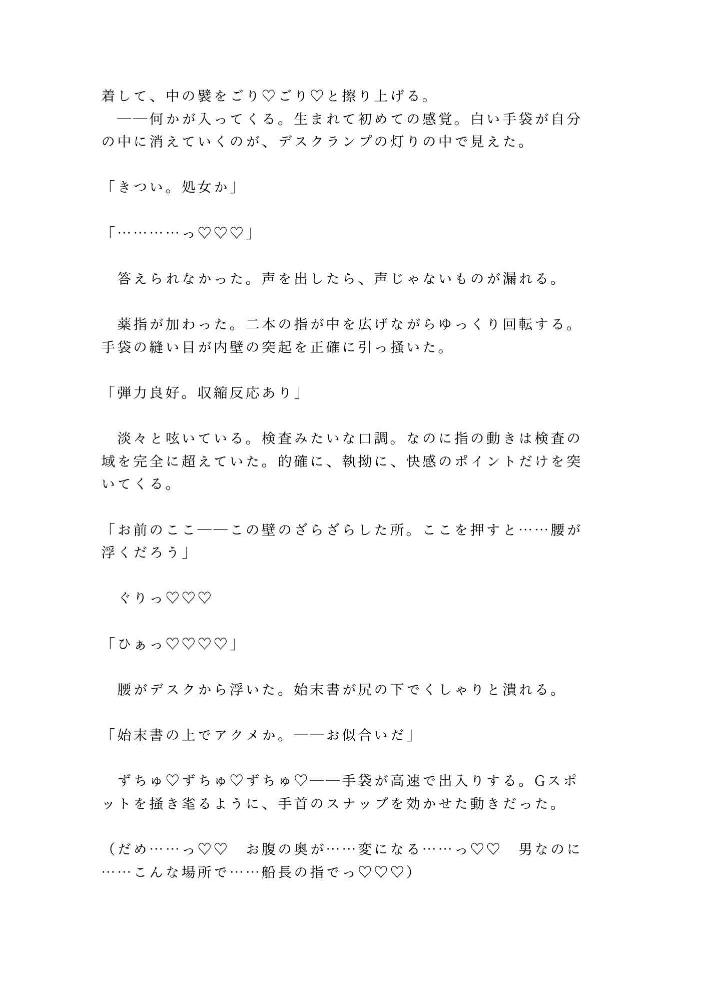 午後十時、人気のない乗員通路を抜けて辿り着いた船長室。オートロックで退路を断たれた密室で、鷹宮は朝陽の虚偽申告を静かに暴く。「確認する必要がある。ズボンを脱げ」——船長権限という名の絶対命令の下、白い式典用手袋に包まれた指が、朝陽の秘部を「検査」していく。