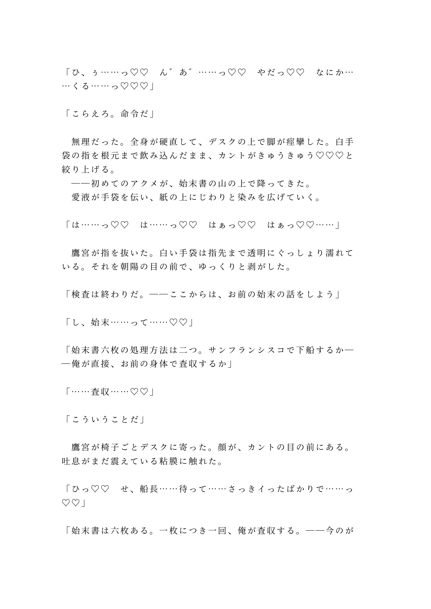 逆らえない。この仕事を失えば、奨学金も生活も全てが終わる。抵抗できない立場で、身体だけが正直に反応してしまう屈辱と快楽。始末書六枚、一枚につき一回の「査収」——冷徹な船長の舌と指と、そして灼熱の肉棒が、朝陽のカントを容赦なく開発していく。