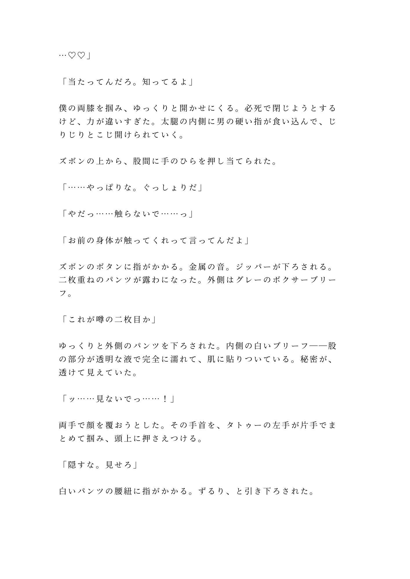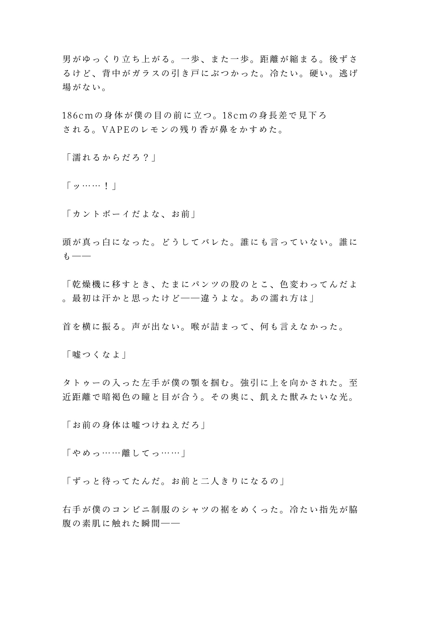 全身にタトゥーを纏った黒ずくめの男・城島は、洗濯物のパンツの枚数から、その秘密を見抜いていた。鍵のかかった深夜のコインランドリーで、逃げ場を失った僕の身体は、触れられただけでみっともなく反応してしまう。
