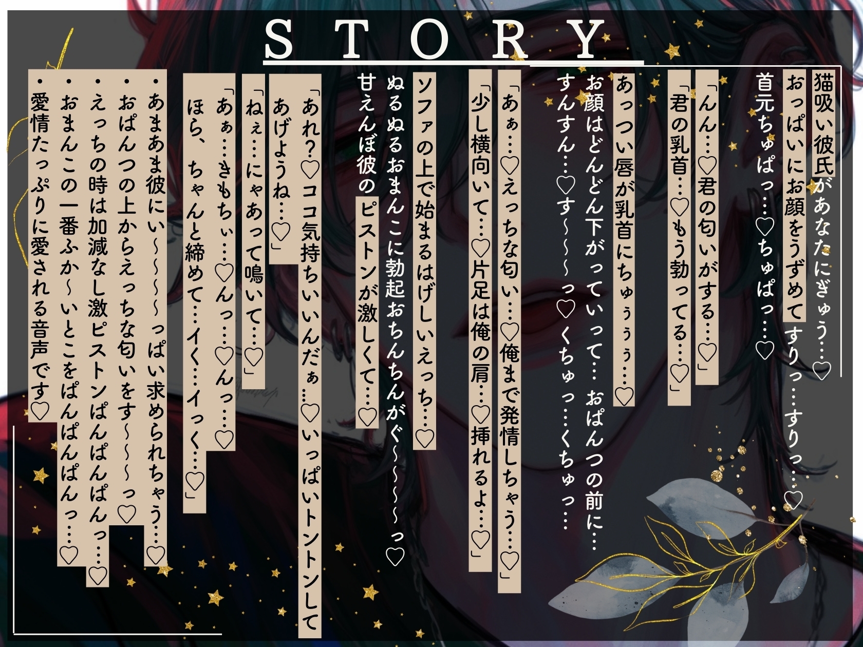 ※と〜〜〜〜っても激しいえっちです…必ず1人で没頭できるときに聴いてください…♡(12分11秒)猫吸い彼氏があなたにぎゅう…♡おっぱいにうずめてすりっ…すりっ…♡首元ちゅぱっ♡ちゅぱっ♡「んん…♡君の匂いがする…♡」「君の乳首…♡もう勃ってる…♡」乳首にちゅぅぅぅ…♡おぱんつの前にお顔が…♡すんすん…♡くちゅっ…くちゅっ…♡「あぁ…♡えっちな匂い…♡俺まで発情しちゃう…♡」「少し横向いて…♡片足は俺の肩…♡挿れるよ…♡」