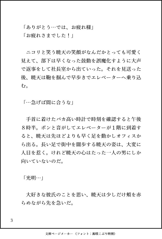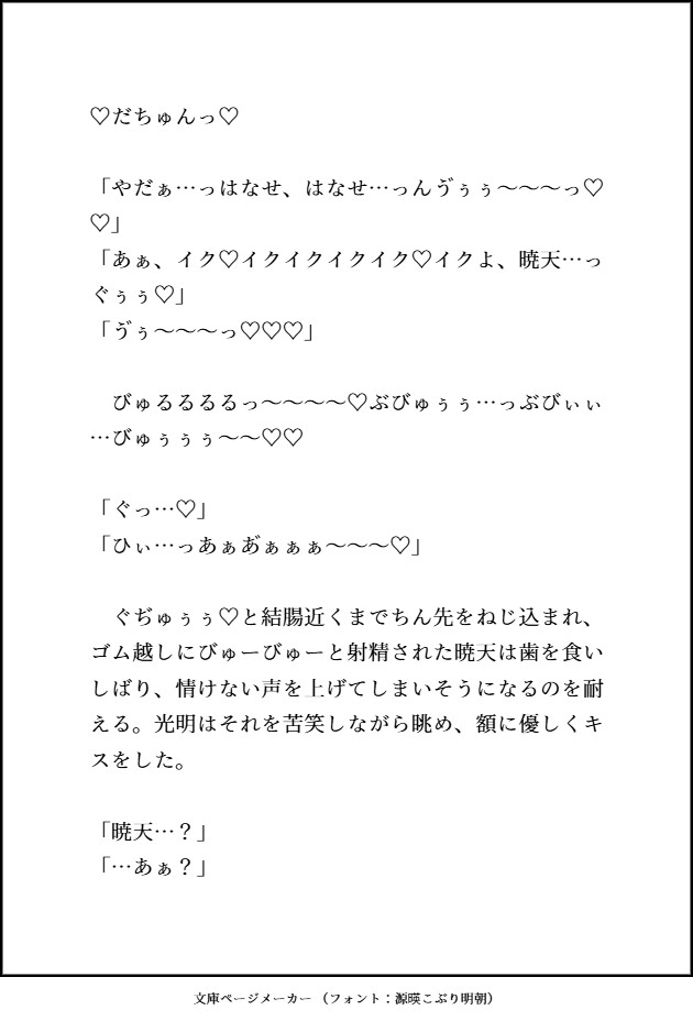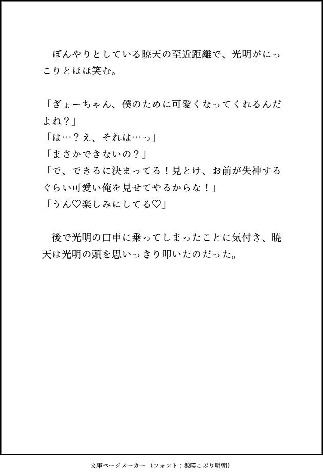 勘違いストーカーから助けてもらったことをきっかけに一目ぼれし、皇から告白。お付き合いを始めたが、ある日大好きな恋人が「可愛い子が好き」と言っているのを聞いたからさぁ、大変!可愛いからは程遠い暁天が、必死に可愛いを勉強してみるも、一枚上手な恋人にぐちゃぐちゃにエッチされてしまう。