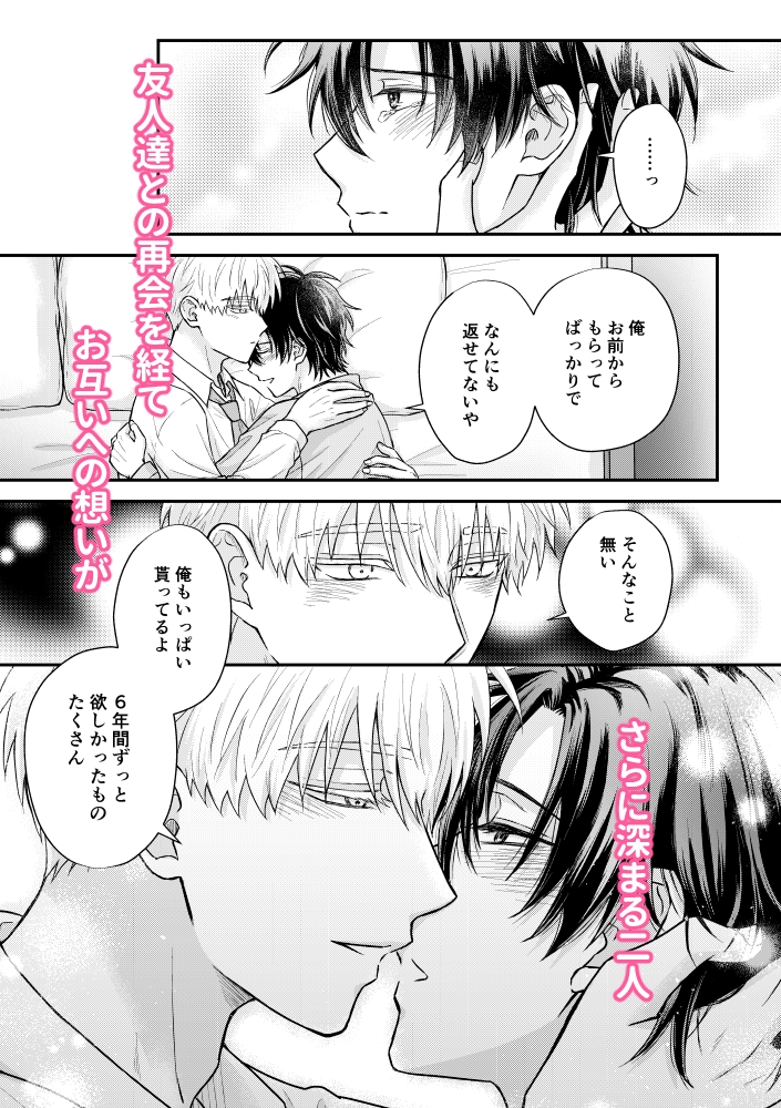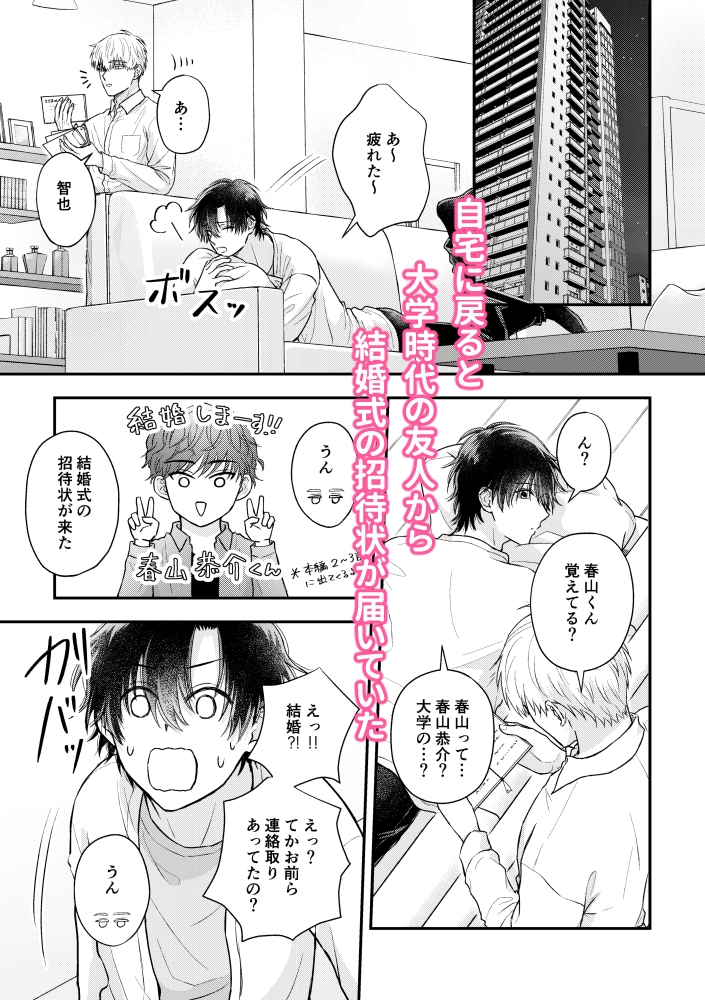 大学時代、親友だった直人と智也。とある出来事から絶縁状態となっていたが6年後に偶然再会する。その後、すれ違い両片想いを乗り越え結ばれた二人は幸せに暮らしていた。そんなある日、大学時代の友人から結婚式の招待状が届く。6年ぶりに友人達と再会する事になった智也だが、直人と付き合っていることが友人達にバレそうになり…⁈