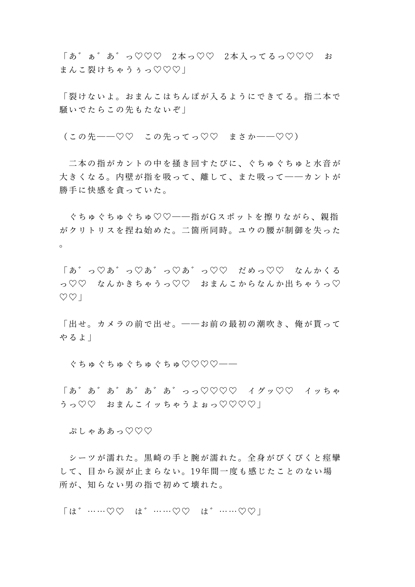 リングライトとカメラの赤いランプの前で、ユウの秘密が暴かれる。誰にも触れさせたことのない処女のカントに、黒崎の長い指が沈んでいく。「お前は商品だ」——その言葉に打ちのめされながら、ユウの身体は知らない快感に震え、壊れていく。