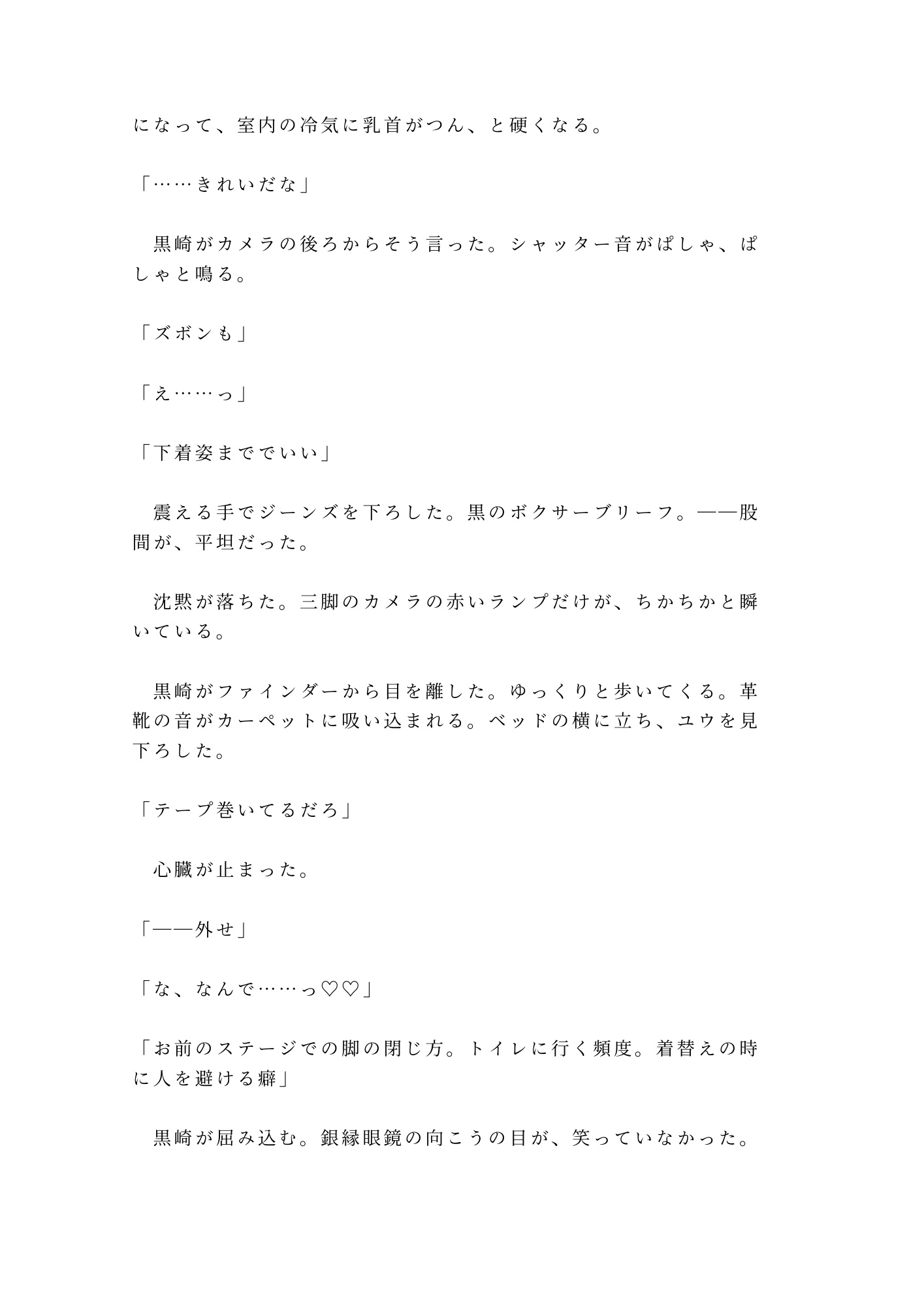 黒崎は最初からすべてを見抜いていた。ユウのステージでの脚の閉じ方、トイレの頻度、着替えの癖。知った上で、この部屋に連れてきた。
