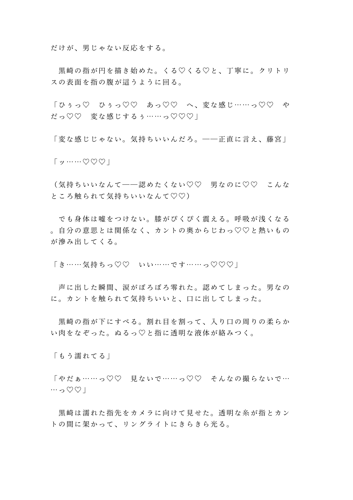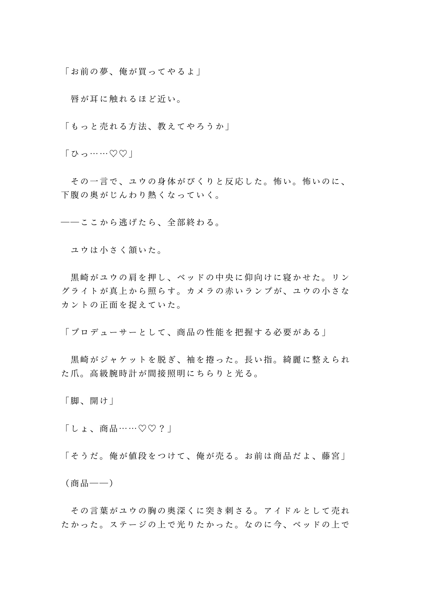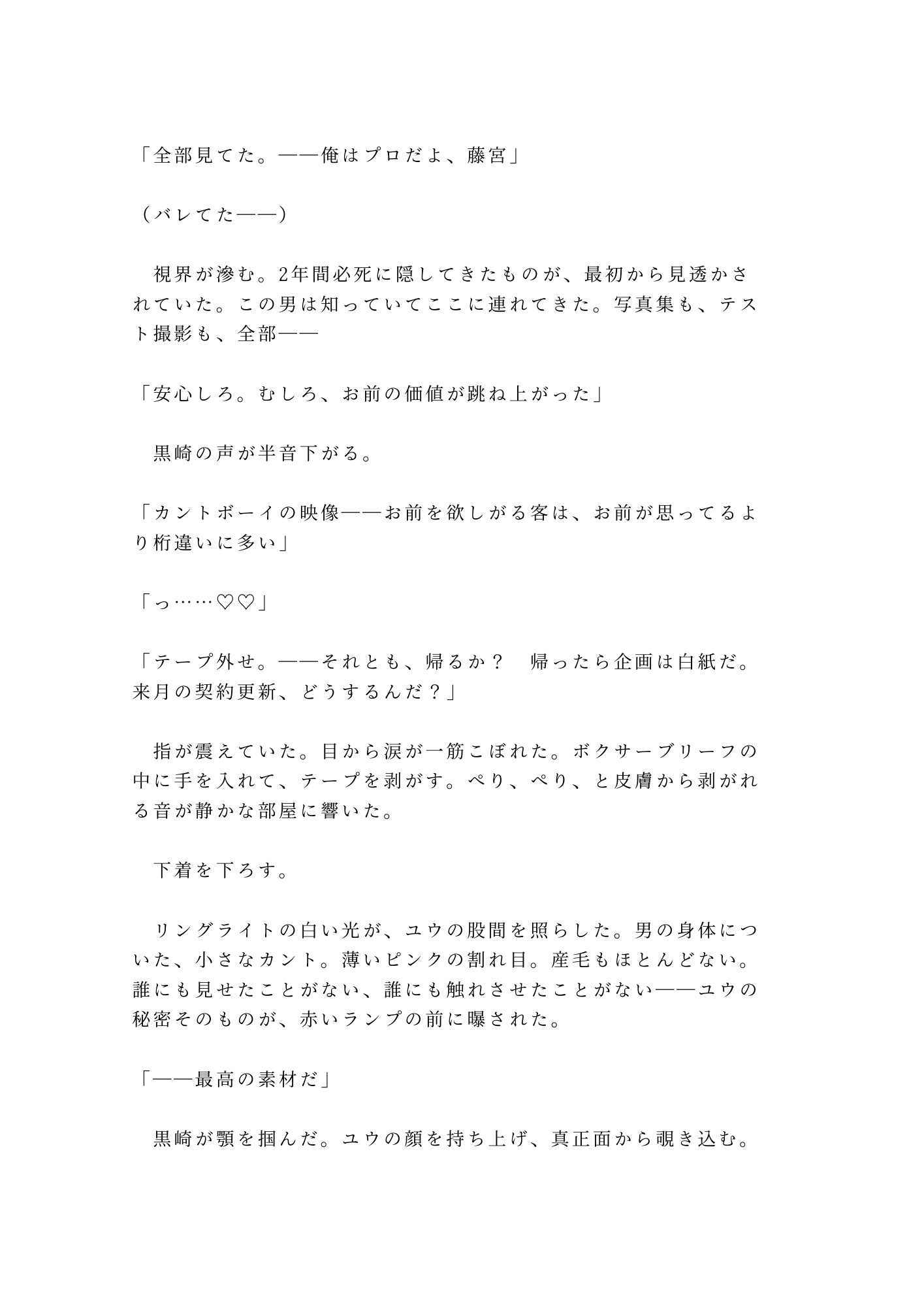 地下アイドルのユウには誰にも言えない秘密がある。男の身体に存在する、小さなカント。敏腕プロデューサー・黒崎はその秘密を最初から見抜いていた。「お前の夢、俺が買ってやるよ」——写真集の企画と引き換えに、リングライトの下で暴かれていく処女のカント。触られたことすらない場所を開発され、商品として値踏みされる屈辱と快楽に、ユウの理性が崩壊していく。