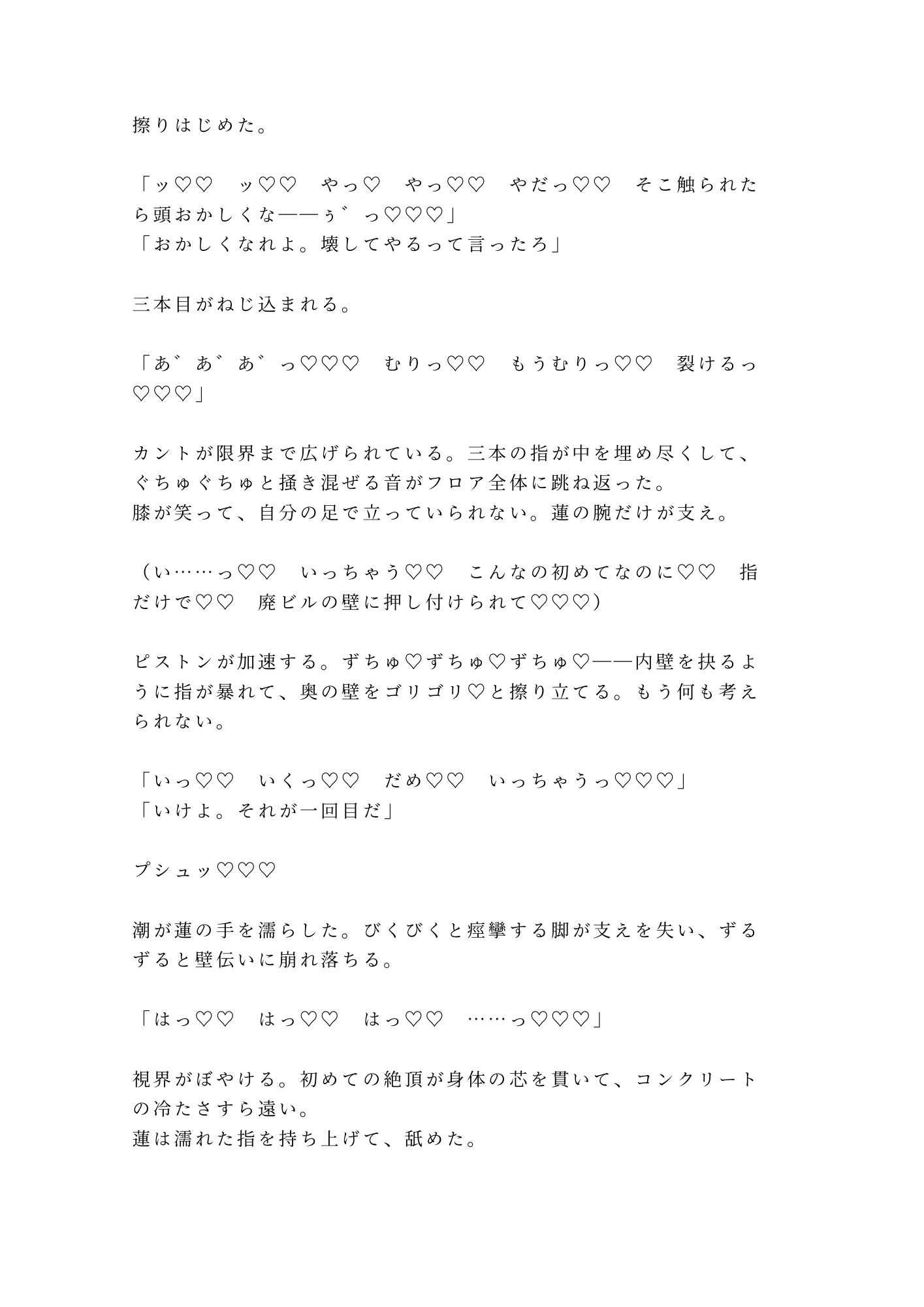 終電を逃した夜、迷い込んだ廃ビルで鬼塚蓮に捕まった。金髪、刺青、拳ダコ――見知らぬ野獣に壁へ押しつけられ、二十六年間隠し通してきた秘密を一瞬で暴かれる。「嘘つきにはペナルティがある」。コンクリートに響く水音と嬌声。逃げ場のない最上階で、処女のカントは容赦なくこじ開けられていく。指だけで壊された一回目――だが男は笑う。「まだ始まってもいねぇ」。廃墟の夜は、長い。