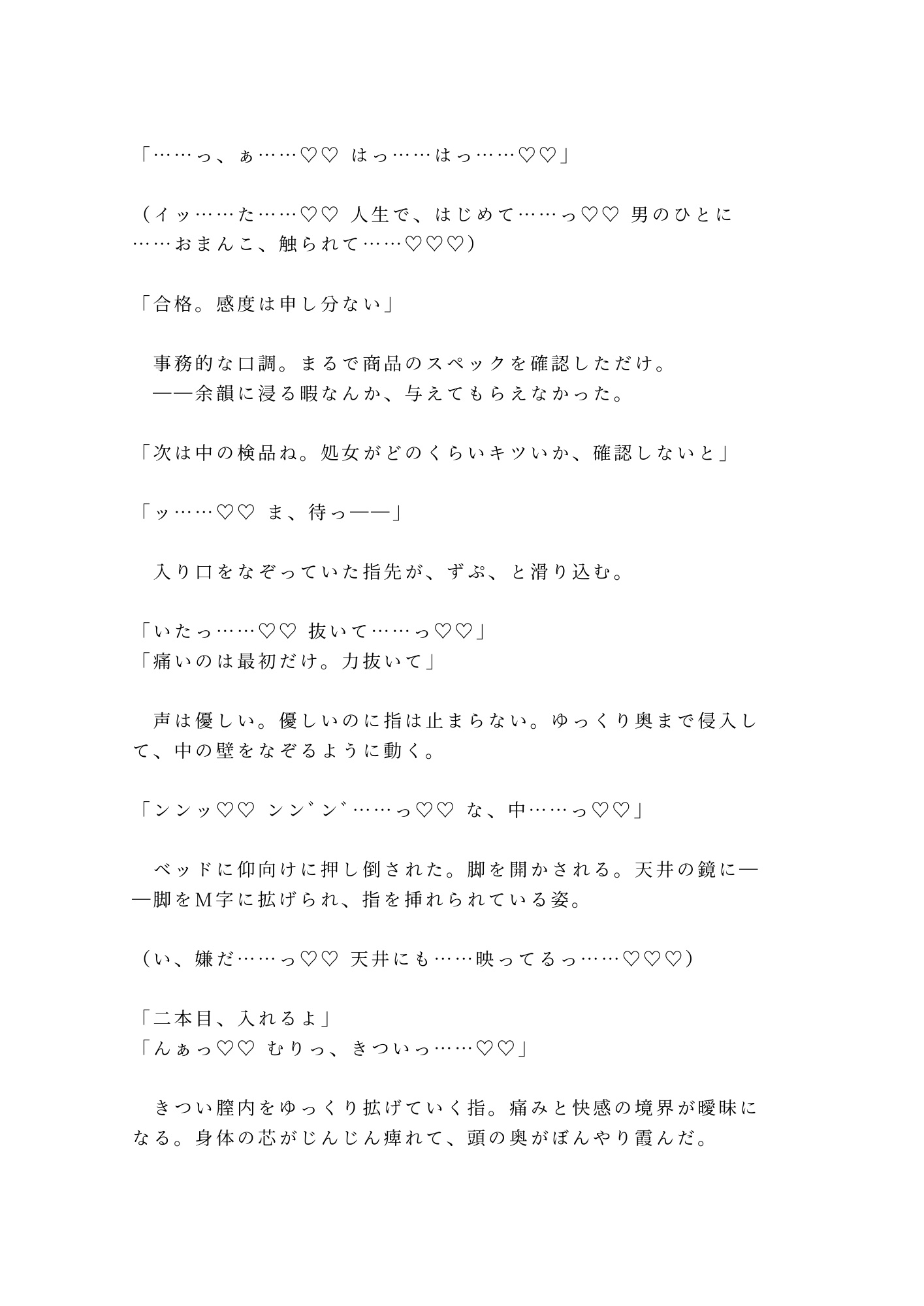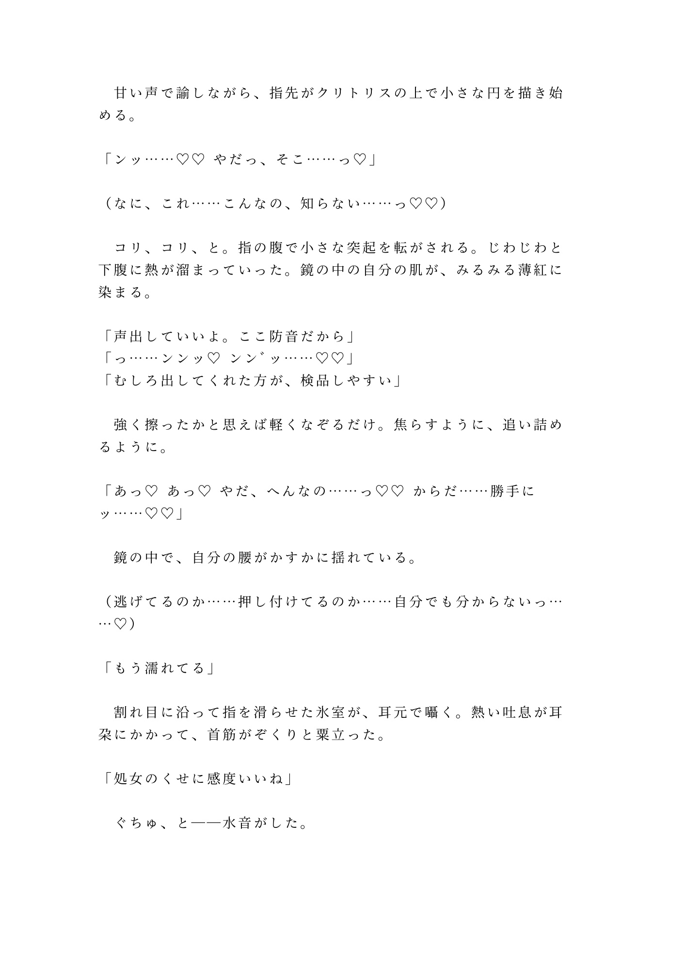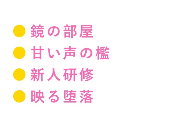 四方を鏡に囲まれた部屋で、逃げ場のない「新人研修」が始まる。商品検査という名目で暴かれる身体。触れられたことのない場所を開発され、自分でも知らなかった感度を引きずり出されていく。鏡に映る、快楽に蕩けた自分の姿から目を逸らすことすら許されない。