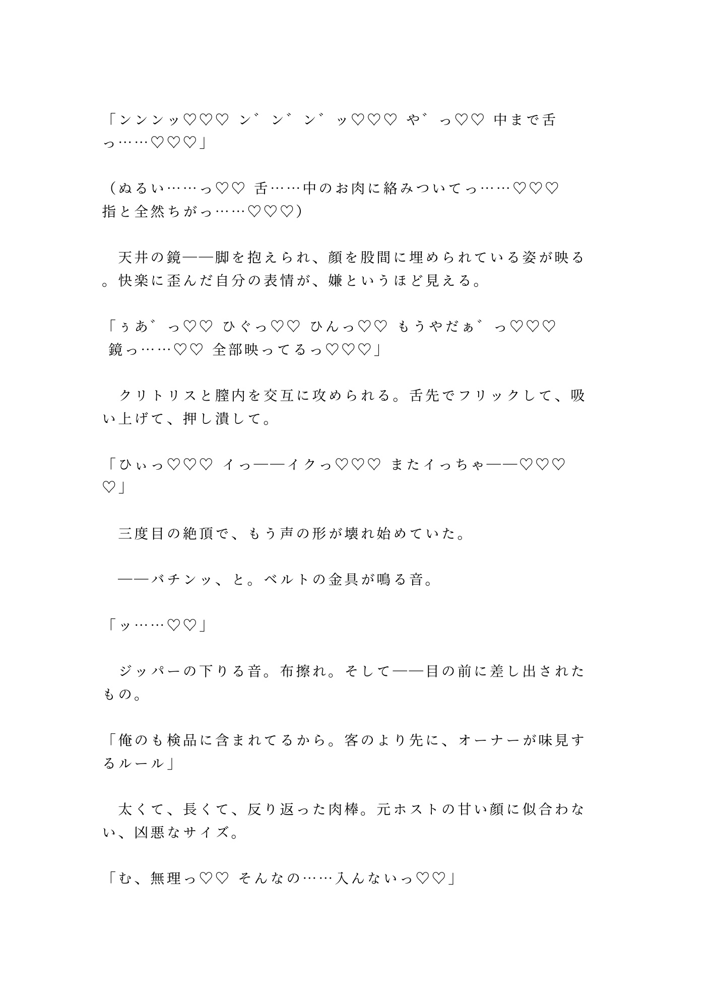 元ナンバーワンホストの甘い声と、決して笑っていない目。優しい言葉をかけながら容赦なく身体を暴く氷室の手管に、湊の理性は音を立てて壊れていく。「商品」と呼ばれるたびに屈辱で燃えるはずの心が、いつしか快感に塗り潰されて——。