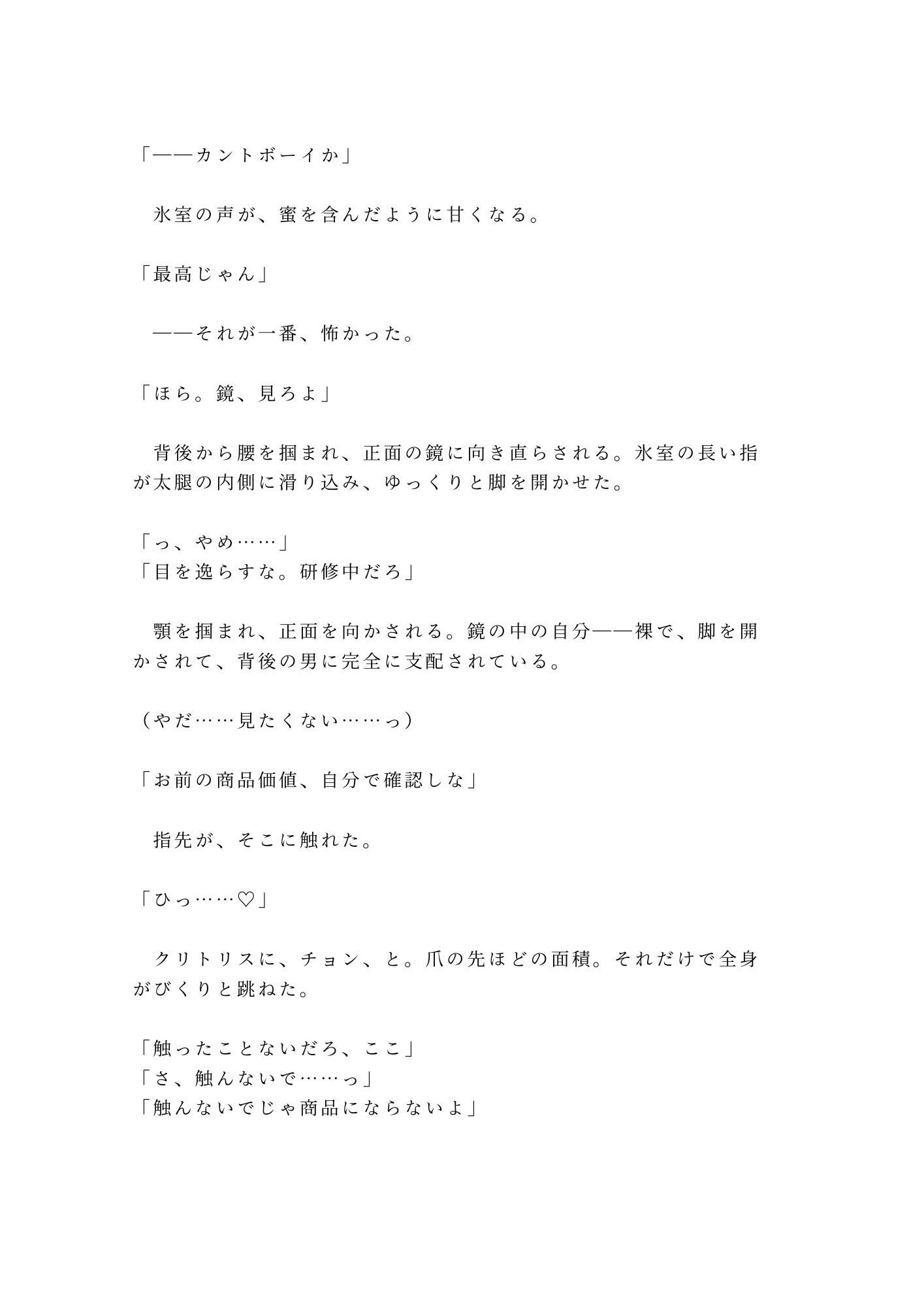 歌舞伎町の裏風俗店ナルシス。父親の借金八百万を背負わされた湊は、元No.1ホスト・氷室蓮の前に差し出された。誰にも明かせなかった秘密——男の身体に女性器を持つカントボーイ。「最高じゃん」と嗤う氷室の指が暴いたのは、二十年間封じ込めてきた身体の本性。鏡張りの部屋で”商品検査”という名の調教が始まる。逃げ場なし、抵抗不可、快楽だけが際限なく注ぎ込まれる——。