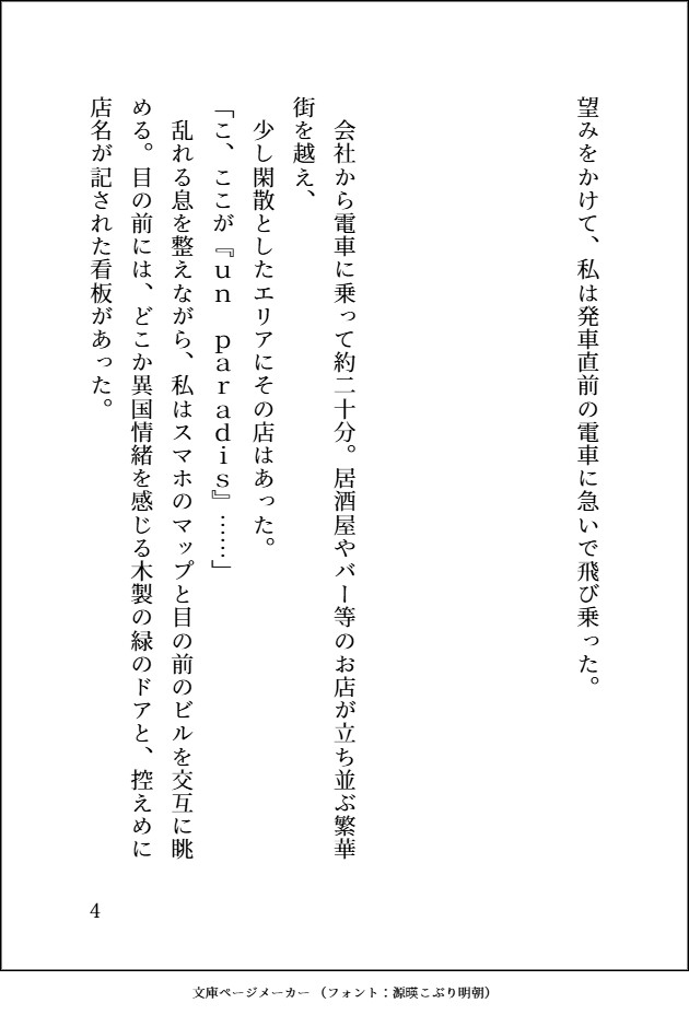 社畜OL。上司に怒られ、日々仕事に追われる身体を癒したいとマッサージ店「un paradis」に訪れる。