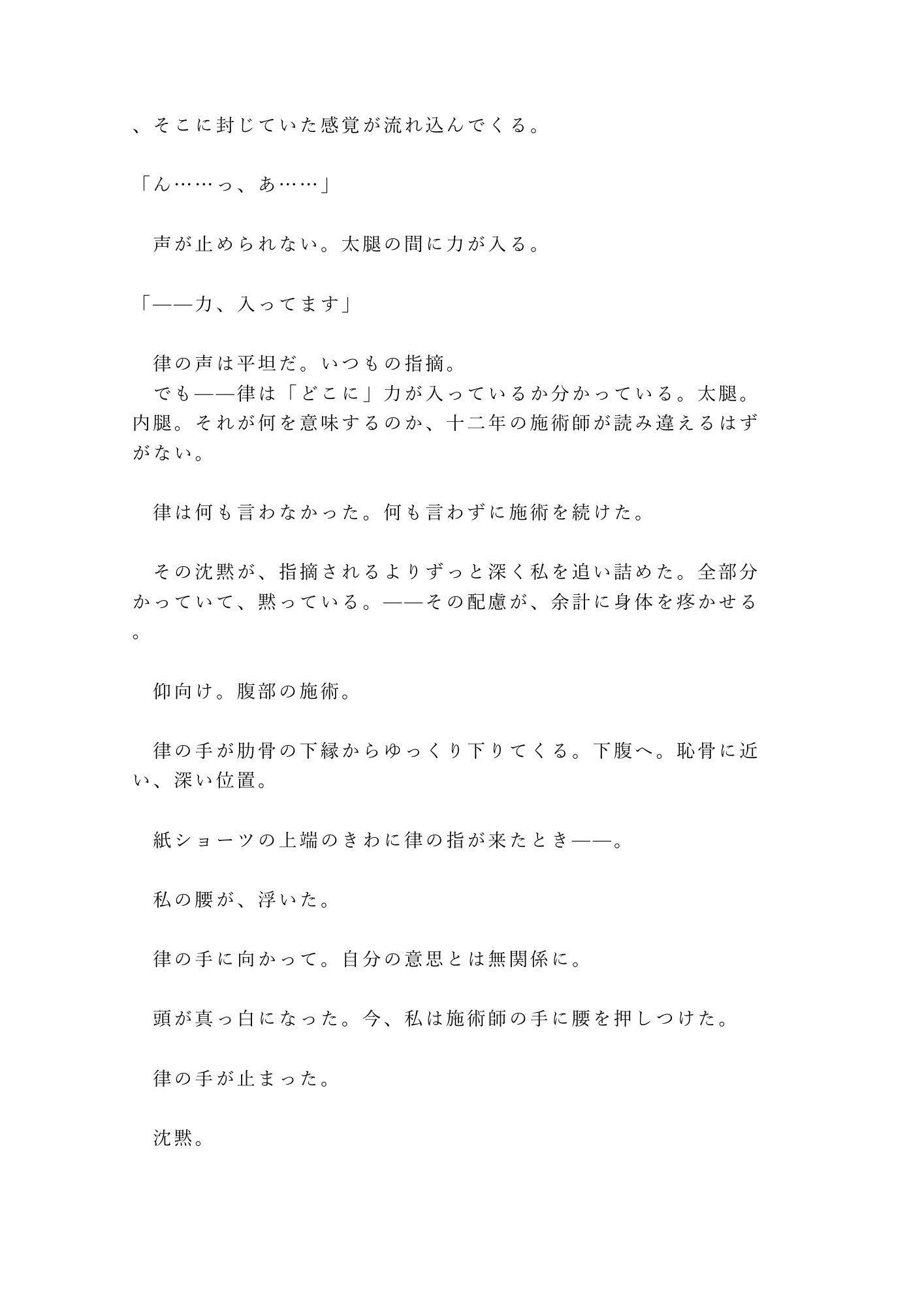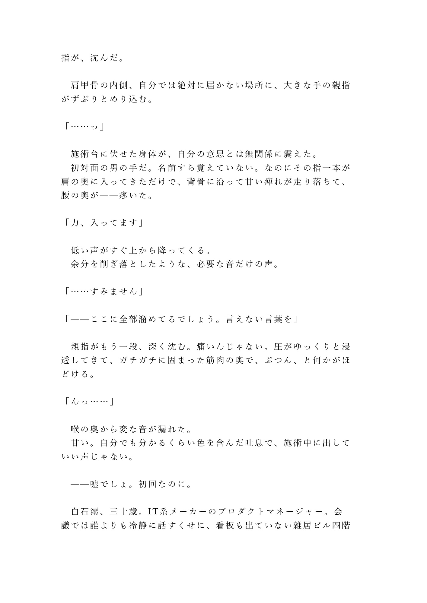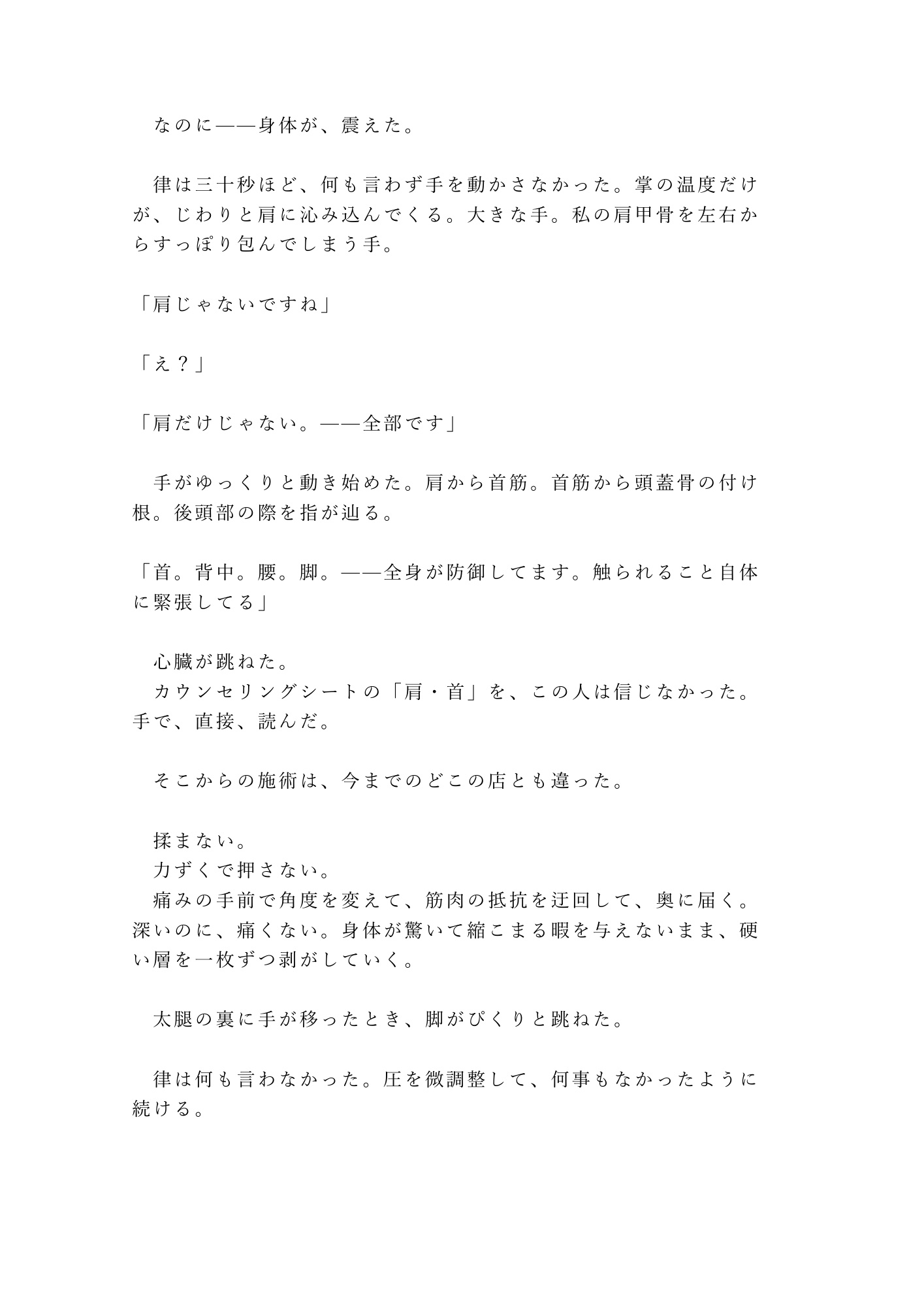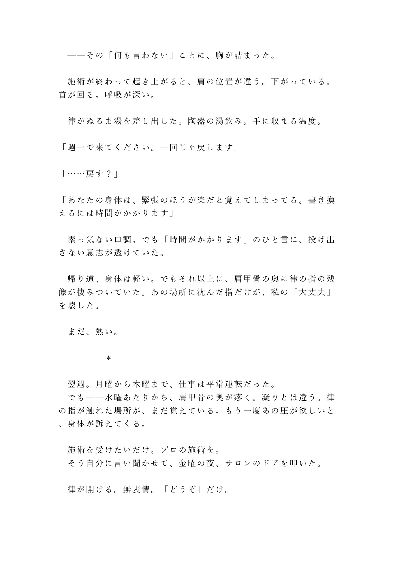 仕事に追われ、身体に蓋をして生きてきた三十歳のキャリア女性・澪。慢性的な肩の痛みに限界を迎えた彼女がたどり着いたのは、看板もない隠れ家サロン——そこで待っていたのは、無口で無愛想な施術師・緒方律だった。