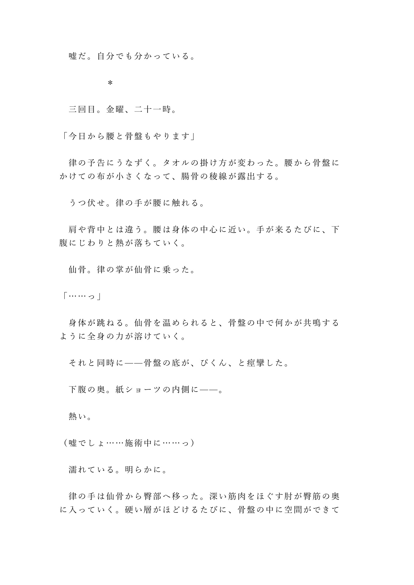 施術台の上で暴かれる本音。プロの境界線が揺らぐ指先。週に一度、あの手に触れられるためだけに生きる金曜日。——身体が先に恋をした。