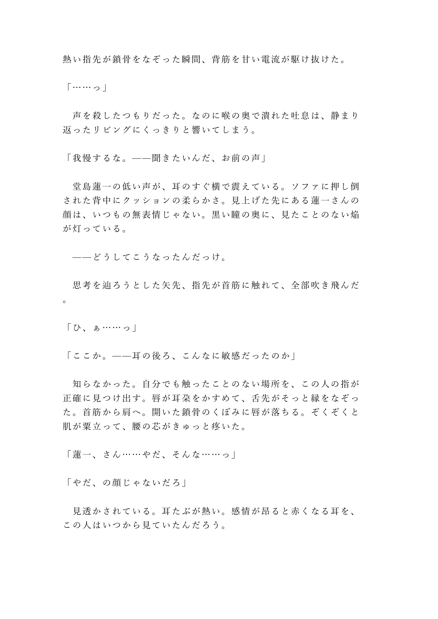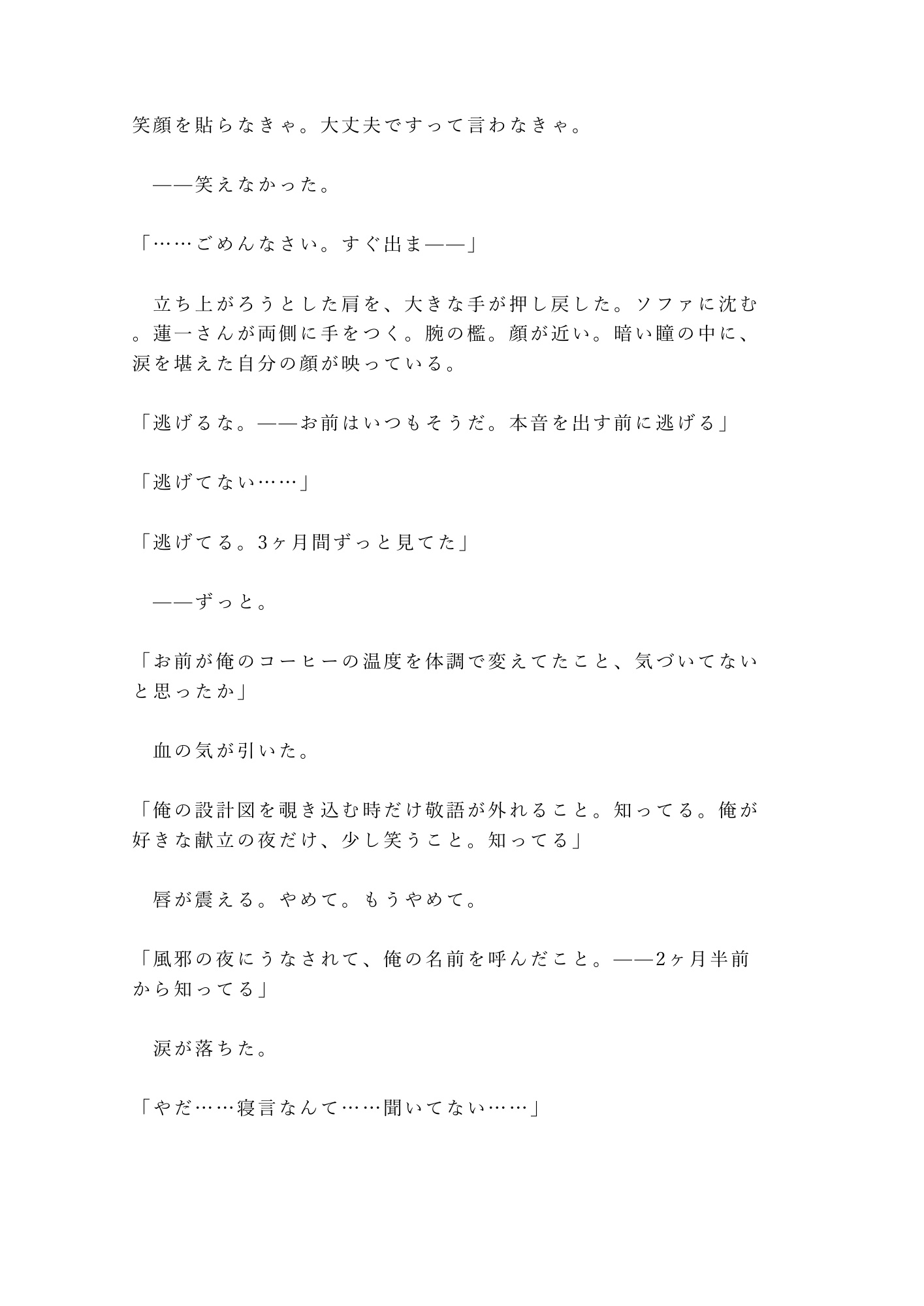 「帰らない理由、全部バレてた」——水漏れ事故で建築士・堂島蓮一の部屋に転がり込んだ契約同居。修繕完了を隠して延ばした三ヶ月間、コーヒーの温度も、寝言で呼んだ名前も、全て見抜かれていた。契約最終日の夜、本音を暴かれたヒロインの身体と心が同時に溶かされる、期限付き溺愛ラブ。「お前の嘘は全部知ってる。——だから、もう逃がさない」