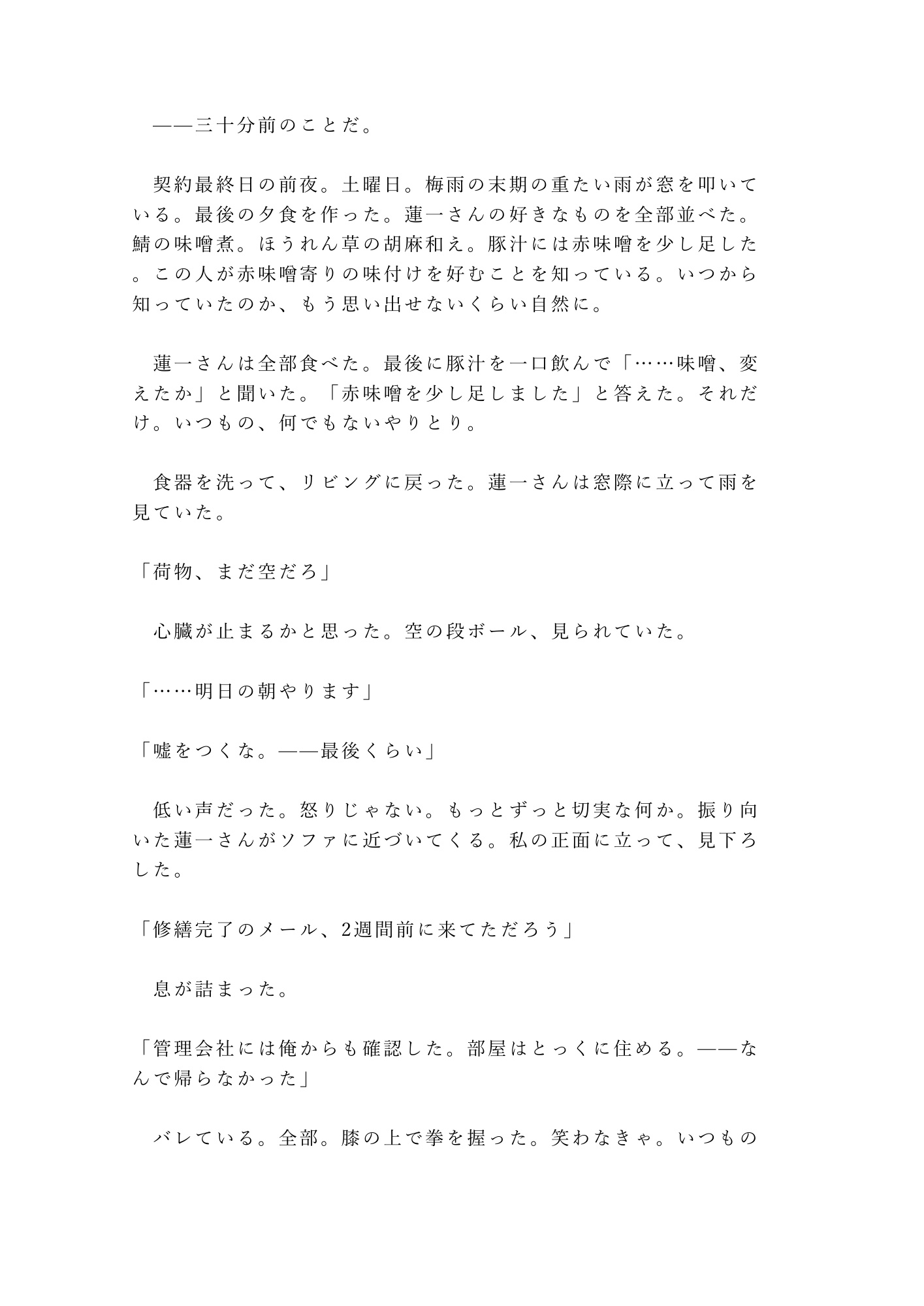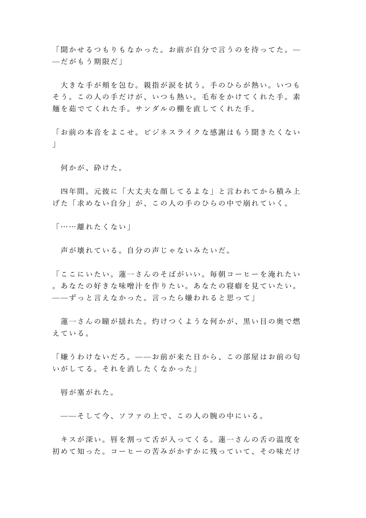 「修繕が終わるまでの仮住まい」——ただそれだけの契約。なのに気づけば三ヶ月、彼のコーヒーの好みも、寝起きの癖も、設計図に向かうときの横顔も、全部知ってしまった。