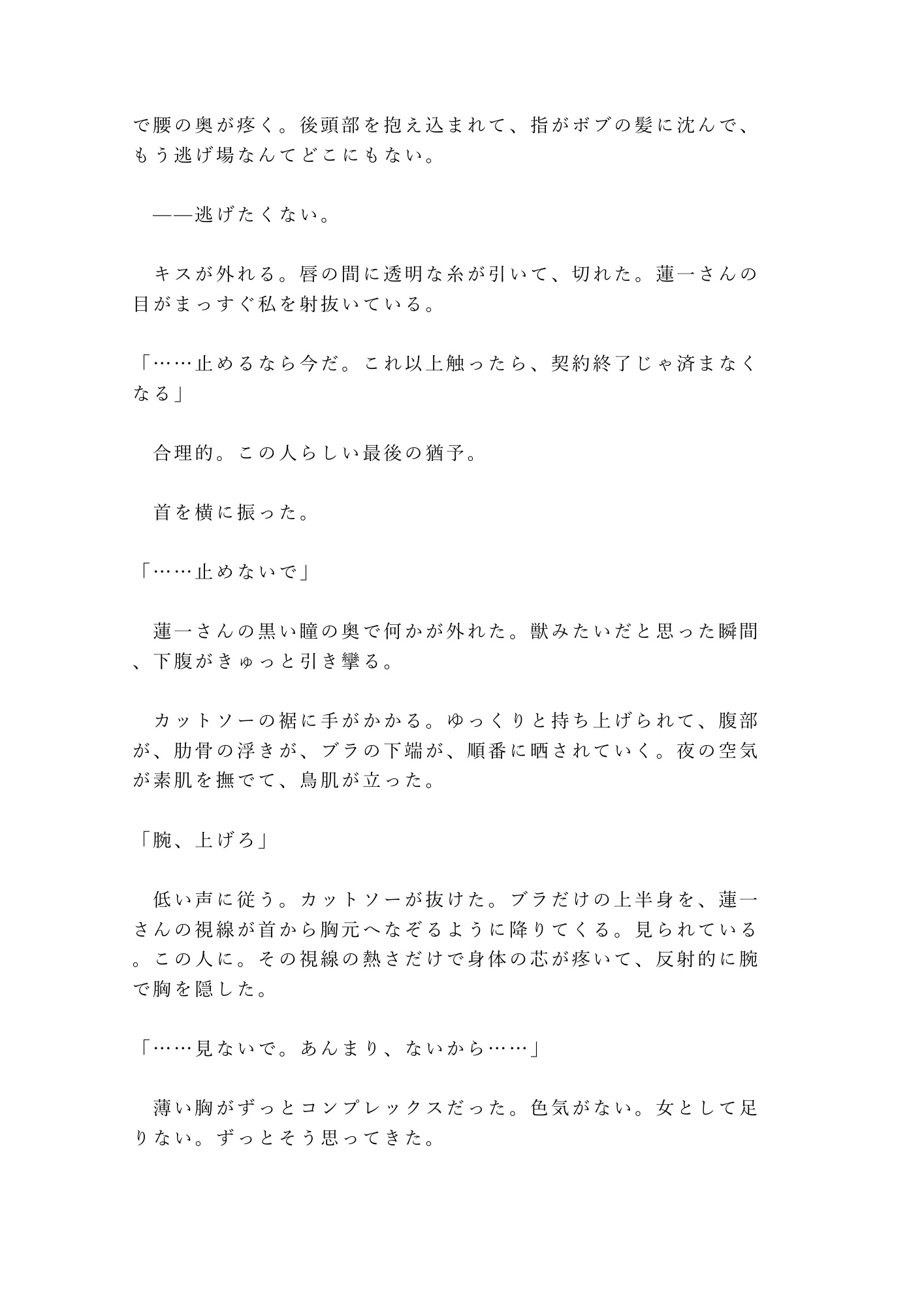 契約最終日の夜、ずっと隠していた本音が、彼の手のひらの中で崩れ落ちる。「帰りたくない」と声が壊れた瞬間、求めることを怖がり続けた二年間の殻が砕けて、身体ごと暴かれていく——。
