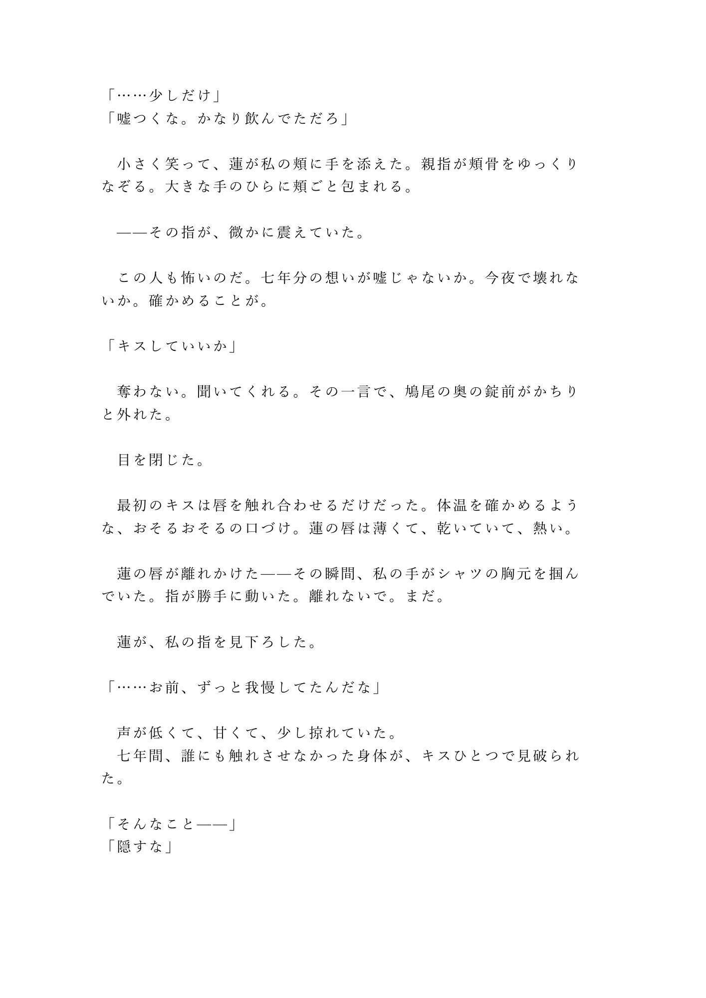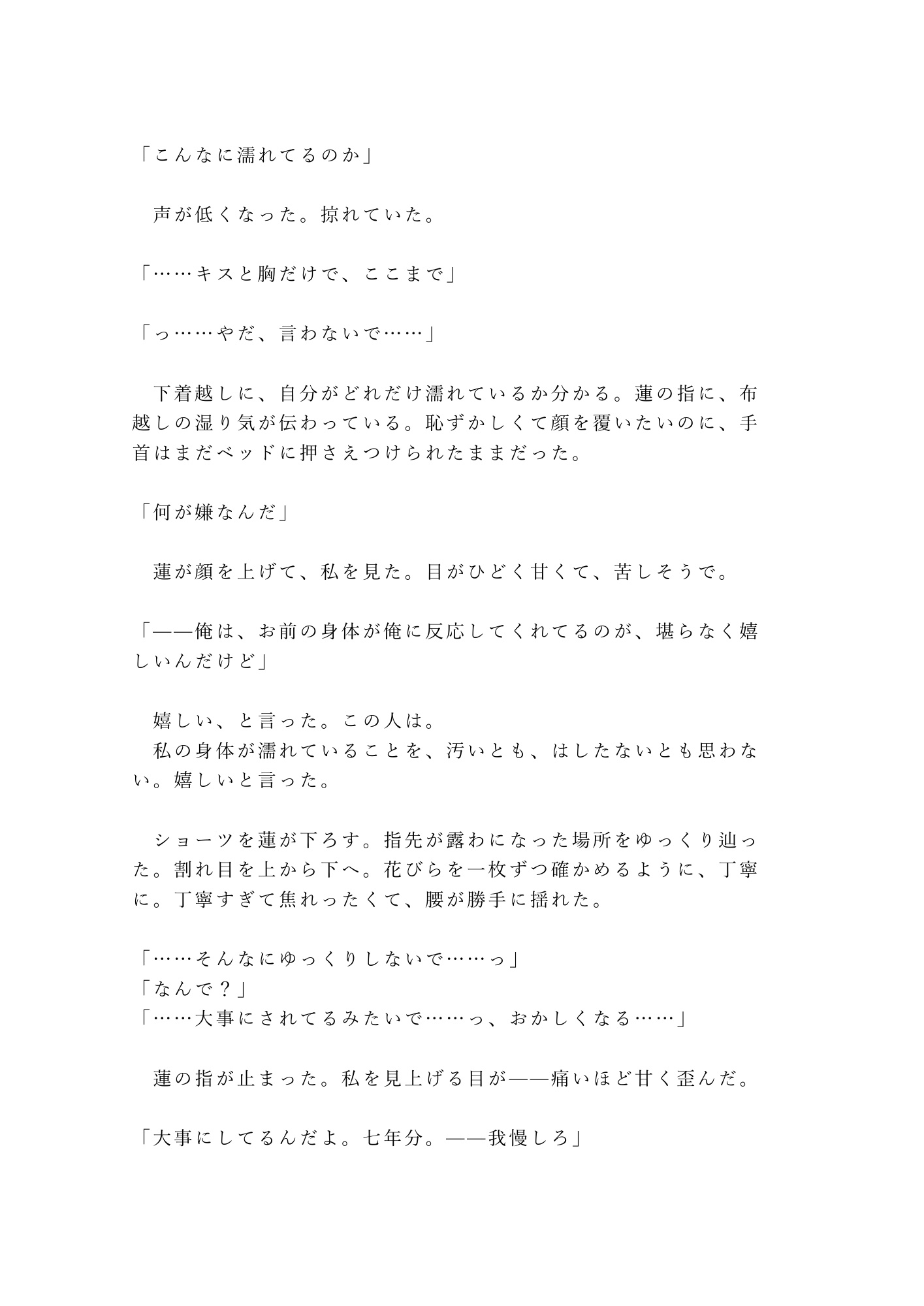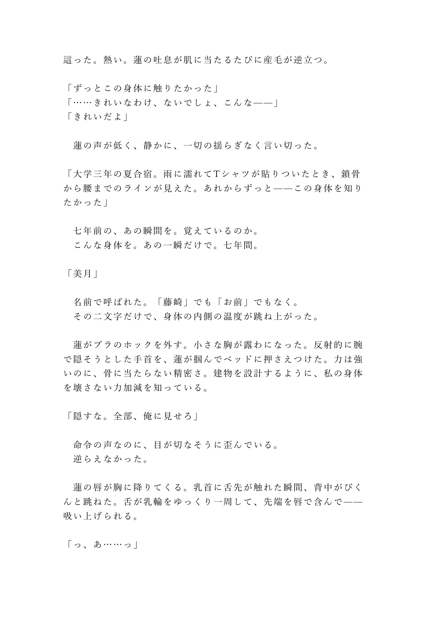 この夜、蓮は美月の身体を「大事にしている。七年分」と言って、一箇所ずつ丁寧に触れていく。自分でも知らなかった場所を見つけられ、「覚えた」と囁かれ、求めることを「嬉しい」と言われる。身体だけじゃない。心ごと、まるごと、選ばれていく夜の物語。