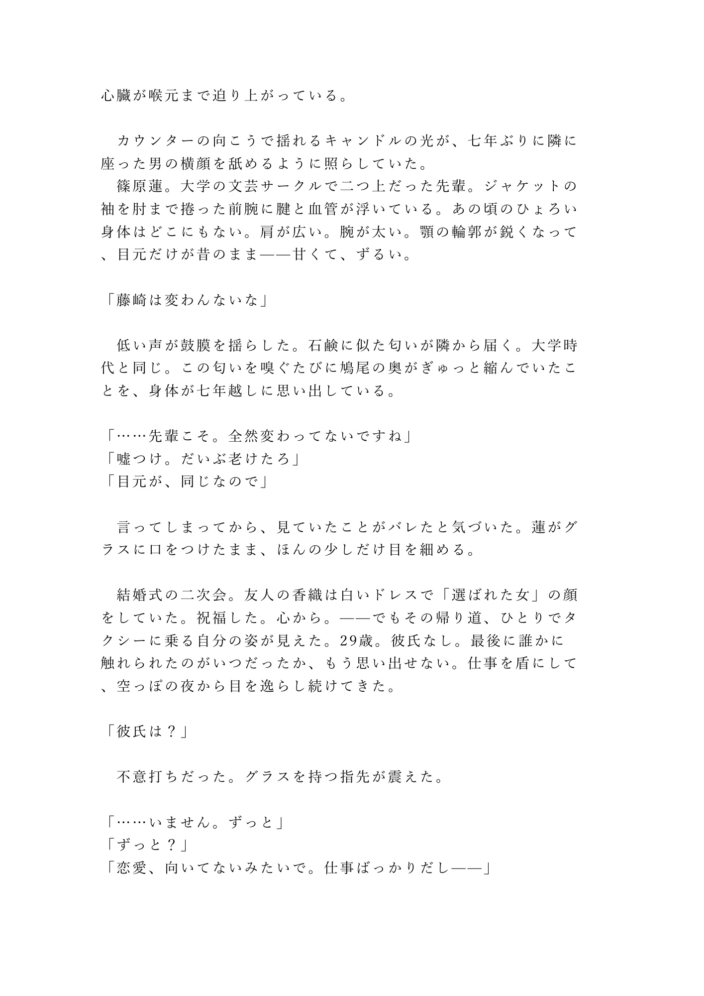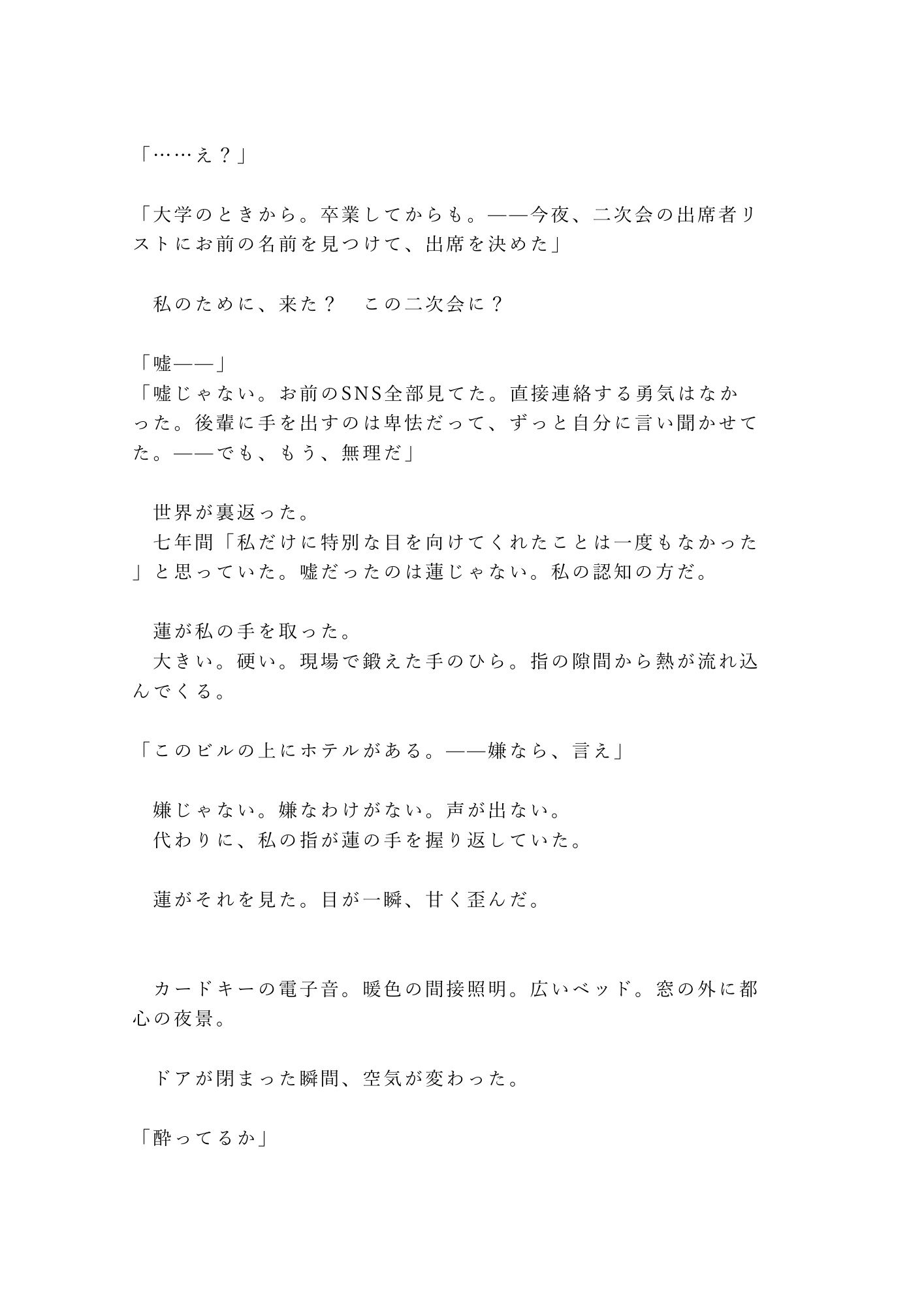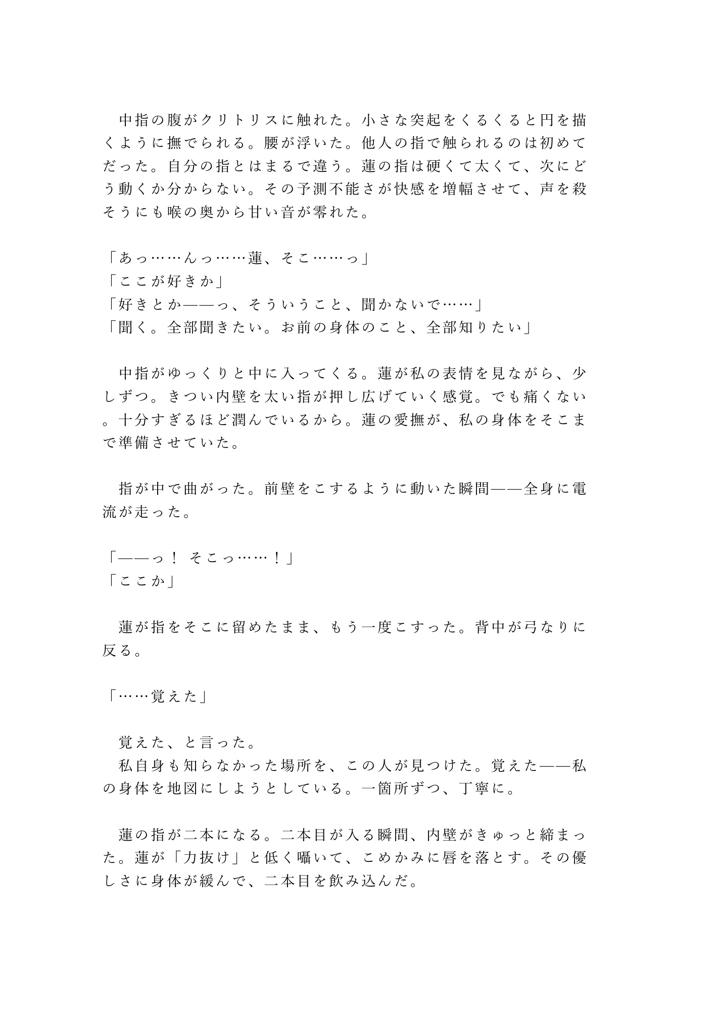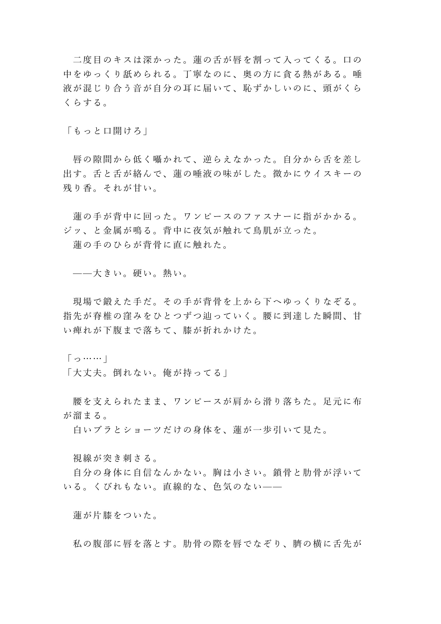 この夜、蓮は美月の身体を「大事にしている。七年分」と言って、一箇所ずつ丁寧に触れていく。自分でも知らなかった場所を見つけられ、「覚えた」と囁かれ、求めることを「嬉しい」と言われる。身体だけじゃない。心ごと、まるごと、選ばれていく夜の物語。