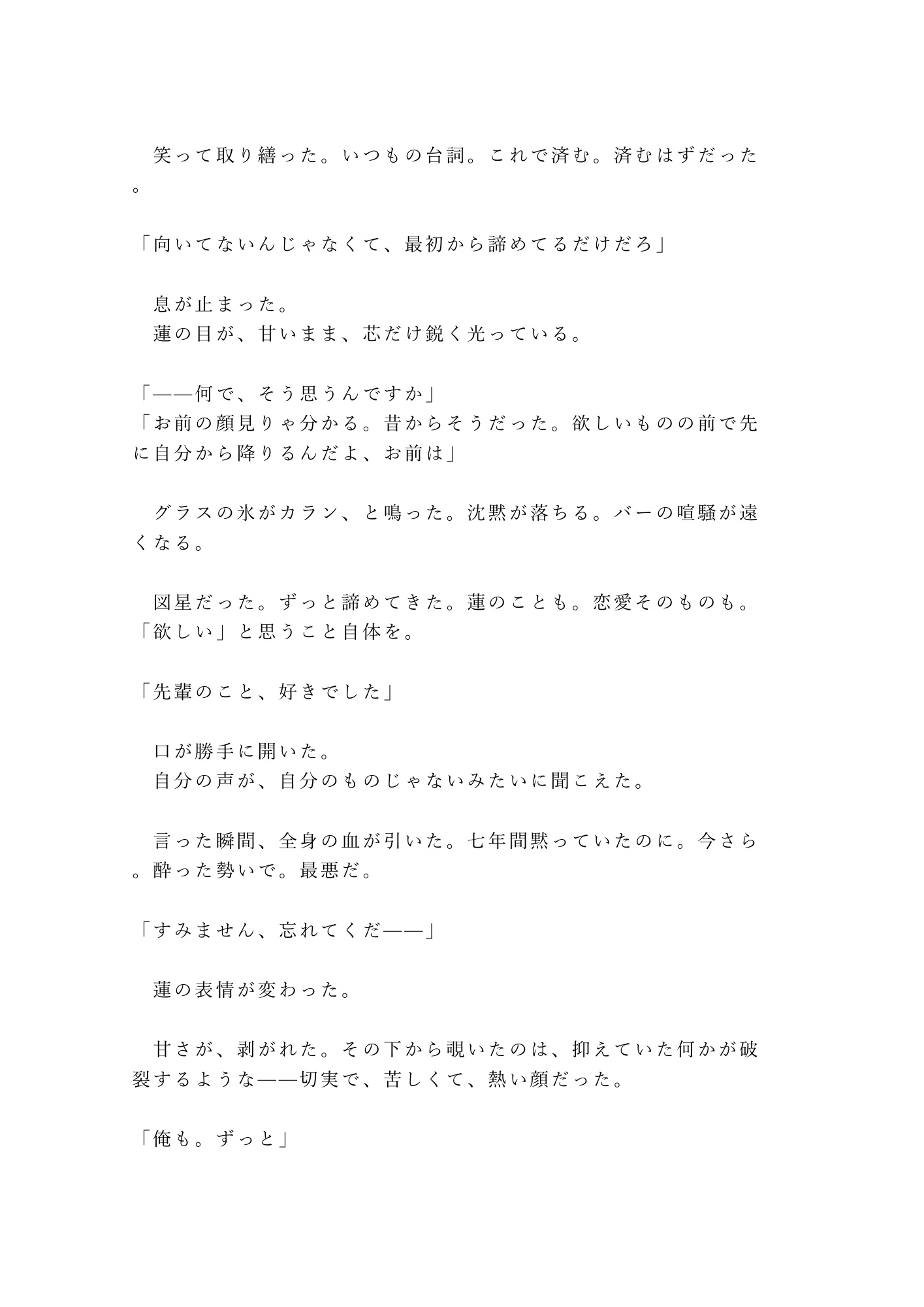 大学の文芸サークルで二つ上だった篠原蓮。甘い目元、石鹸の匂い、低い声——卒業してからも忘れられなかった人。でも「先輩が私を特別に見てくれたことなんて一度もない」と、とっくに諦めていた。