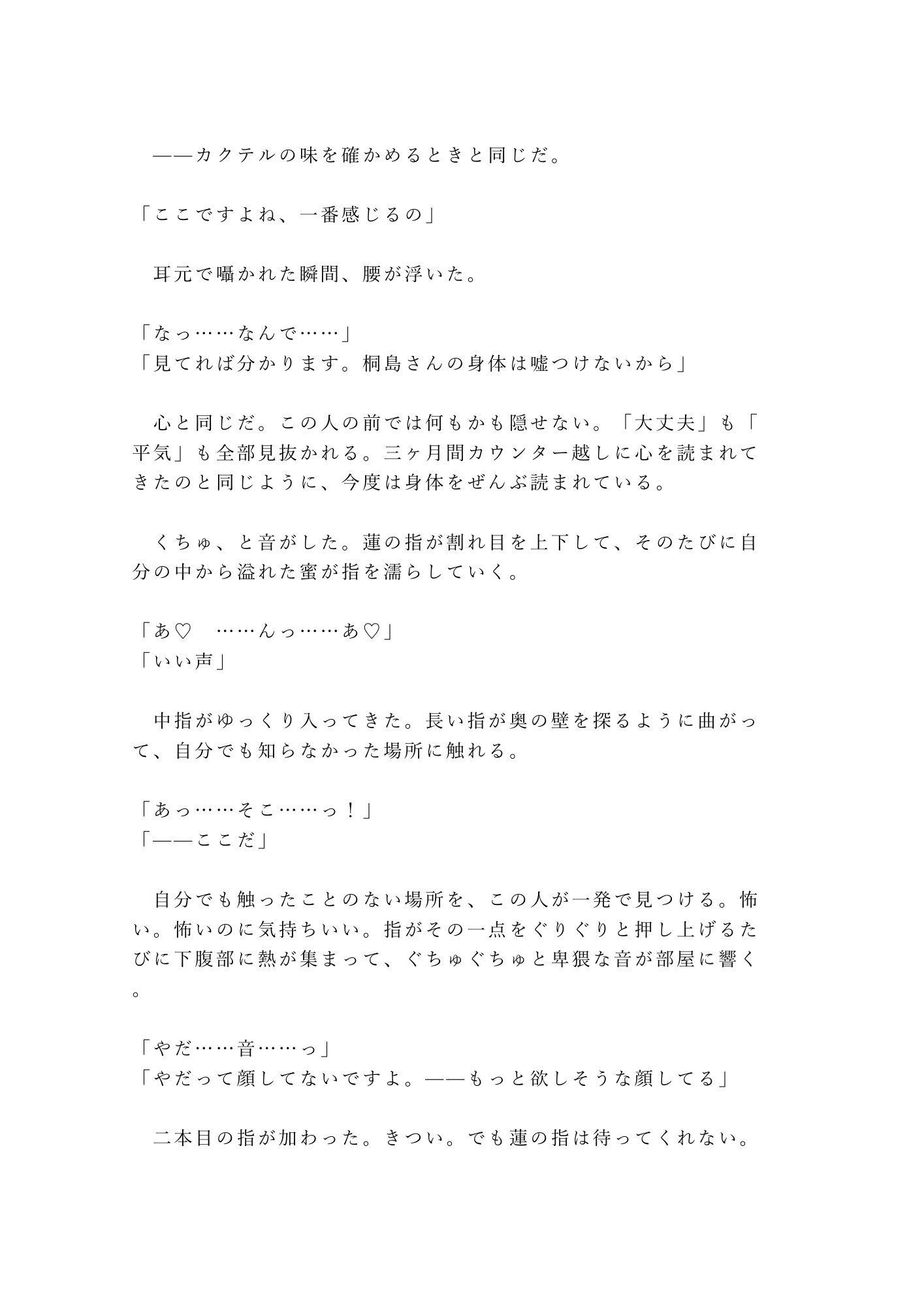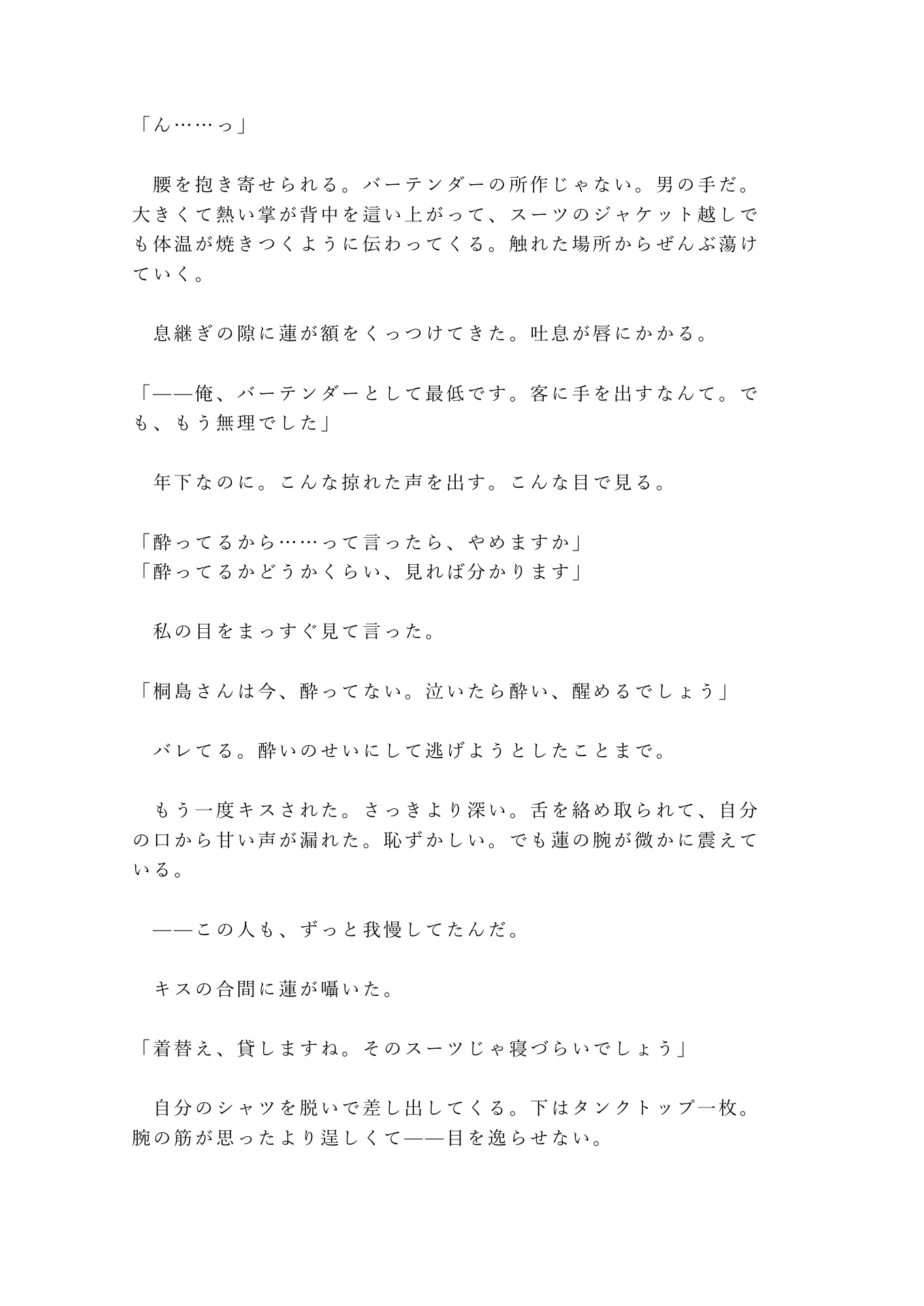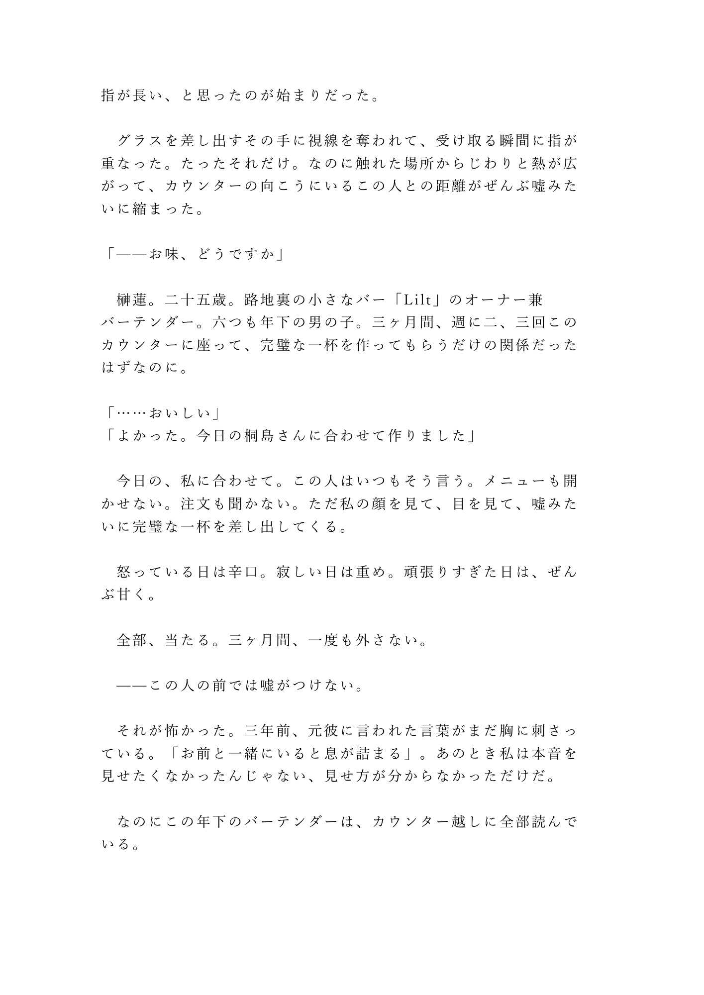 仕事終わりの隠れ家バー。年下バーテンダーの蓮は、注文を聞かずに私の心を読み当てる。怒りも寂しさも、嘘の「大丈夫」さえ全部見抜いて——あの夜、閉店後のカウンターで涙が止まらなくなった私に、彼は初めてカウンターの向こうから出てきた。「自分から来てくれるまで待つ」。そう言ったくせに、彼のシャツの匂いで眠れない夜、私は自分からベッドを抜け出してしまう。心も身体も、全部読まれて——朝まで、離してもらえなかった。