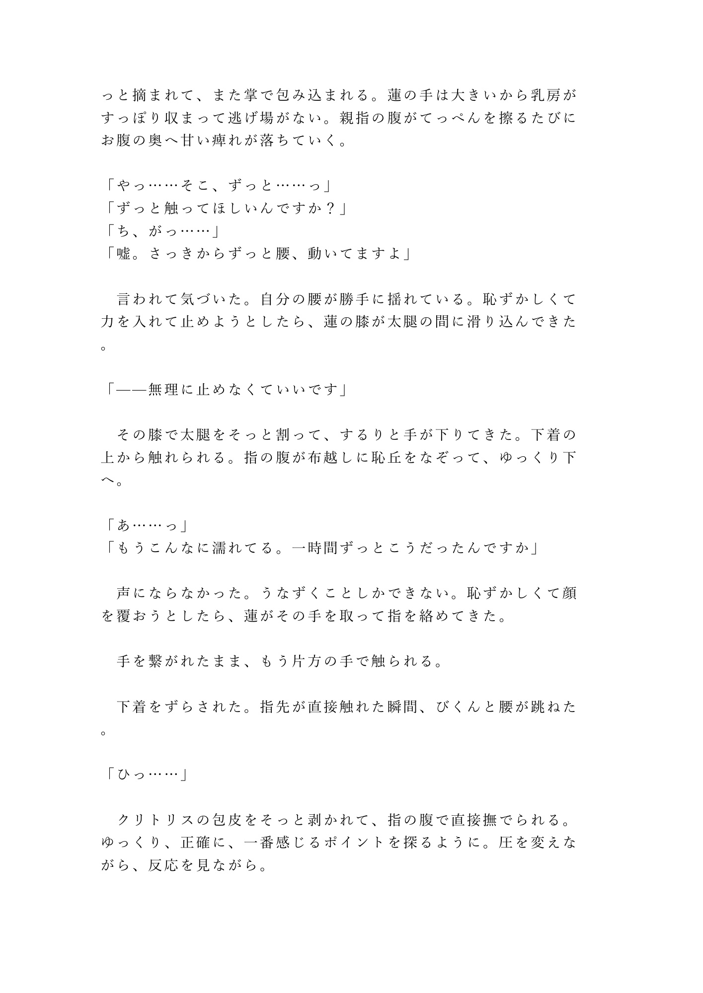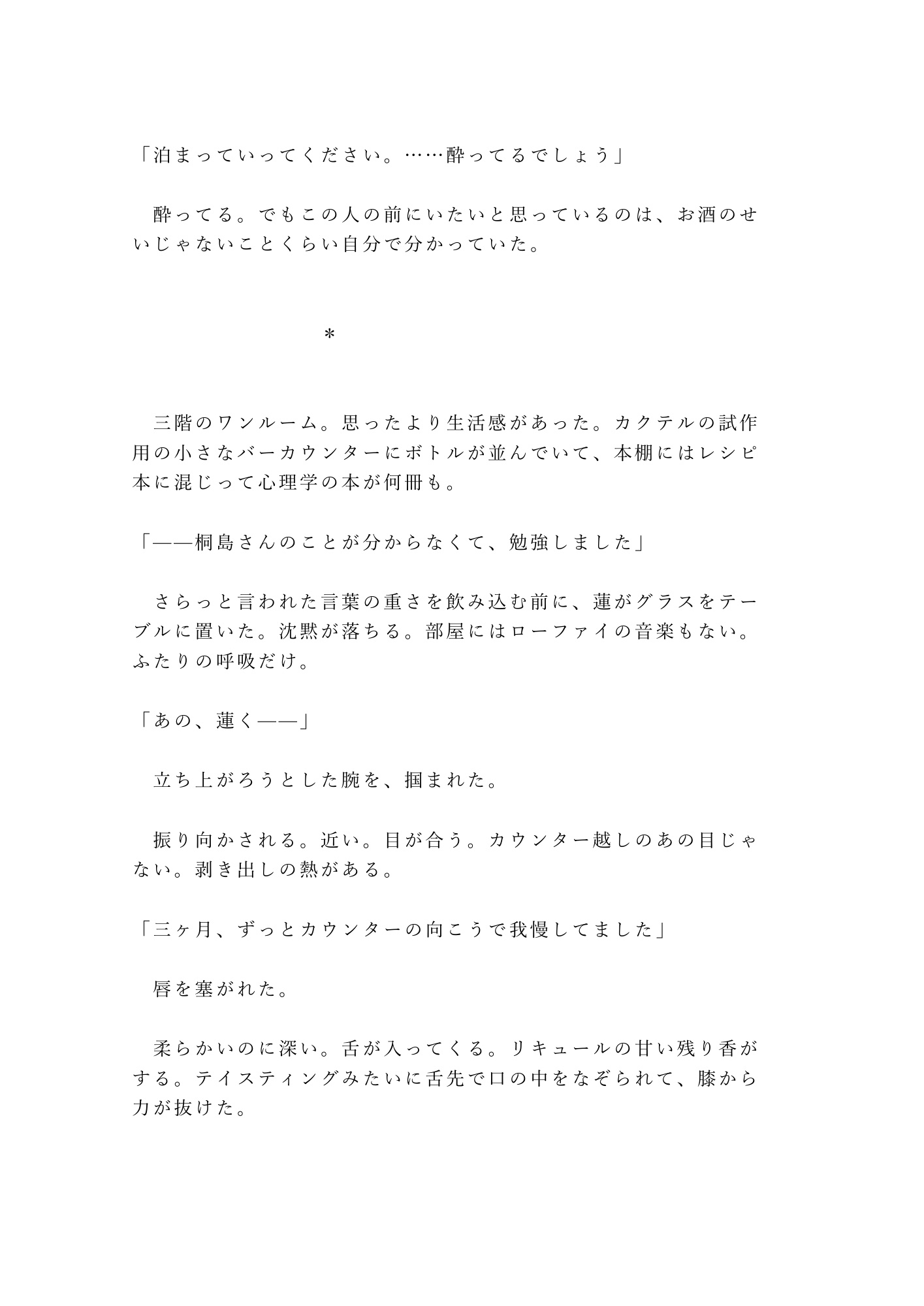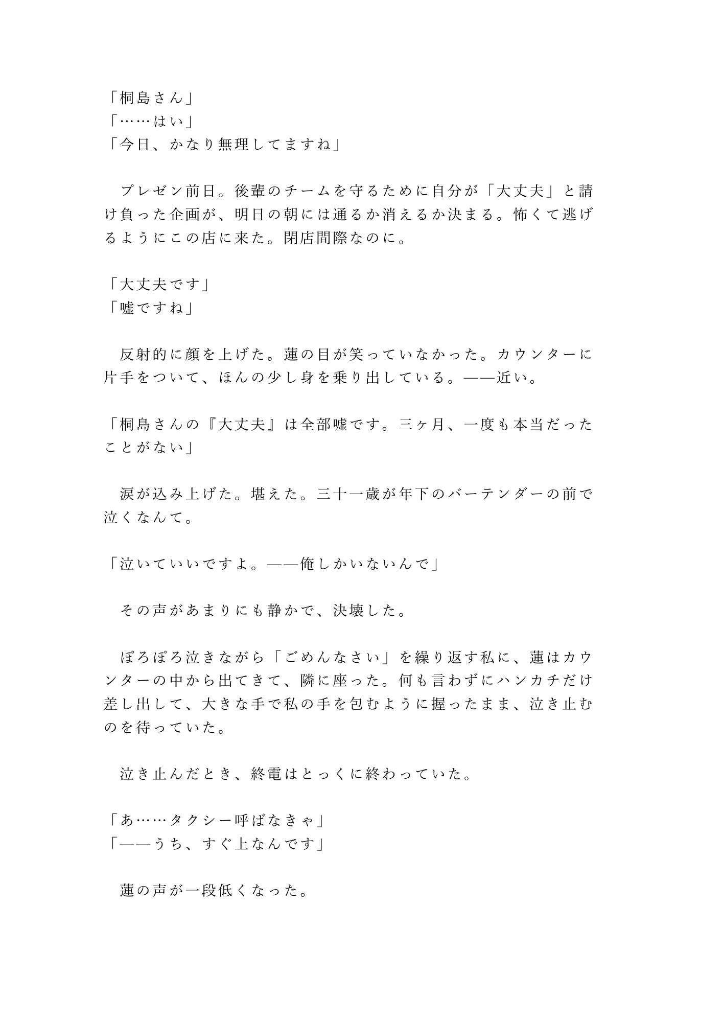 仕事終わりの隠れ家バー。年下バーテンダーの蓮は、注文を聞かずに私の心を読み当てる。怒りも寂しさも、嘘の「大丈夫」さえ全部見抜いて——あの夜、閉店後のカウンターで涙が止まらなくなった私に、彼は初めてカウンターの向こうから出てきた。「自分から来てくれるまで待つ」。そう言ったくせに、彼のシャツの匂いで眠れない夜、私は自分からベッドを抜け出してしまう。心も身体も、全部読まれて——朝まで、離してもらえなかった。