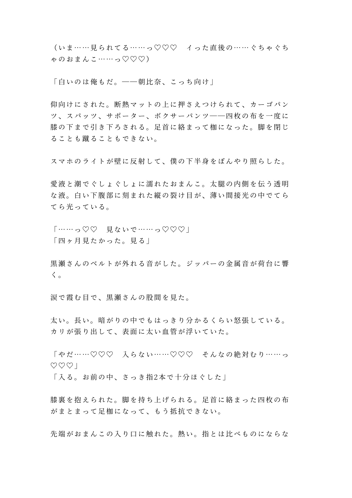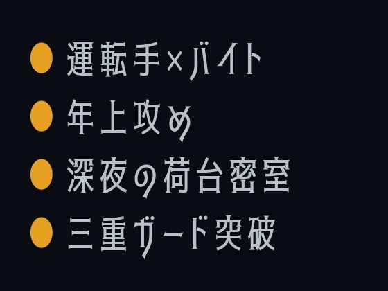 「お前の身体、好きだ」四ヶ月間の執着を告白しながらも、指を絡めて握る手は優しい。始発のエンジン音が聞こえるまで、荷台の中で壊され続けた一夜。仕分けラインに戻った朝、スマホに届いたメッセージ――「明後日も荷台空けとく」。ブロックは、しなかったBLカントボーイ官能小説。