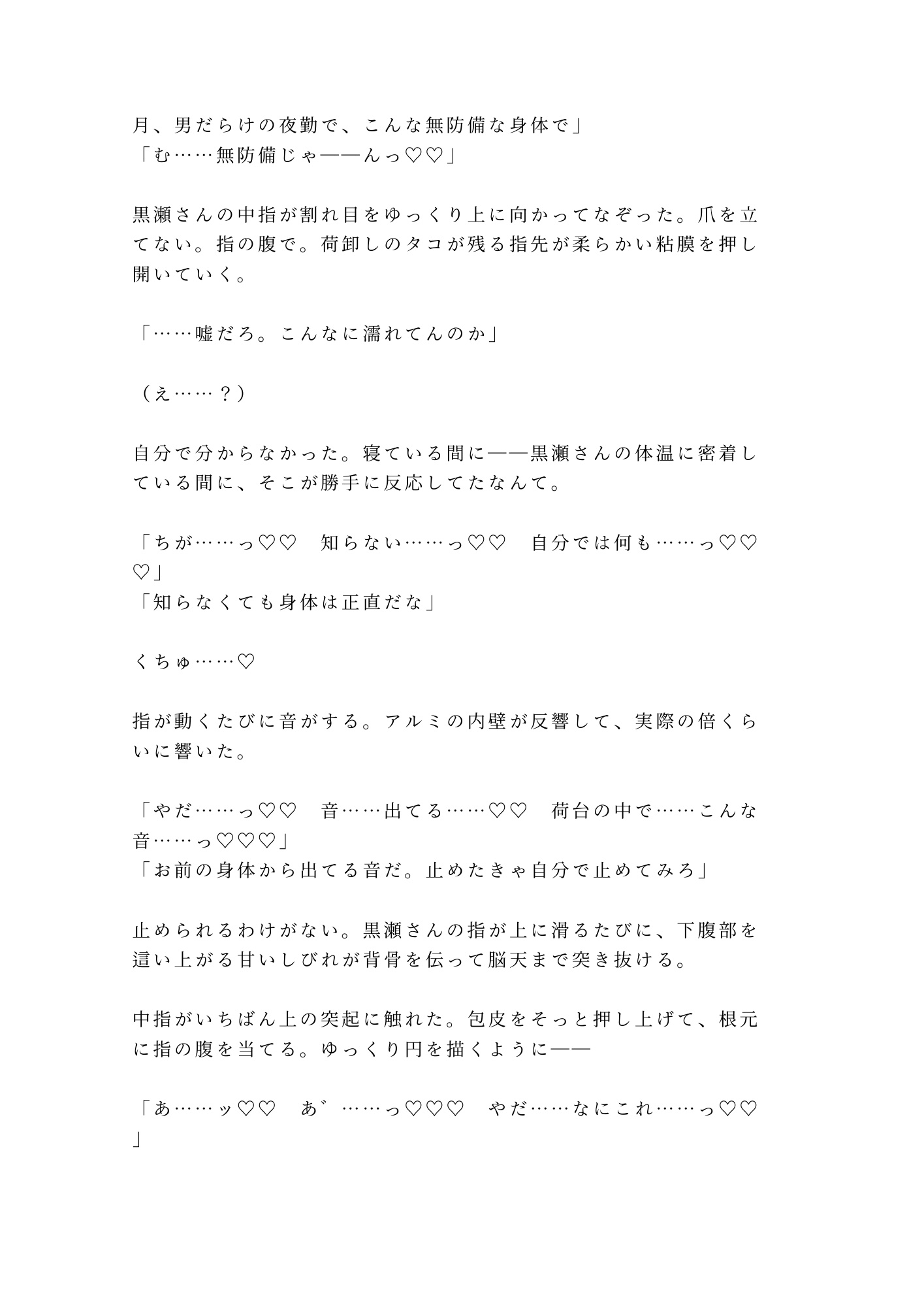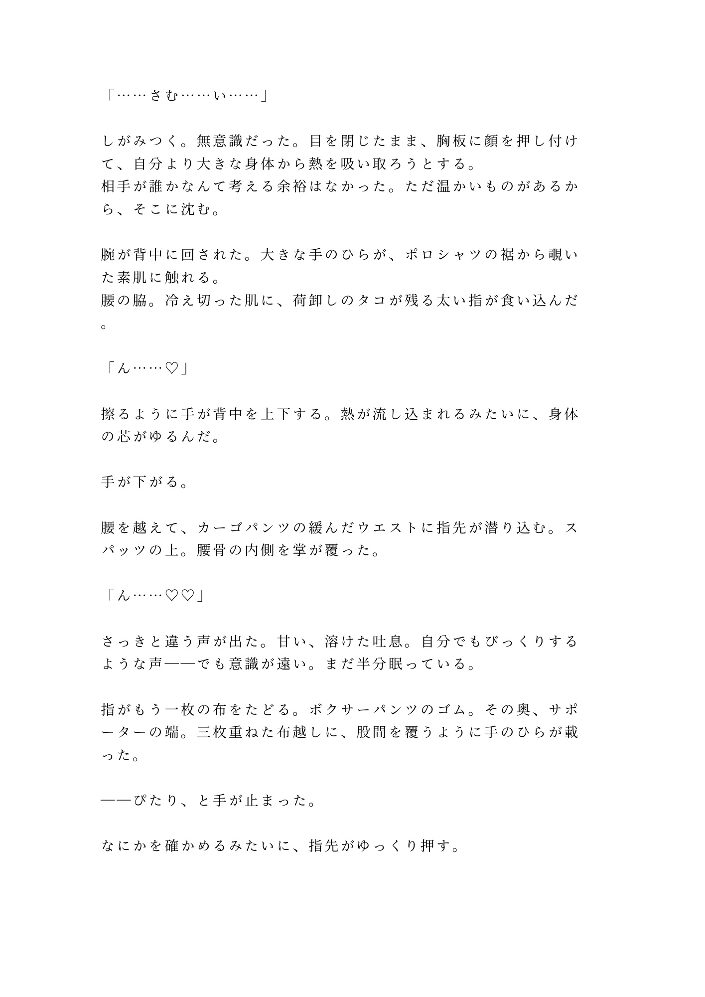 深夜3時、物流センターの荷台。シャッターの閉まった金属の箱の中で、仮眠を取っていた新人バイトの朝比奈は、寒さに耐えかねてベテランドライバー・黒瀬の胸板にしがみついた。半分眠ったまま熱を求めた身体が、背中を撫でる大きな手に溶けていく。