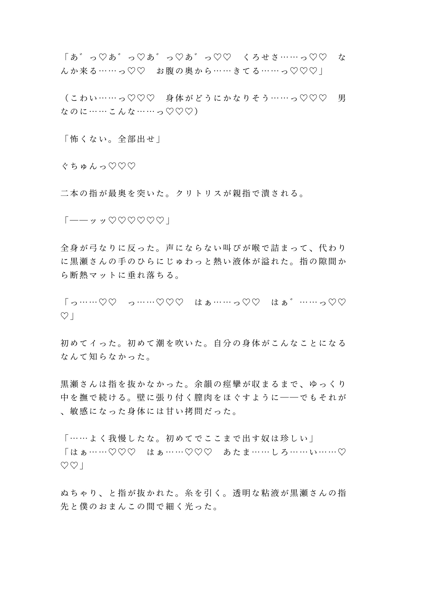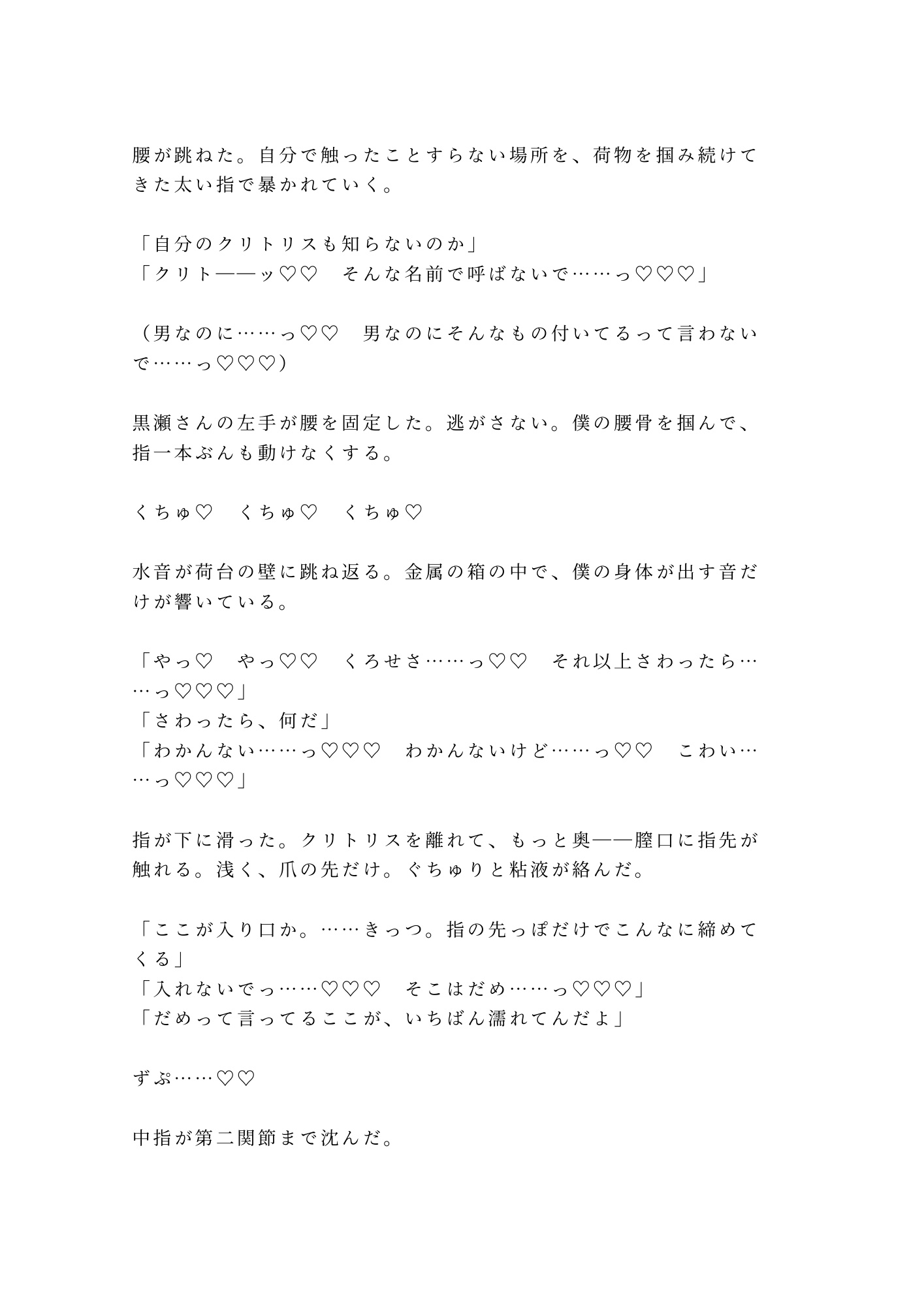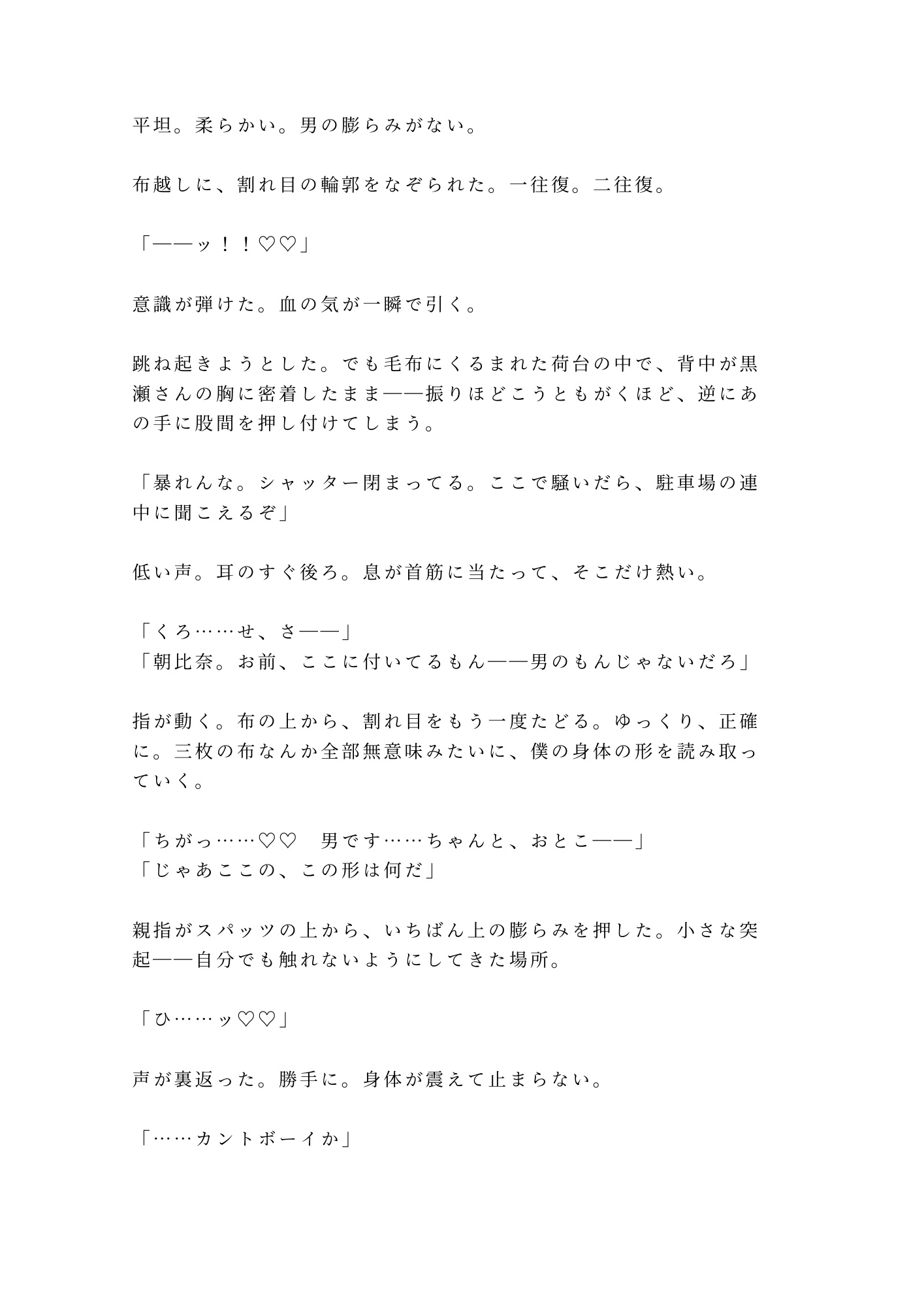 深夜の配送センター。仮眠中に寒さでベテランドライバー・黒瀬の胸にしがみついた瞬間、スパッツとサポーターとボクサーパンツの三重ガードの下を握られた。「カントボーイか」荷台のシャッターは閉まっている。始発のエンジン音が鳴るまで、触れたこともない身体の奥を暴かれ続ける。飴の甘い匂いがする指で。