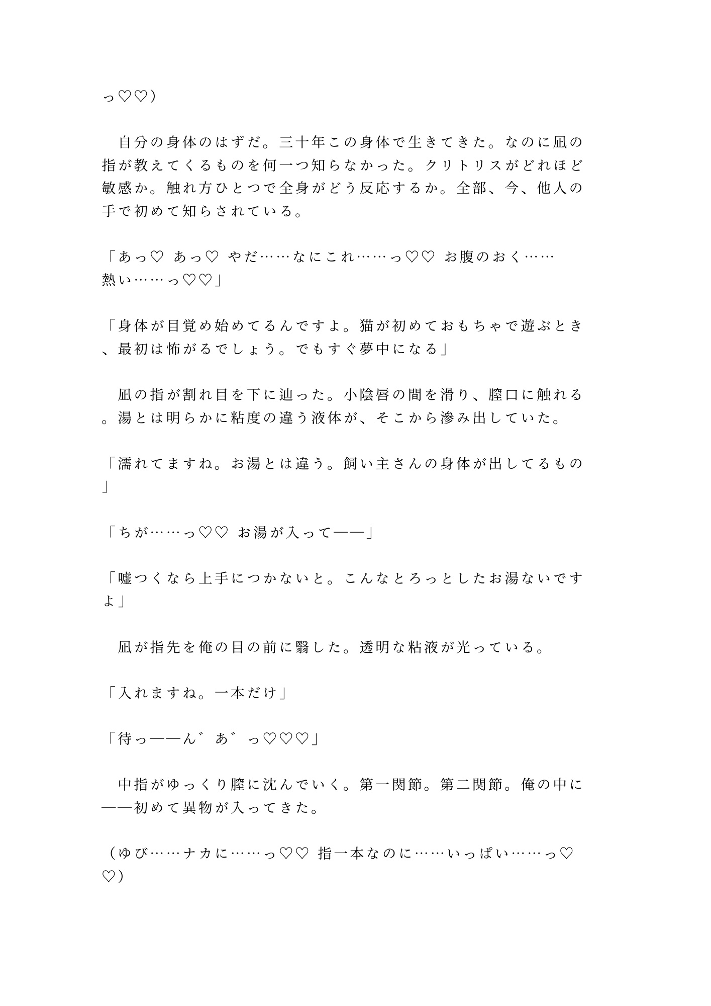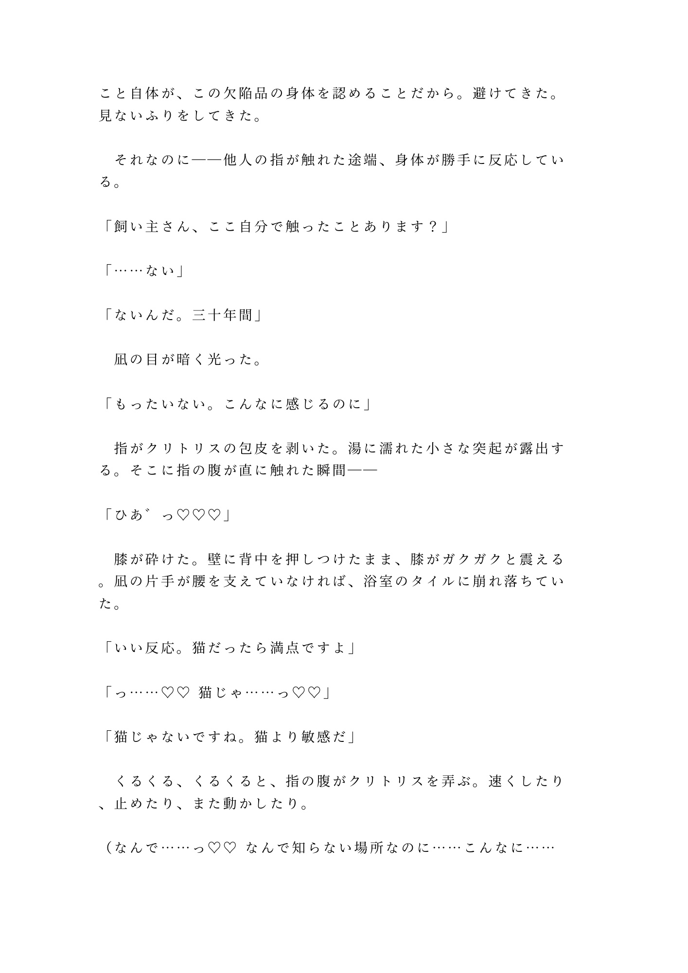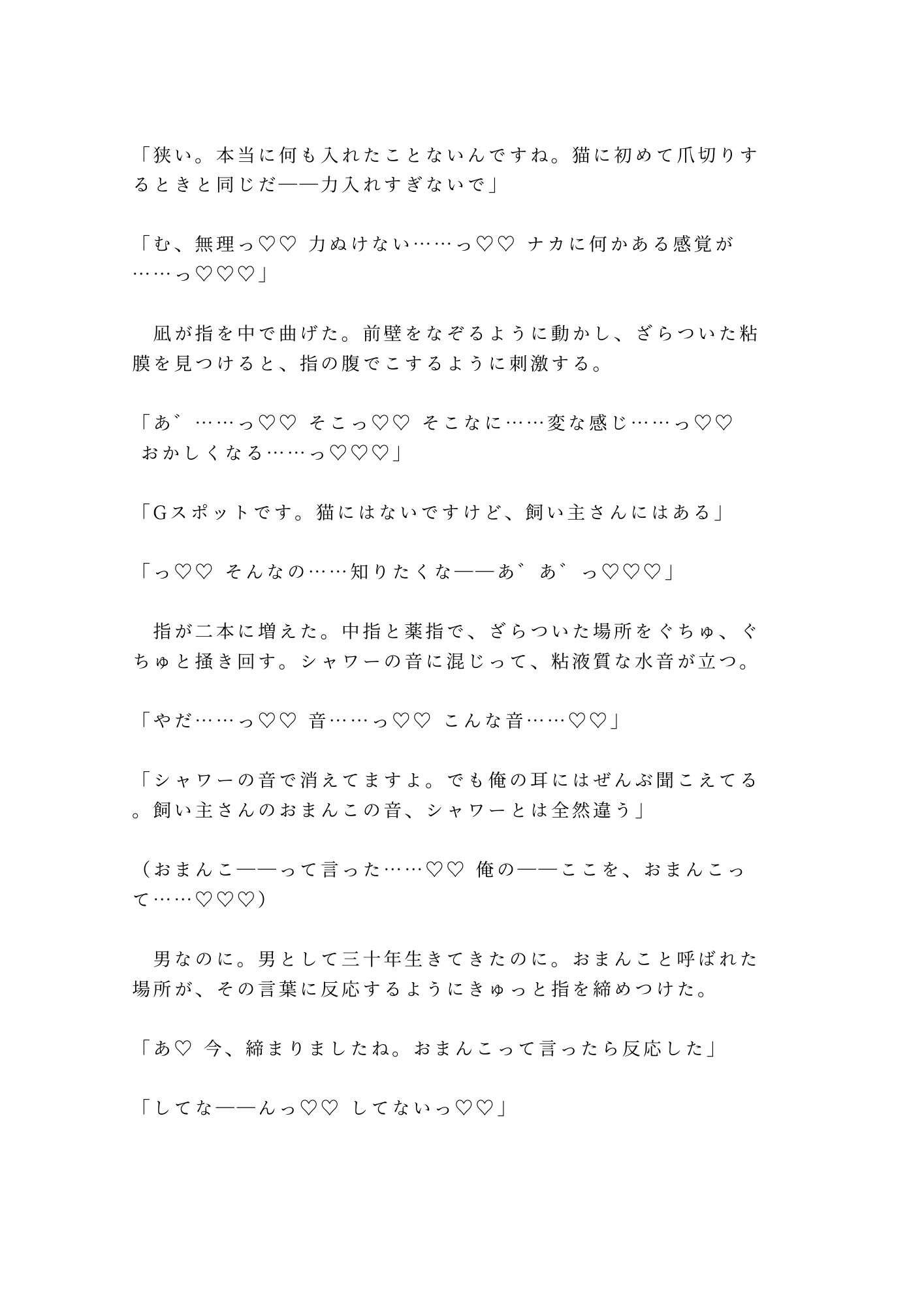 出張から帰ったら、ペットシッターがまだ寝室にいた。シャワー中にすりガラス越しの輪郭を見られ、「フロントに縫い目がない下着、畳んでましたよ」と浴室のドアを開けられる。猫を扱う手つきでカントを暴かれ、「猫の交尾って一日に何十回もするんですよ」と囁かれながら中出しされるBLカントボーイ官能小説。