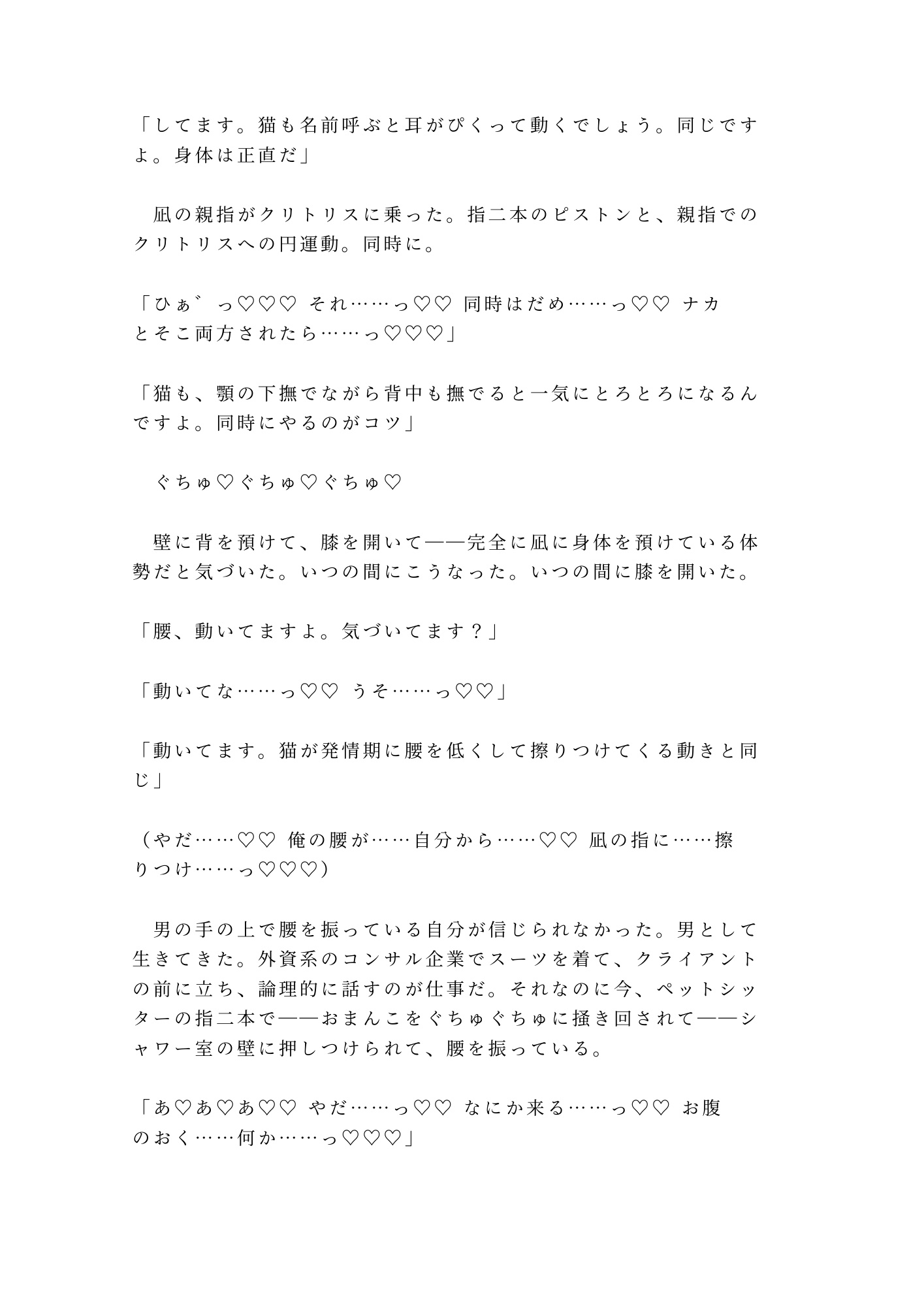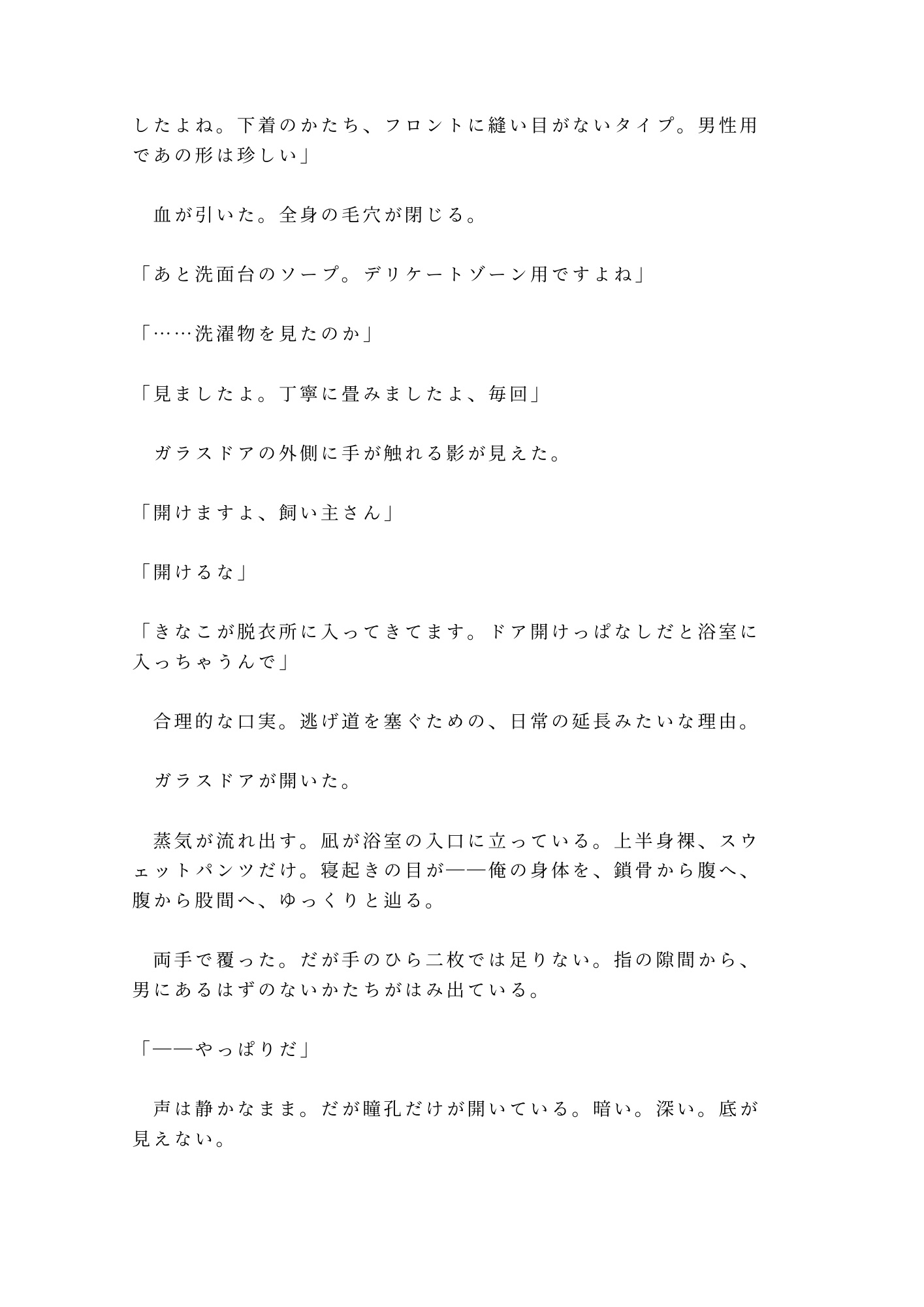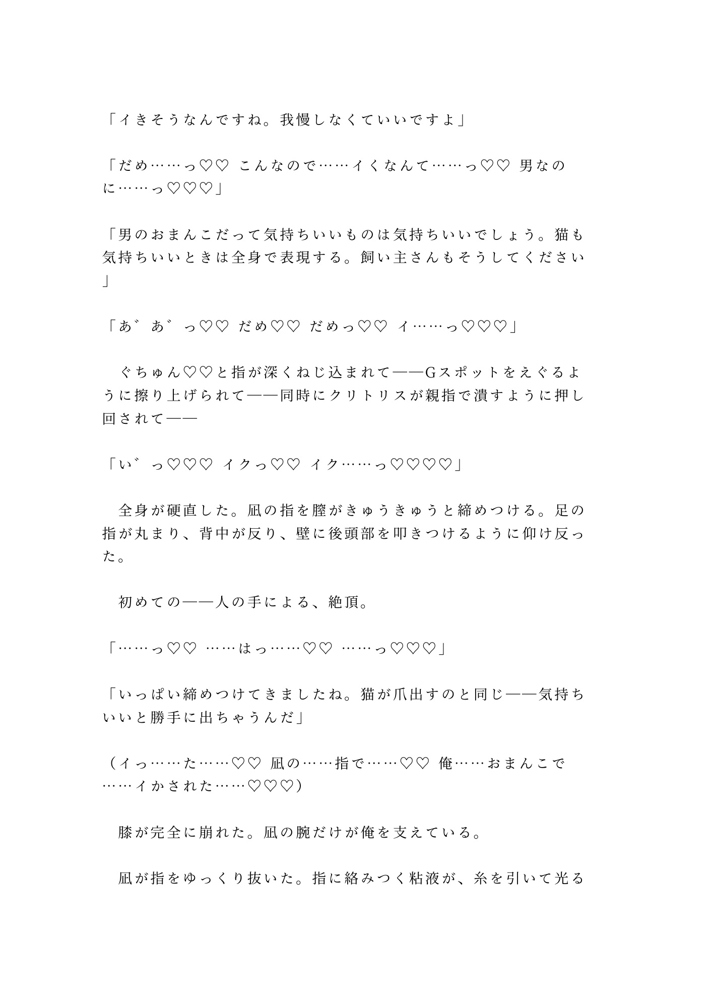 出張から帰ったら、ペットシッターがまだ寝室にいた。シャワー中にすりガラス越しの輪郭を見られ、「フロントに縫い目がない下着、畳んでましたよ」と浴室のドアを開けられる。猫を扱う手つきでカントを暴かれ、「猫の交尾って一日に何十回もするんですよ」と囁かれながら中出しされるBLカントボーイ官能小説。