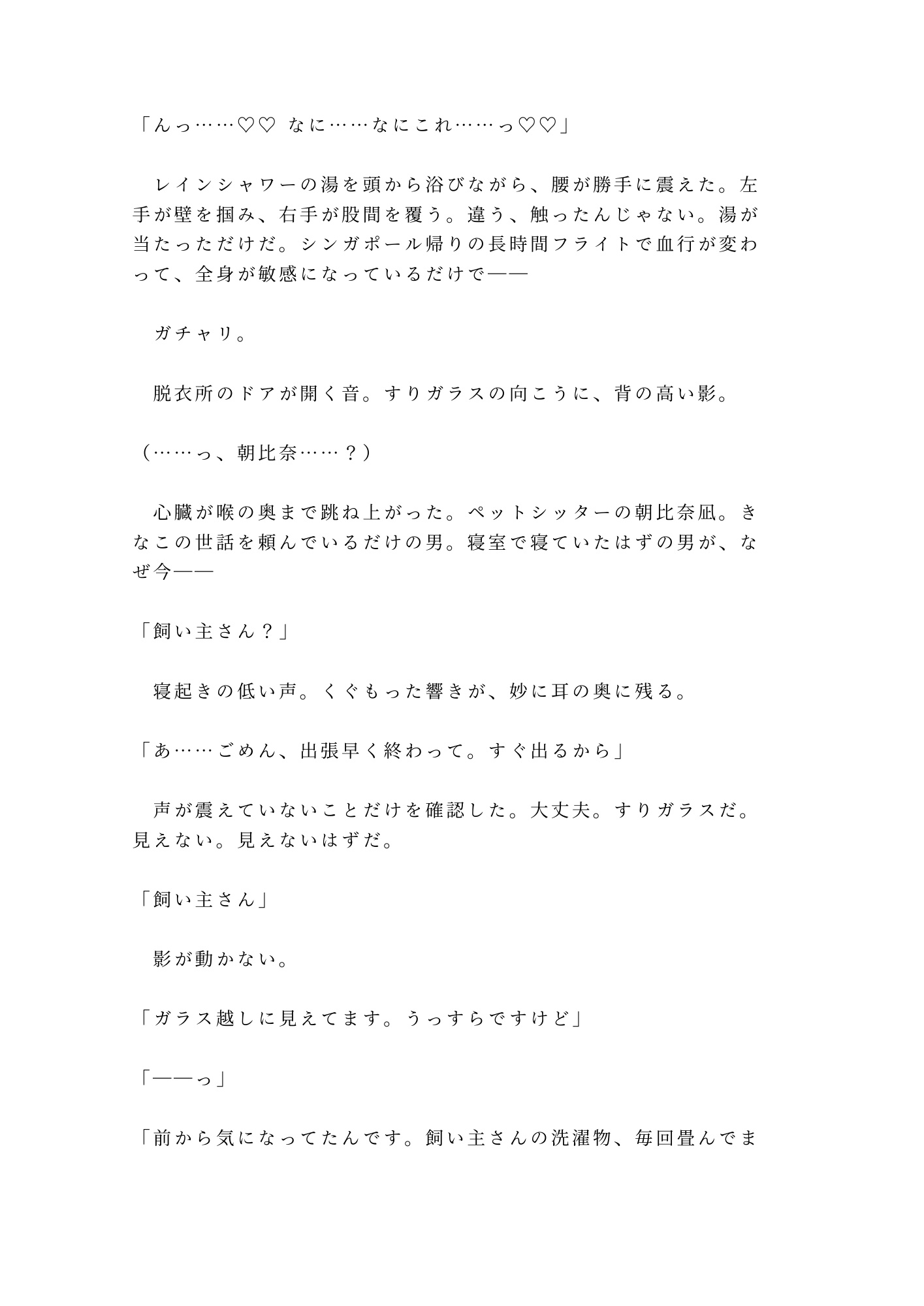 外資系コンサルの三十歳。出張中の愛猫・きなこの世話を、ペットシッターの朝比奈凪に任せている。合鍵を渡し、Googleカレンダーを共有し、寝室のベッドで凪が寝泊まりする契約。出張から早めに帰宅した夜、シャワーを浴びていた俺の前に、凪が現れた。