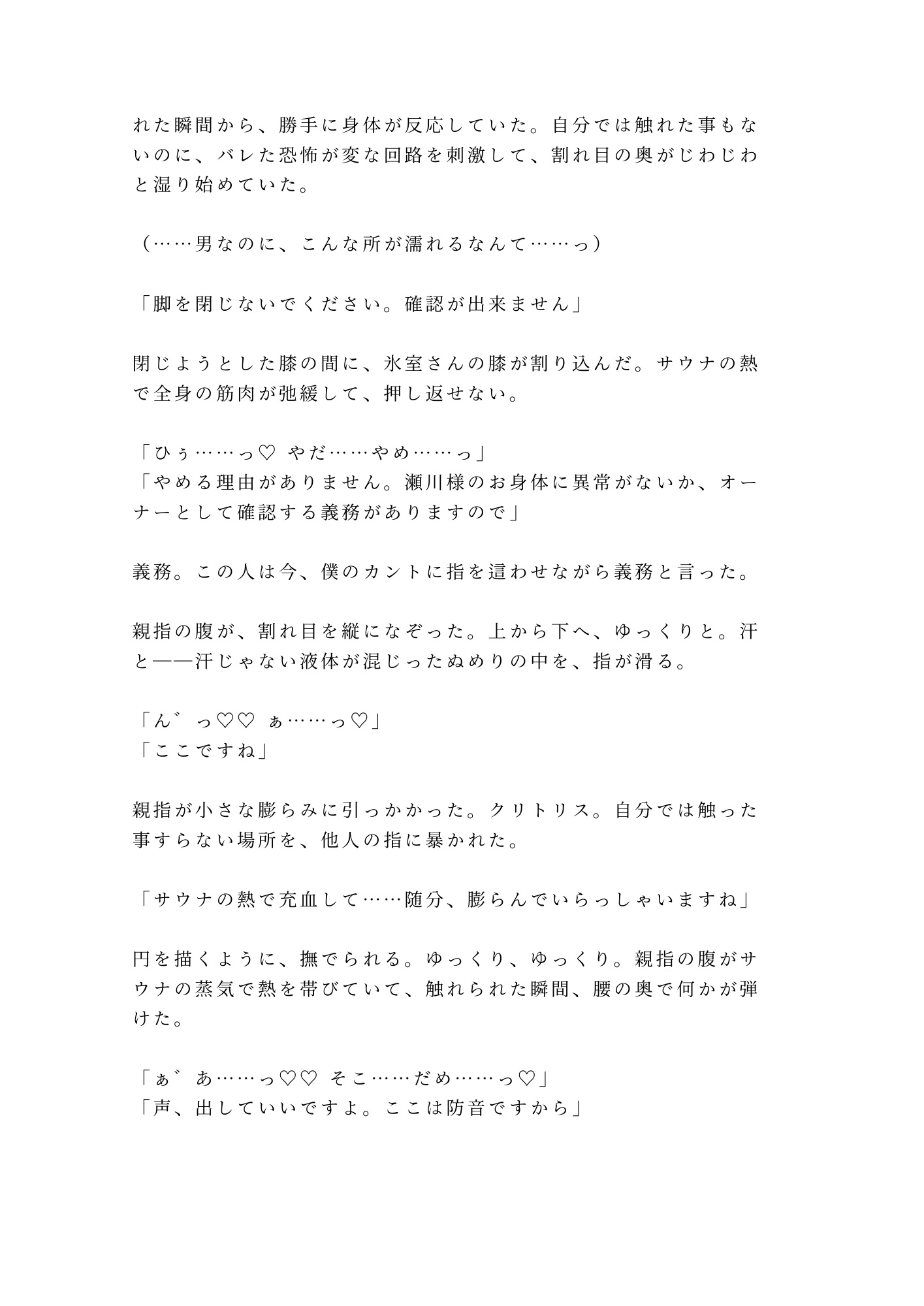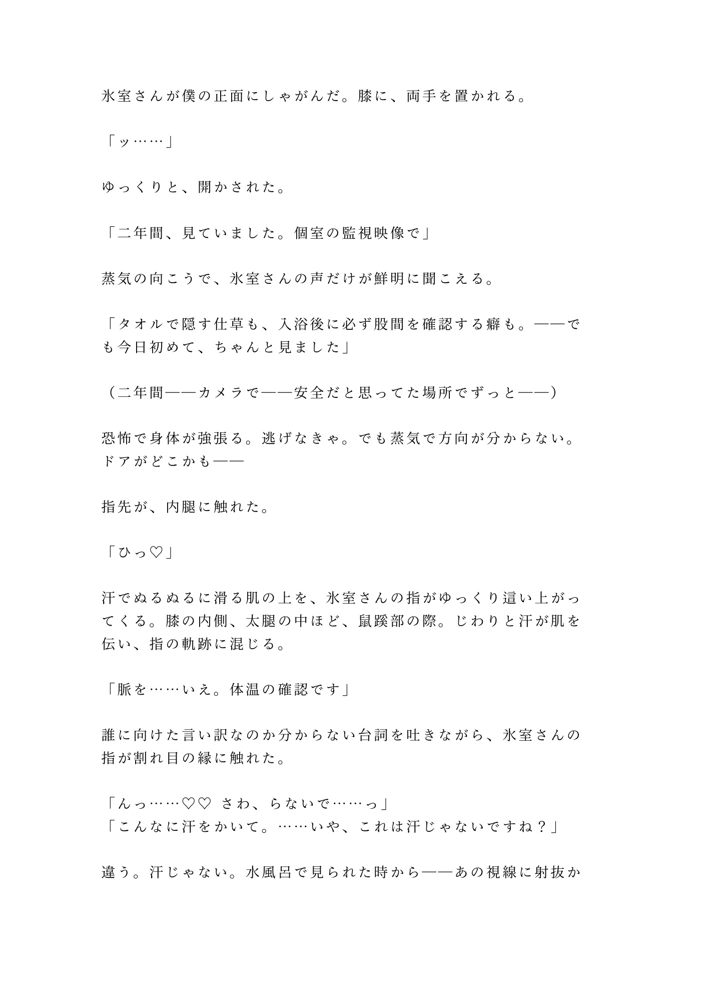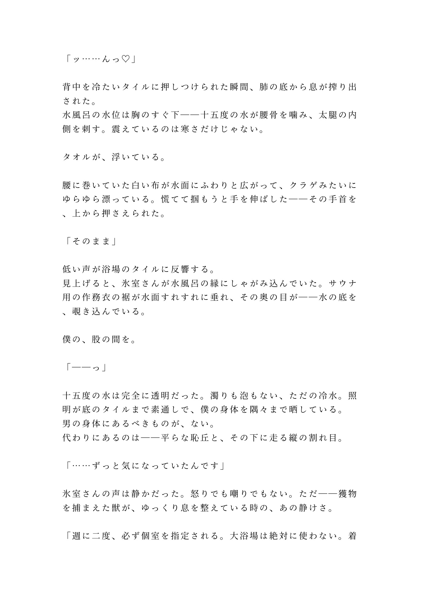 二年間、個室サウナだけを使い続けた常連客。その夜に限って個室は全室メンテナンス中だと告げられた。仕方なく入った大浴場の水風呂で、タオルが浮いた。透明な冷水の底に晒されたカントを、オーナーの氷室が覗き込んでいる。「見えていますよ、瀬川様」――全て仕組まれていた夜に、サウナで蒸され水風呂で締められ犯されるBLカントボーイ官能小説。